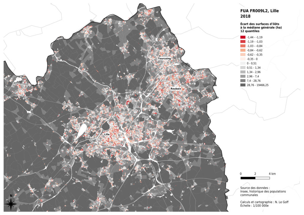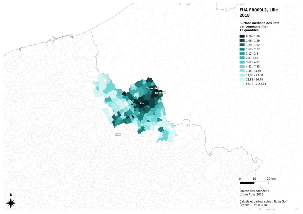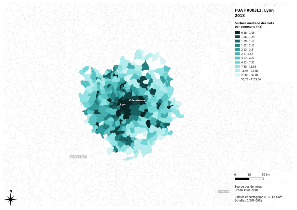 On a donc deux tendances générales. D’une part, les îlots sont souvent plus petits dans les centre urbains et plus grands dans leur périphérie éloignées. D’autre part, une certaine hétérogénéité des tailles d’îlot est très fréquentes dans les centres urbains et leur proche périphérie (la commune de Lyon est à cet égard une exception). Entre les deux, on trouve des territoires intermédiaires qui ont, plus souvent que les autres, des îlots dont la surface est proche de la valeur médiane des quatre agglomérations concernées. Par conséquent, on ne peut pas baser les analyses de ces tissus urbains intermédiaires sur la recherche de régularités homogènes : il convient de prendre en compte l’hétérogénéité des surfaces d’îlots pour ce type de territoire.
