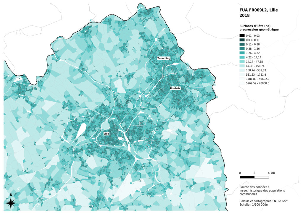 L’analyse de la distribution des données montre que celle-ci n’est pas la même selon les métropoles concernées. La présence de massifs montagneux à proximité de Marseille a des effets sur les surfaces des îlots inclus dans la métropole : certains îlots sont très grands, par comparaison avec les autres cas. La région de Lille présente aussi des îlots ruraux globalement plus petits, probablement du fait de l’histoire de l’occupation du sol à des fins agricoles. Nous avons donc choisi de diminuer les contrastes entre les valeurs claires de notre dégradé de couleurs pour permettre une comparaison visuelle entre les 4 cas analysés.
