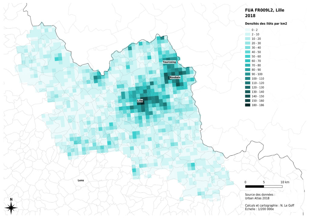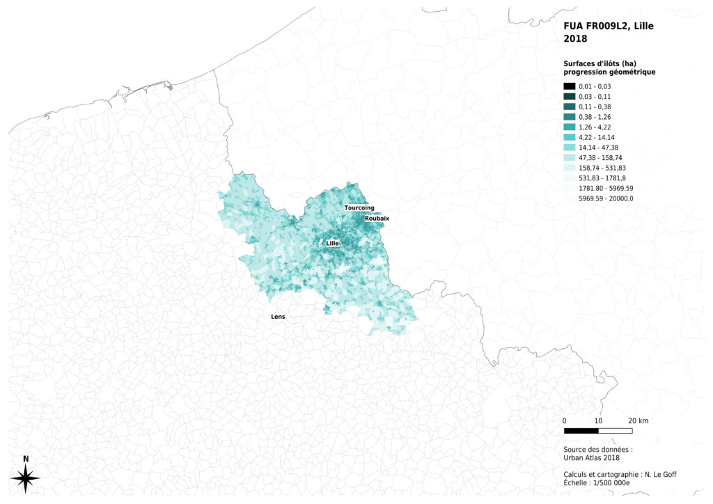 Les données de l’Urban Atlas ont été traitées pour en extraire des îlots comparables, qui ne correspondent pas exactement à des îlots cadastraux. Pour constituer les îlots à comparer, les zones occupées par la voirie, les infrastructures ferroviaires et l’hydrographie ont été retirées. Les autres occupations du sol ont été regroupées pour former les îlots. Cette approche permet de comparer les îlots des métropoles de Lille, Paris, Lyon et Marseille sur une même base. Elle assure aussi la possibilité d’étendre la comparaison à d’autres métropoles européennes. Sa limite est son manque de précision à l’échelle locale, puisque la photo-interprétation comporte une part d’imprécision concernant les mesures de l’espace matériel. Par ailleurs, les îlots ainsi obtenus ne fournissent aucune indication sur le statut juridique de l’espace considéré. En effet, l’interprétation visuelle à partir d’une image satellite ne permet pas toujours d’identifier les limites cadastrales juridiques, qui peuvent être différentes des limites physiques perceptibles à l’œil.