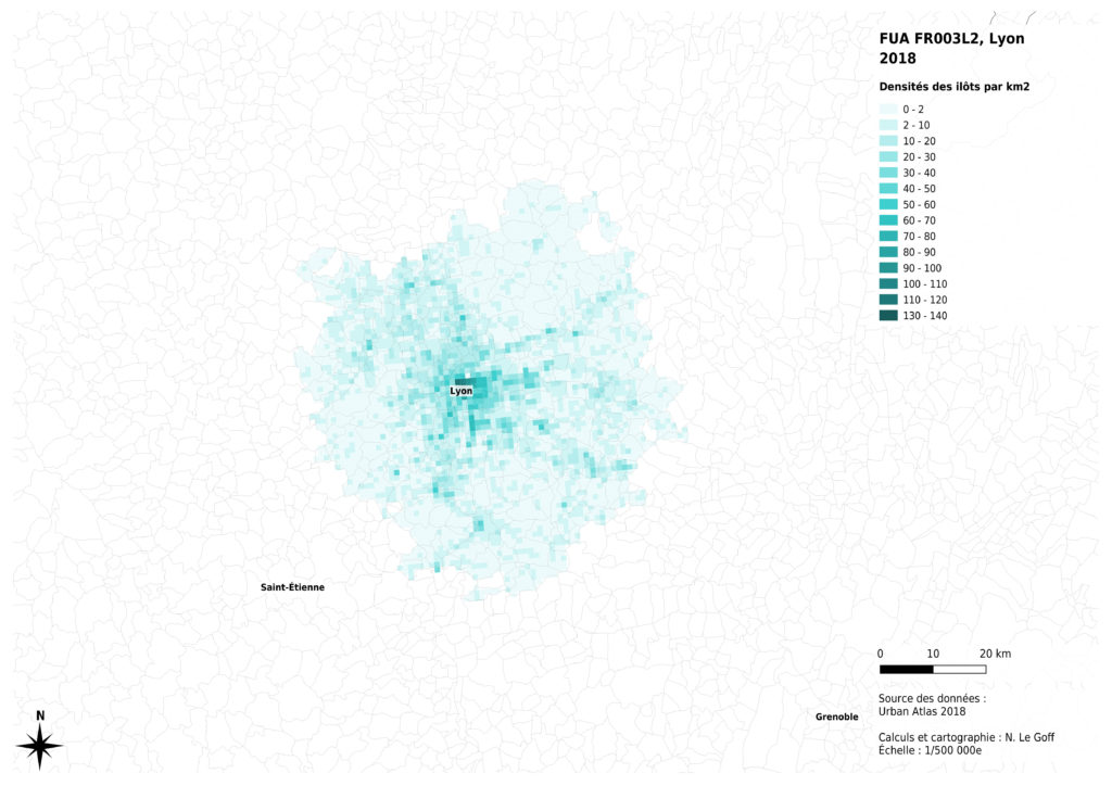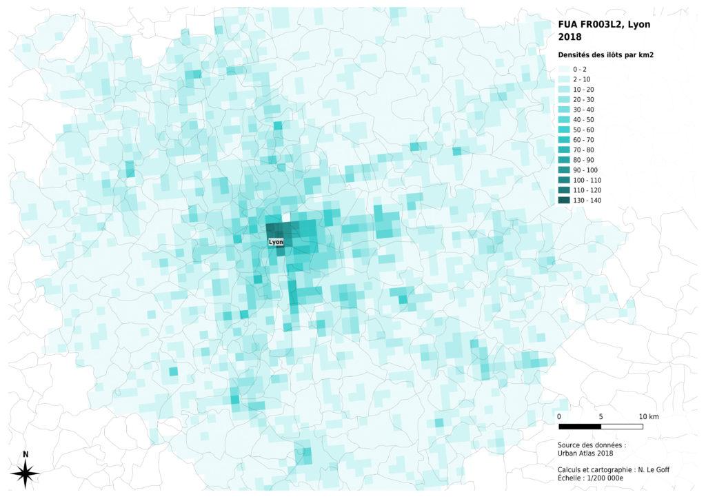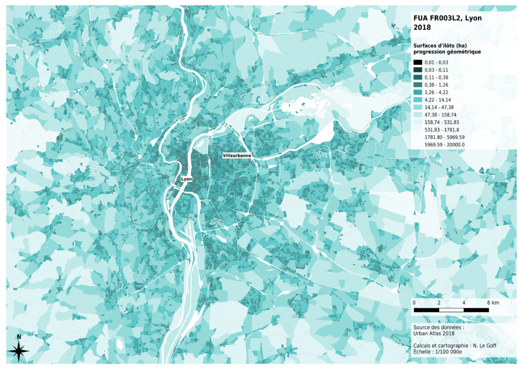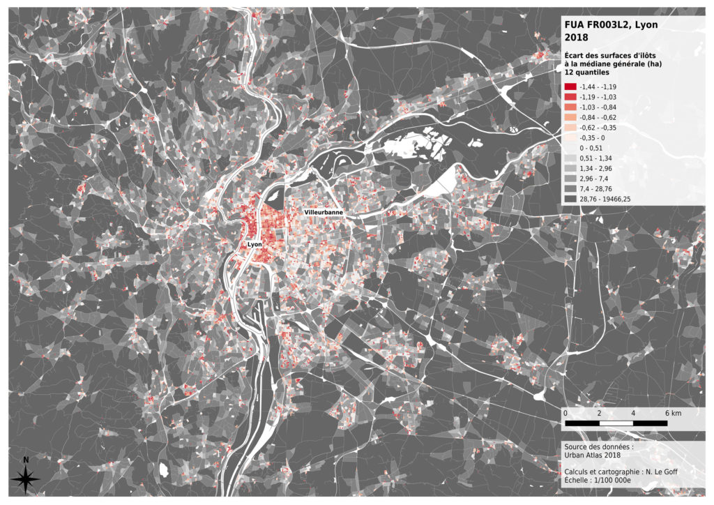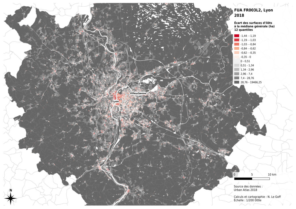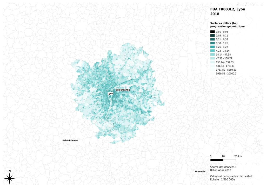 Même si les ordres de grandeur sont différents, l’agglomération de Lyon présente une distribution de ses îlots assez comparable à celle de Paris.