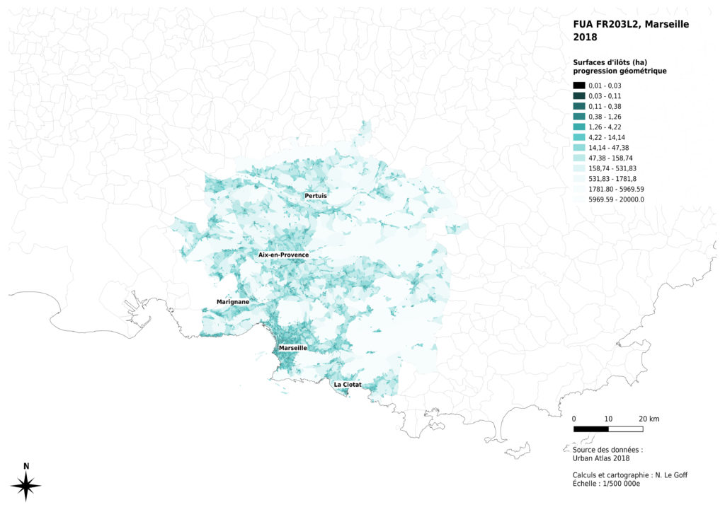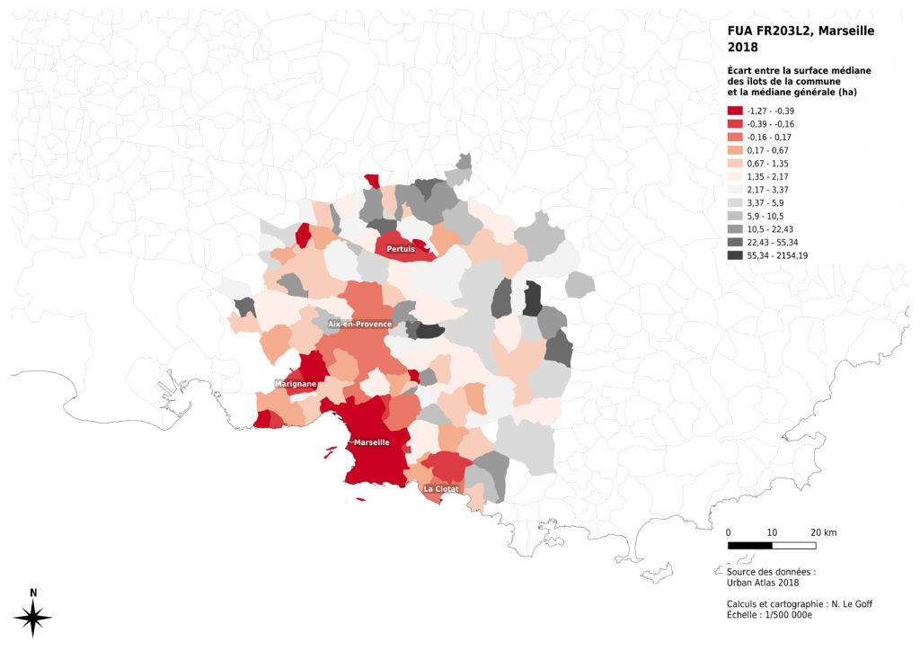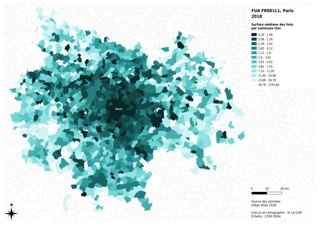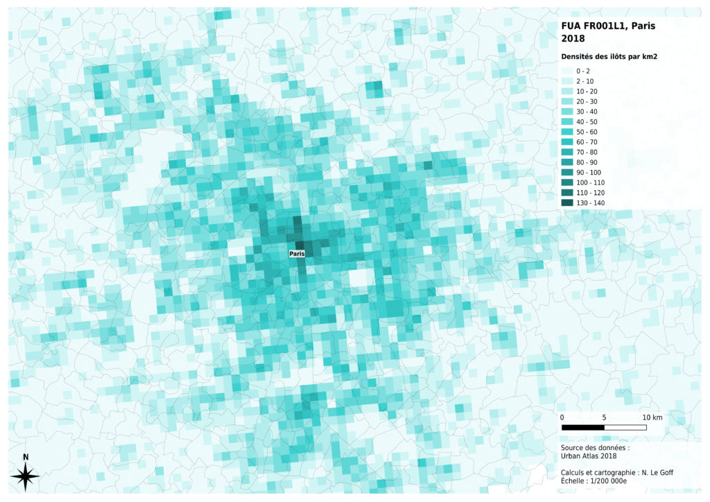 L’intérêt de cette approche, c’est qu’elle permet notamment de calculer la densité parcellaire par îlot, ce qui est impossible avec l’Urban Atlas. Si la possibilité de comparaisons européennes est ici limitée, on gagne en précision sur les caractéristiques des tissus urbains français analysés.