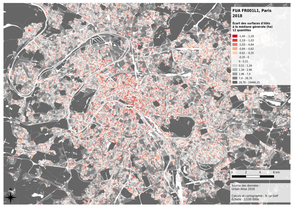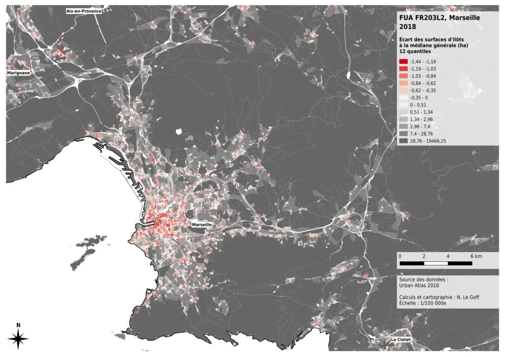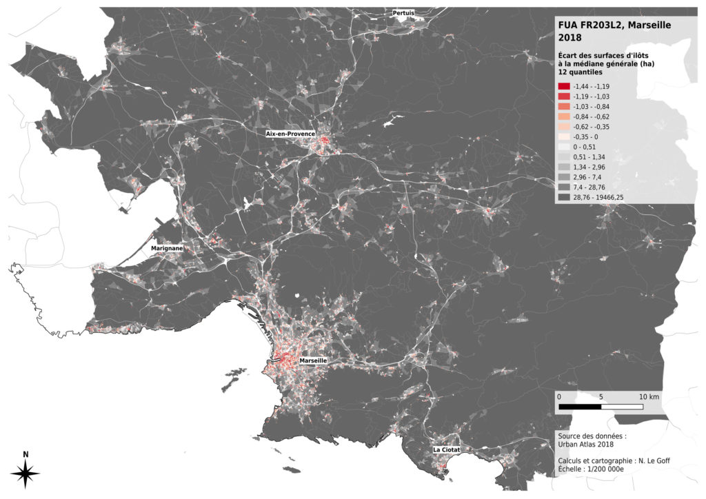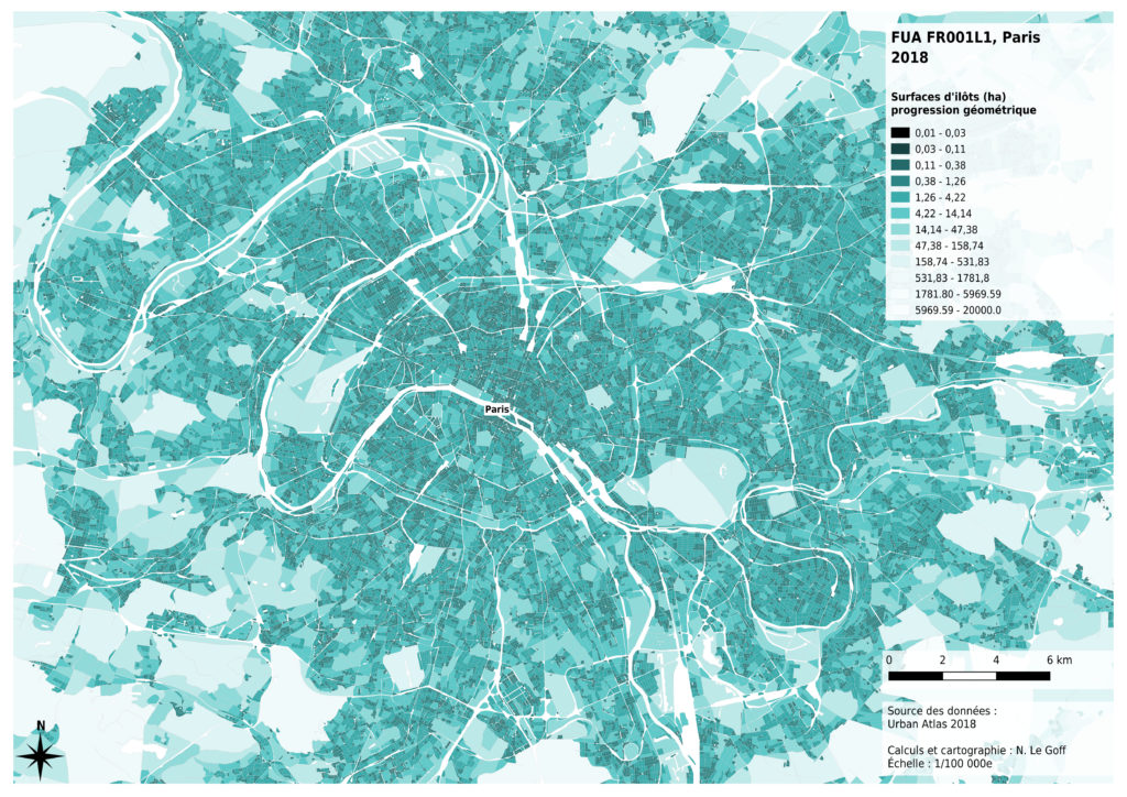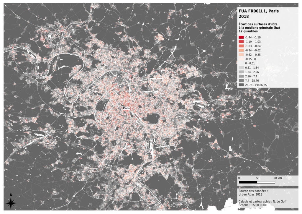 L’intérêt de cette approche, c’est qu’elle permet notamment de calculer la densité parcellaire par îlot, ce qui est impossible avec l’Urban Atlas. Si la possibilité de comparaisons européennes est ici limitée, on gagne en précision sur les caractéristiques des tissus urbains français analysés.