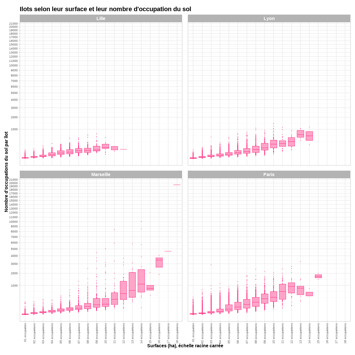 Par contre, la comparaison des 1er et 3e quartile, ainsi que de la médiane, rend, là encore mieux compte des tendances les plus significatives des aires urbaines analysées. La représentation en boites à moustache sur une échelle basée sur la racine carrée rend plus lisible les différences observées.