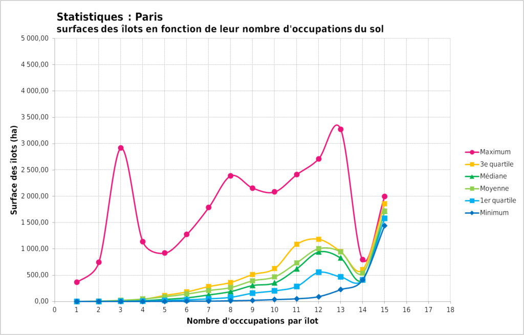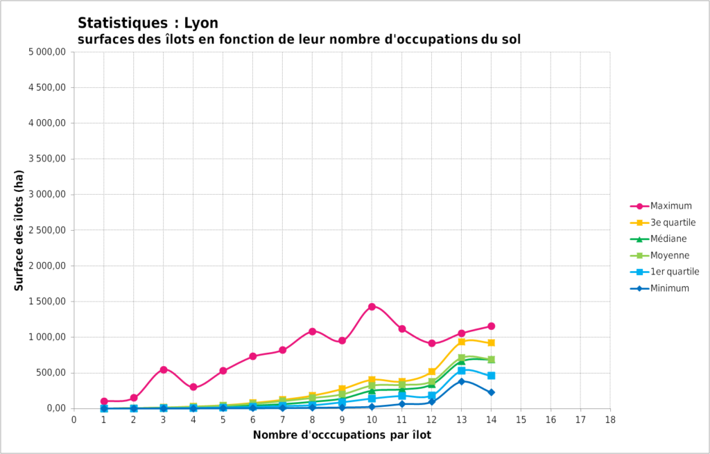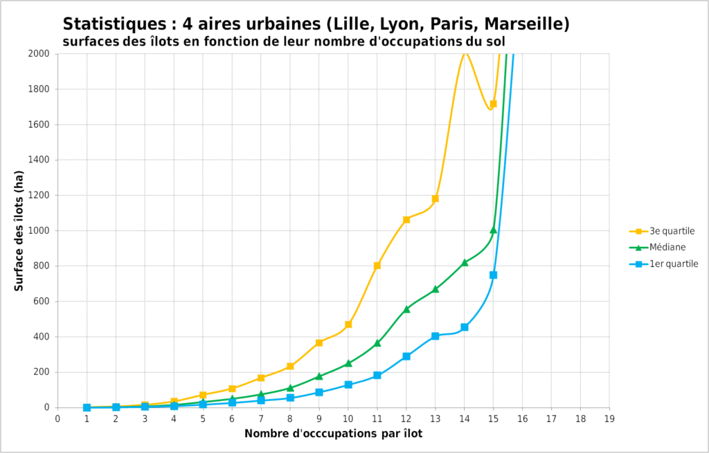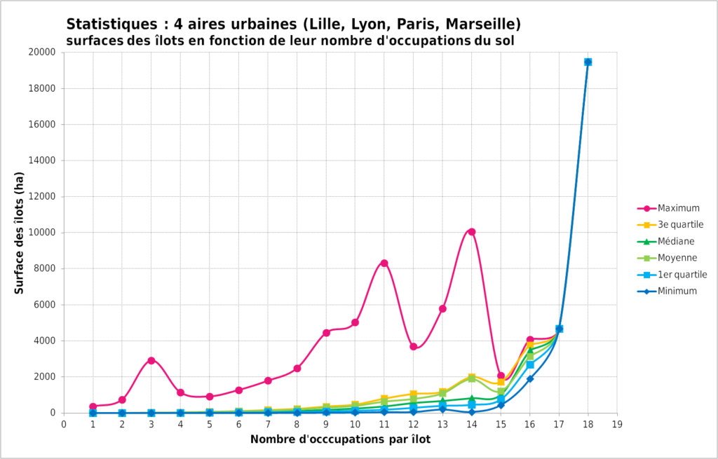 Ainsi, la surface maximale des îlots dans une métropole ne correspond pas systématiquement au plus grand nombre d’occupations du sol (Paris : 13/15, Lyon : 10/14, Lille : 9 /12, Marseille : 18/18). Ce phénomène est en partie lié à la distribution des surfaces d’îlots à l’intérieur de chaque aire urbaine.