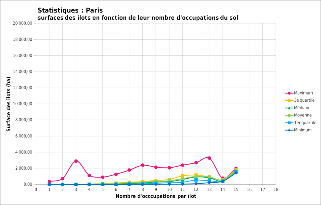 La plage des surfaces d’îlots tend à s’agrandir avec le nombre d’occupations du sol, même si ce n’est pas systématique. La surface minimum et maximum des îlots selon le nombre d’occupations sur leur sol également. Mais ces seuils sont soumis à l’existence de valeurs particulières, peu significatives. La surface maximale notamment varie très fortement. Cette situation induit des variations dans la moyenne qui la rend peu significative. La surface minimale paraît plus pertinente, car elle subit beaucoup moins de variations.