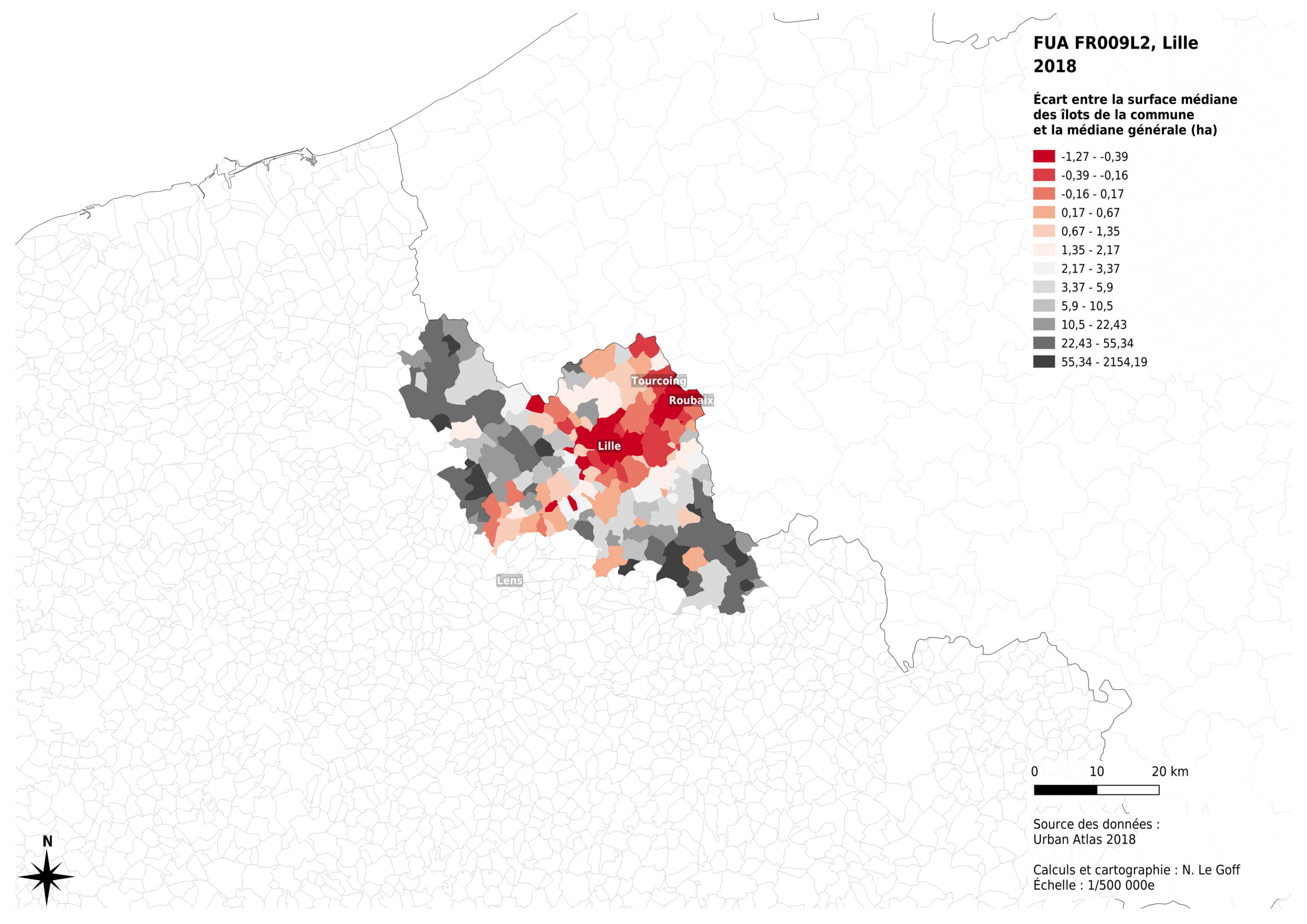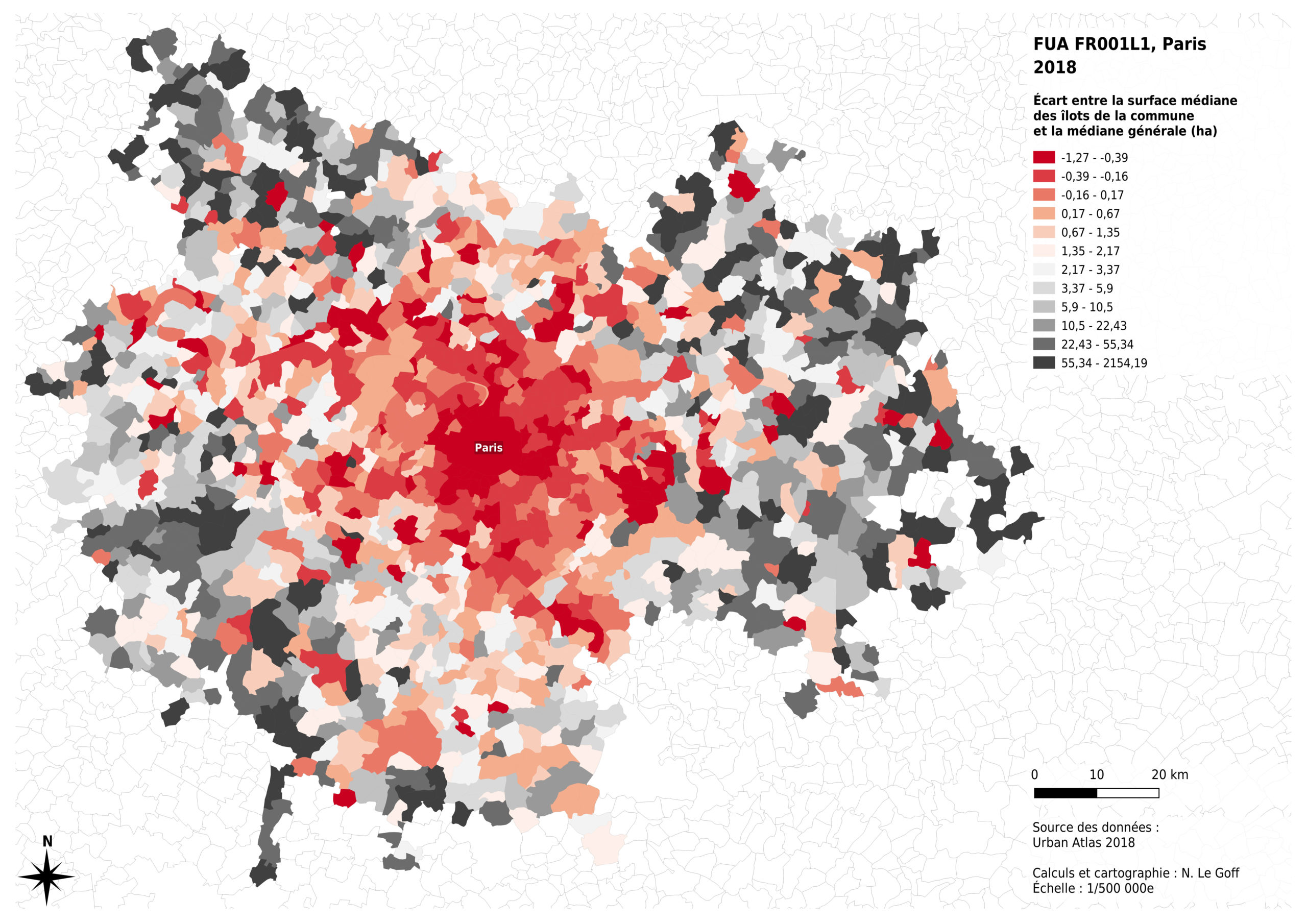 La valeur médiane de surface d’îlot par commune est aussi intéressante, même si elle a ses limites. Elle permet de repérer des communes ayant globalement des îlots de tailles comparables. Mais, on l’a vu, la valeur médiane des tailles d’îlots dépend des métropoles. Il est donc intéressant de calculer aussi pour chaque métropole, l’écart entre la valeur médiane d’une commune et la médiane de l’ensemble des communes d’une métropole. Cette approche permet de mieux appréhender visuellement la distribution des valeurs sur les territoires analysés.
