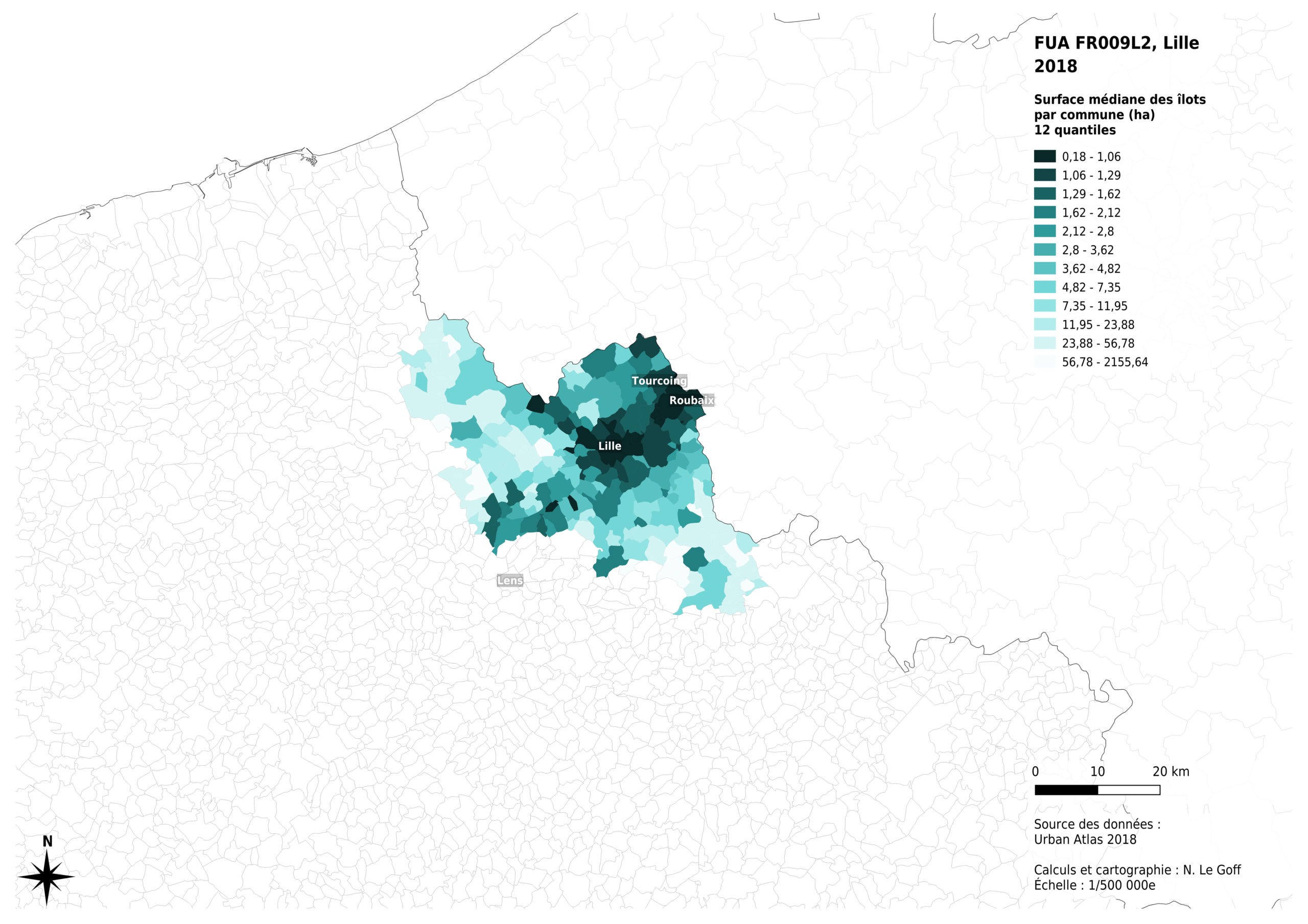 Les valeurs moyennes de surfaces d’îlots rendent bien compte d’une tendance générale : certaines agglomérations ont globalement des îlots plus grands que d’autres. Ainsi, le plus grand îlot de l’agglomération de Lille (726,49 ha) est bien plus petit que celui de la marseillaise (19 467,70 ha) et la moyenne pour l’agglomération septentrionale est (11,75 ha) est presque trois fois plus petite que pour la méditerranéenne (31,18 ha). Assez logiquement, la première compte beaucoup plus d’îlots que la deuxième (un peu moins du double). Les métropoles parisienne et lyonnaise se situent entre ces deux extrêmes.