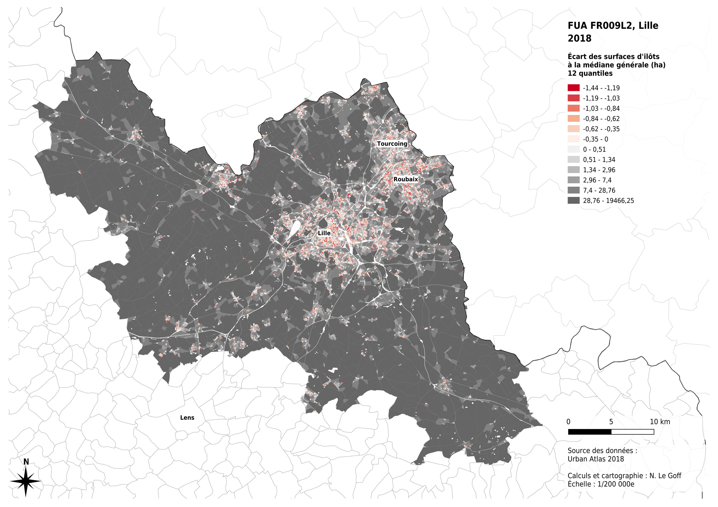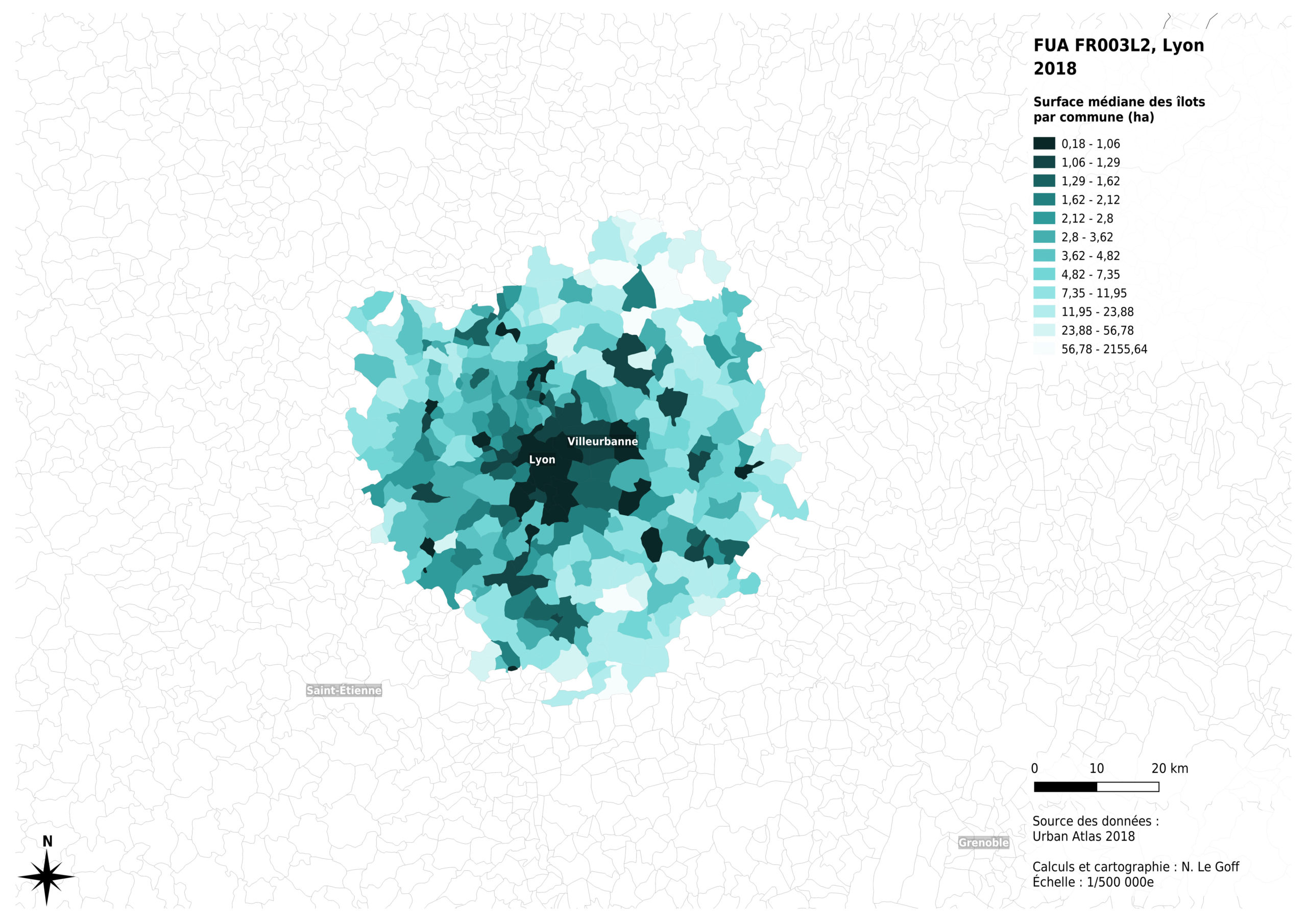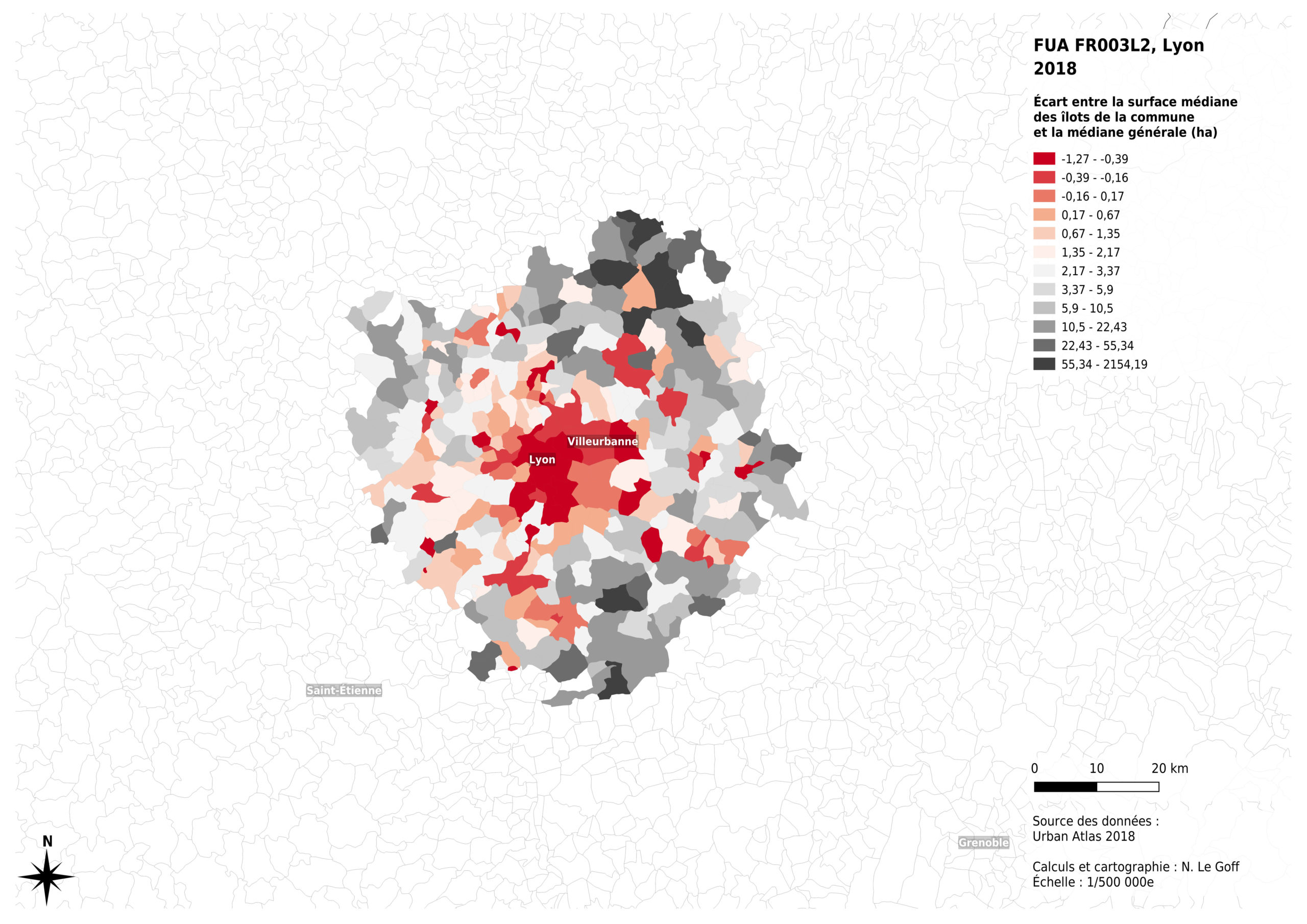 On a donc deux tendances générales. D’une part, les îlots sont souvent plus petits dans les centre urbains et plus grands dans leur périphérie éloignées. D’autre part, une certaine hétérogénéité des tailles d’îlot est très fréquentes dans les centres urbains et leur proche périphérie (la commune de Lyon est à cet égard une exception). Entre les deux, on trouve des territoires intermédiaires qui ont, plus souvent que les autres, des îlots dont la surface est proche de la valeur médiane des quatre agglomérations concernées. Par conséquent, on ne peut pas baser les analyses de ces tissus urbains intermédiaires sur la recherche de régularités homogènes : il convient de prendre en compte l’hétérogénéité des surfaces d’îlots pour ce type de territoire.