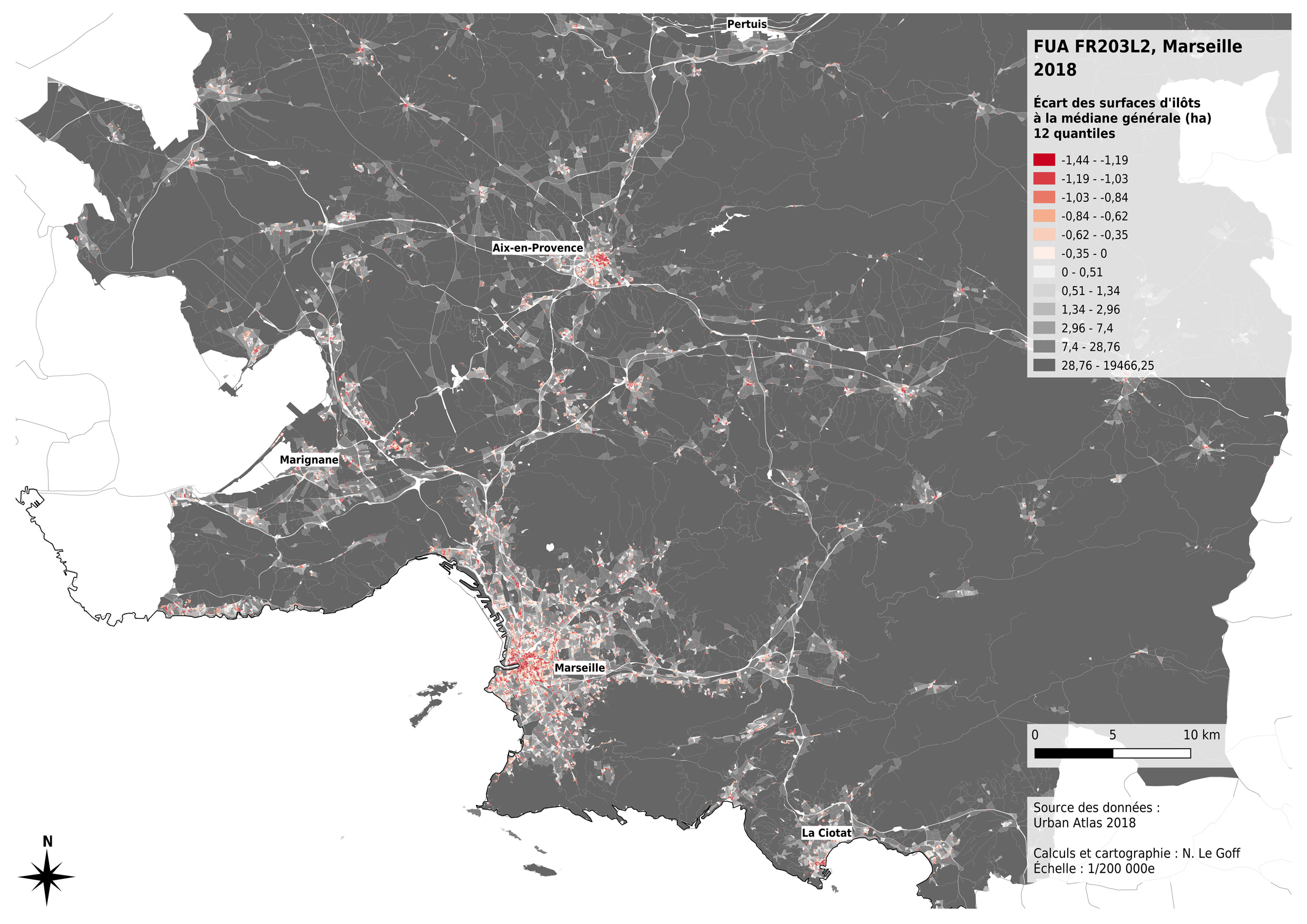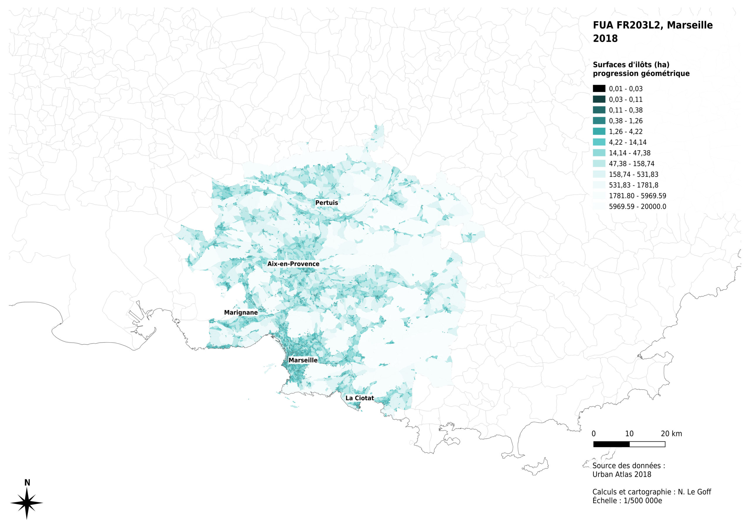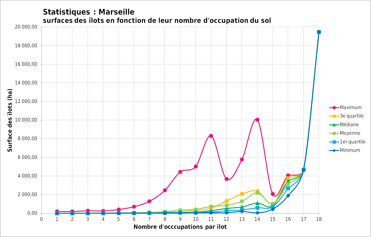 Les statistiques générales sont en fait très influencées par le cas de Marseille, du fait des écarts importants entre les plus petits et les plus grands îlots de l’aire urbaine, et par celui de Paris, du fait de l’importance quantitative du nombre d’îlots dans la capitale.