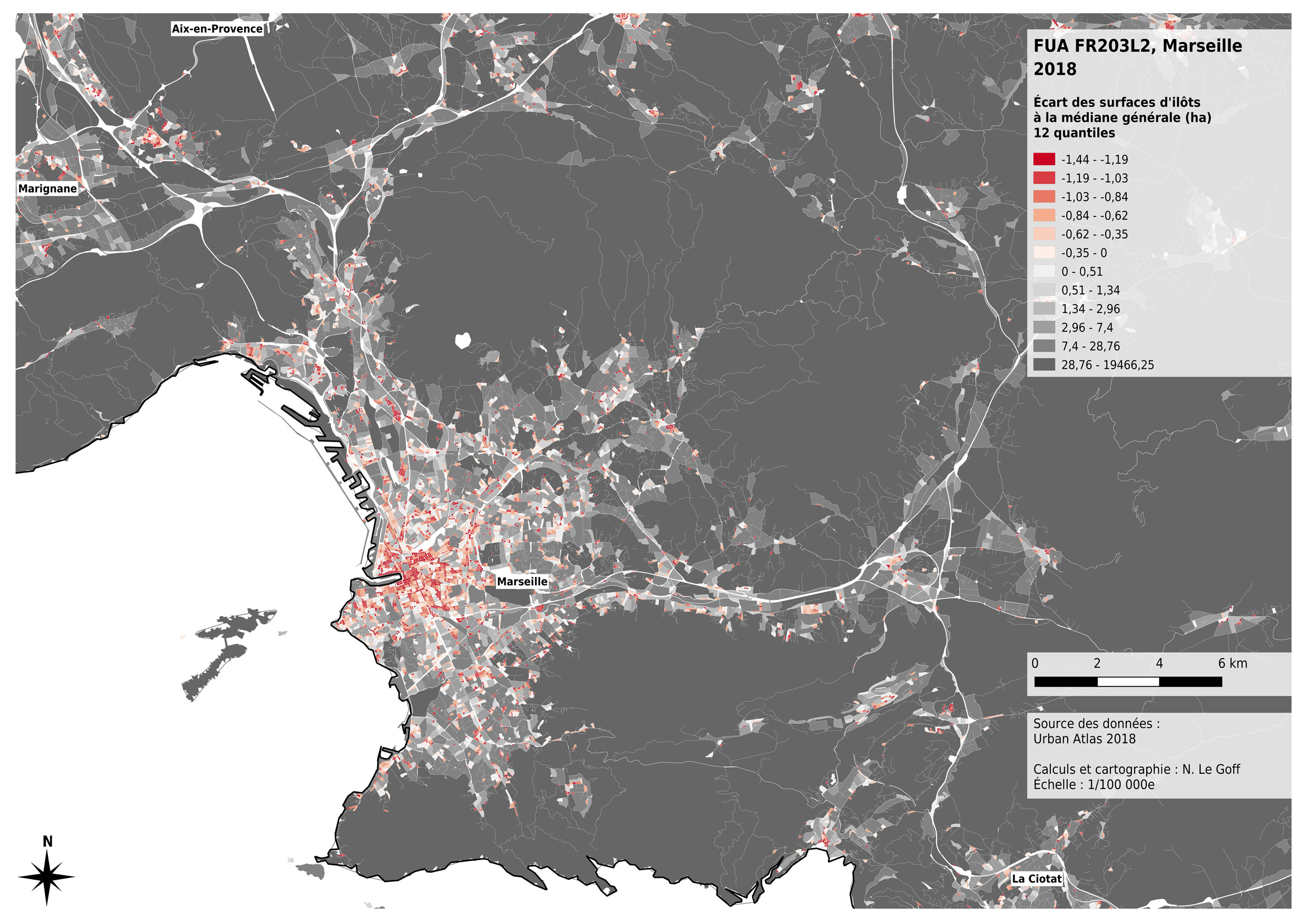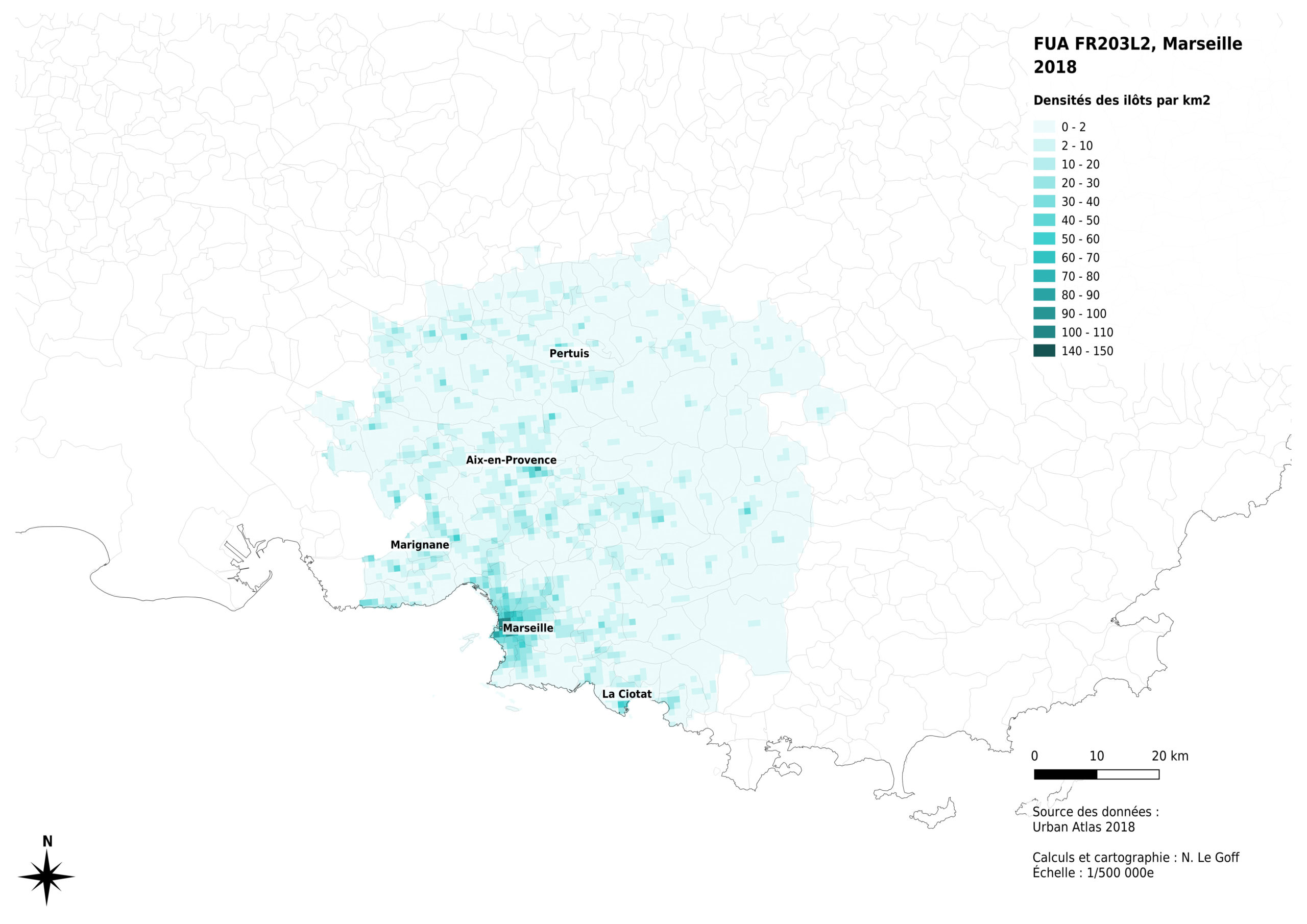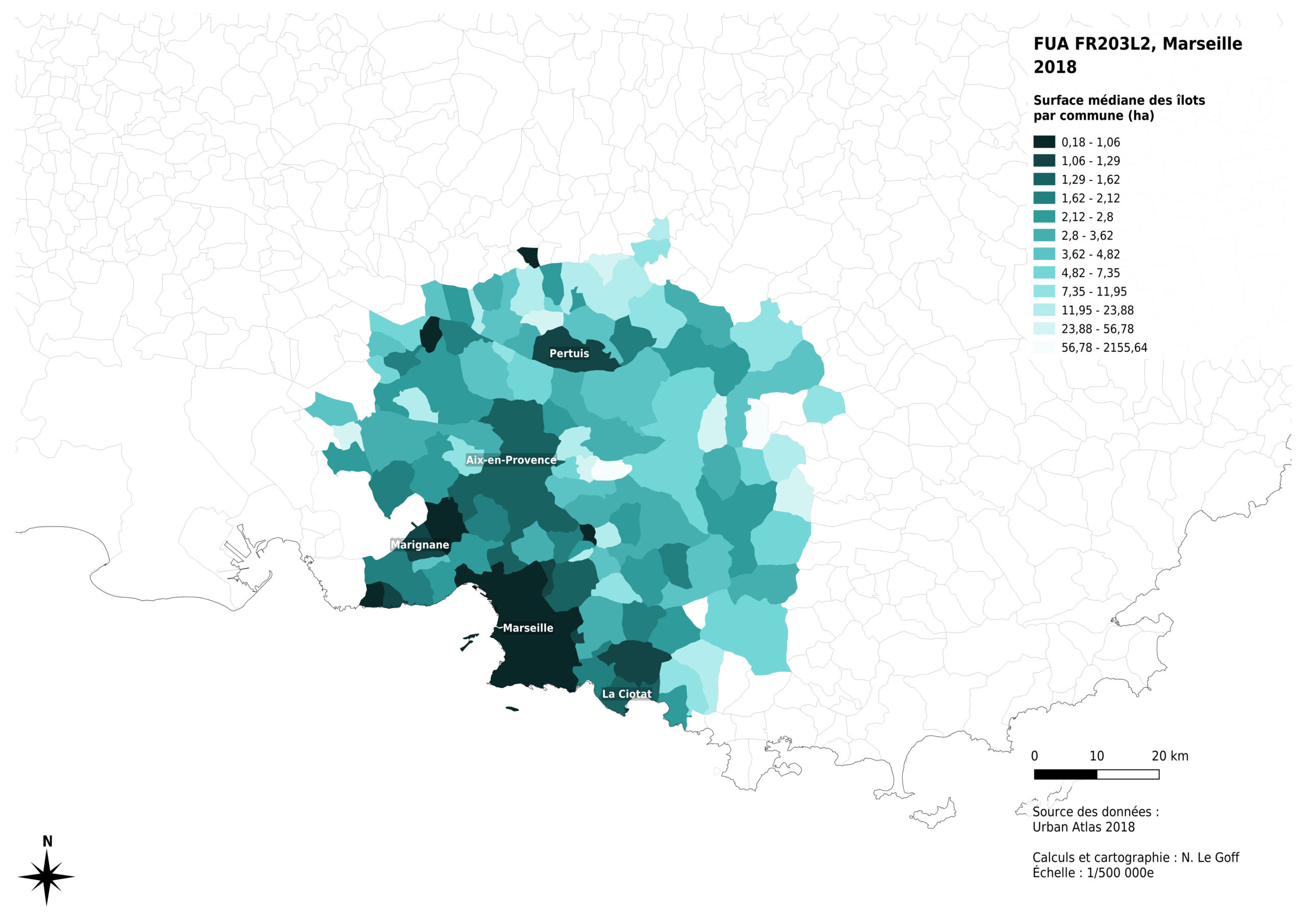 Les statistiques générales sont en fait très influencées par le cas de Marseille, du fait des écarts importants entre les plus petits et les plus grands îlots de l’aire urbaine, et par celui de Paris, du fait de l’importance quantitative du nombre d’îlots dans la capitale.