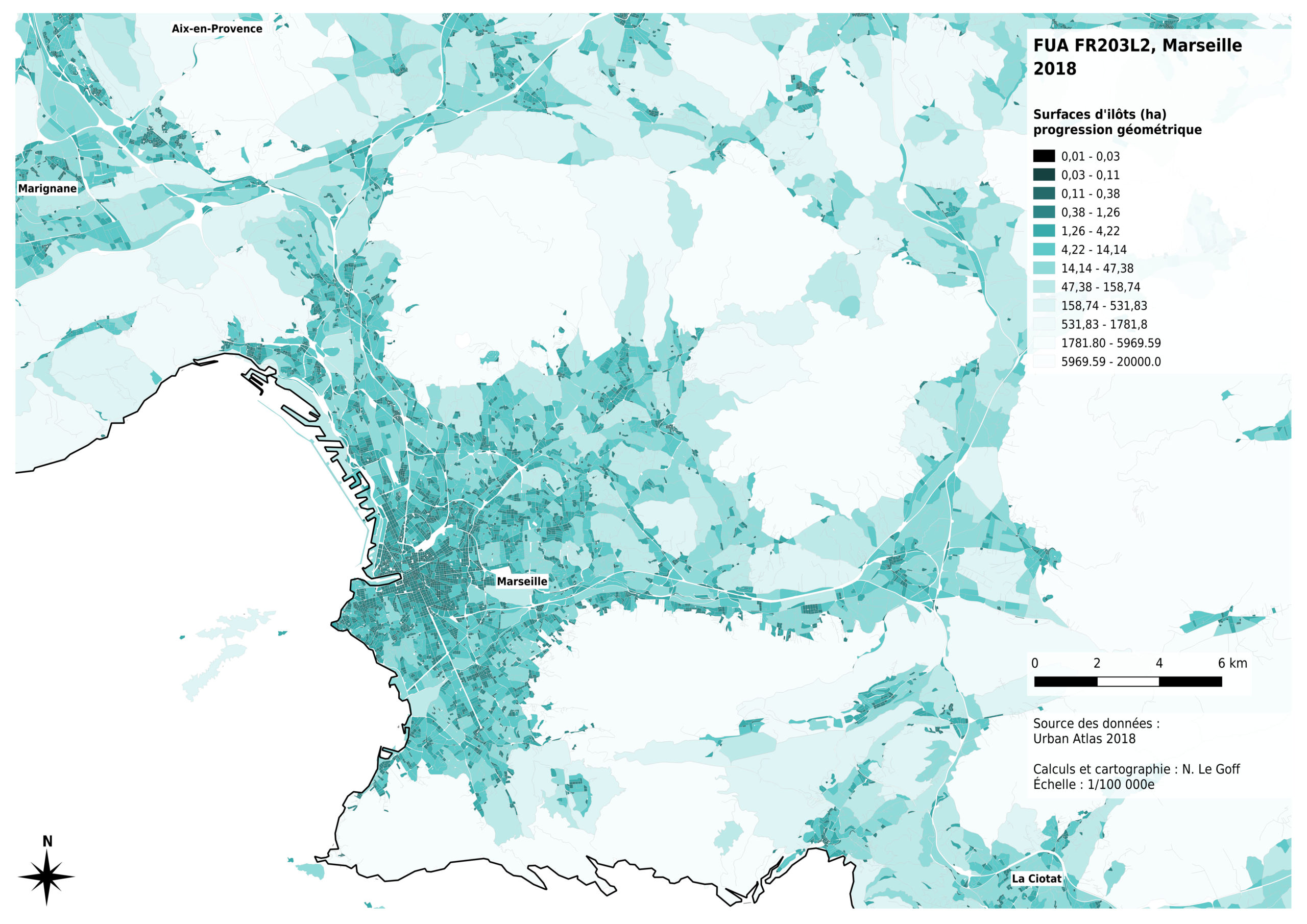 L’analyse de la distribution des données montre que celle-ci n’est pas la même selon les métropoles concernées. La présence de massifs montagneux à proximité de Marseille a des effets sur les surfaces des îlots inclus dans la métropole : certains îlots sont très grands, par comparaison avec les autres cas. La région de Lille présente aussi des îlots ruraux globalement plus petits, probablement du fait de l’histoire de l’occupation du sol à des fins agricoles. Nous avons donc choisi de diminuer les contrastes entre les valeurs claires de notre dégradé de couleurs pour permettre une comparaison visuelle entre les 4 cas analysés.