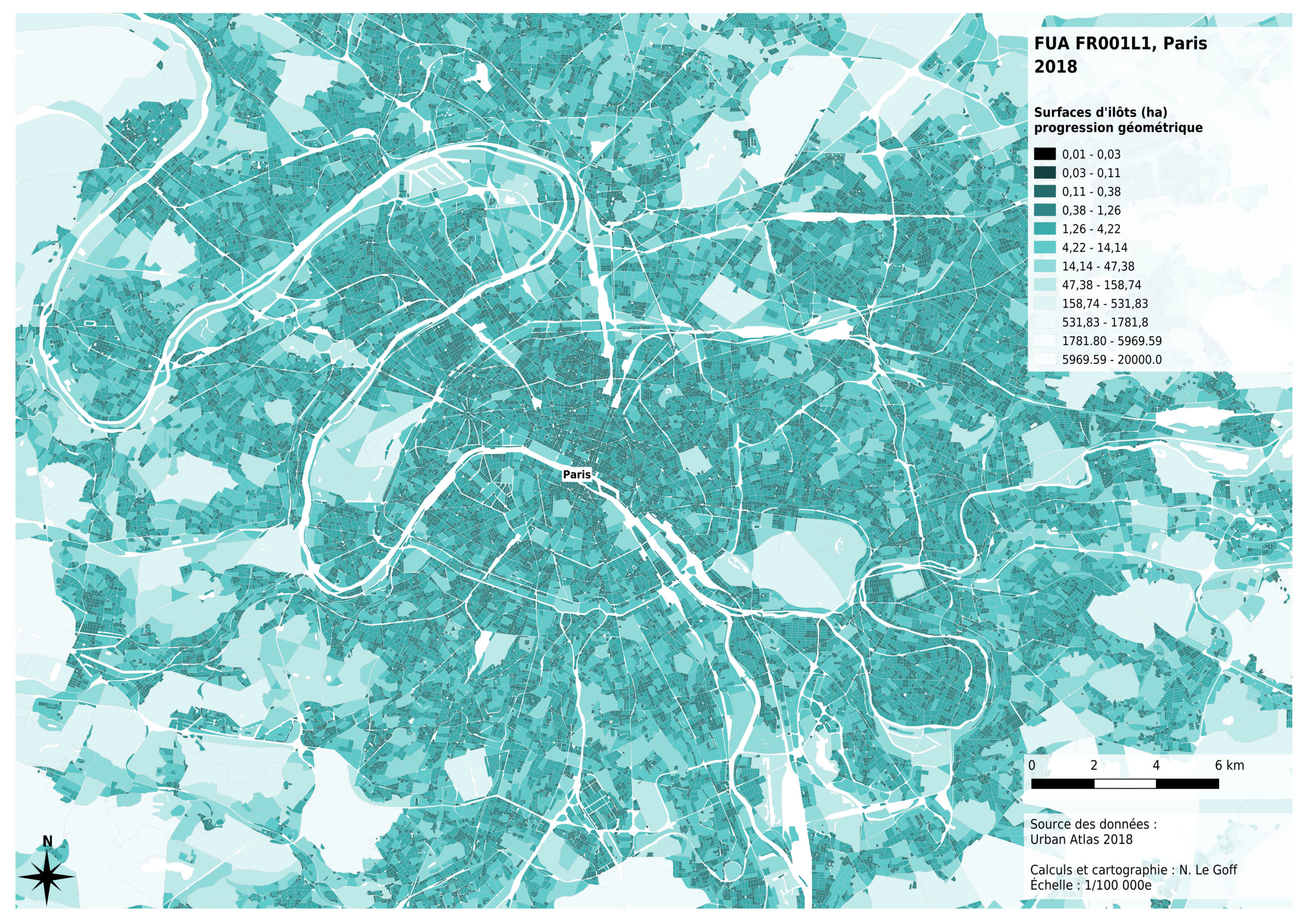 Par ailleurs, la distribution des surfaces d’îlots est différente selon les agglomérations, même si elle suit, à chaque fois, une courbe exponentielle de la plus petite à la plus grande surface.
