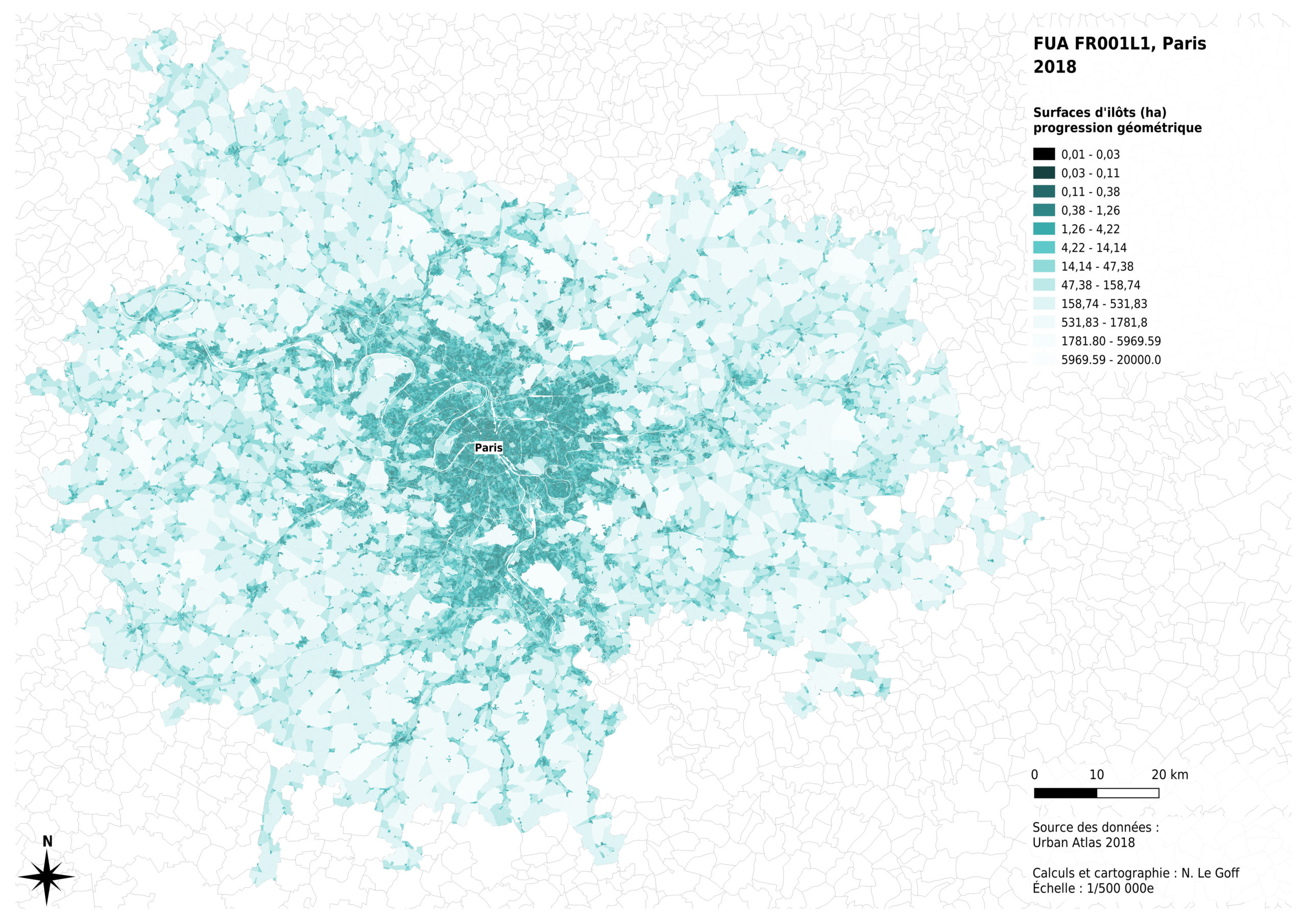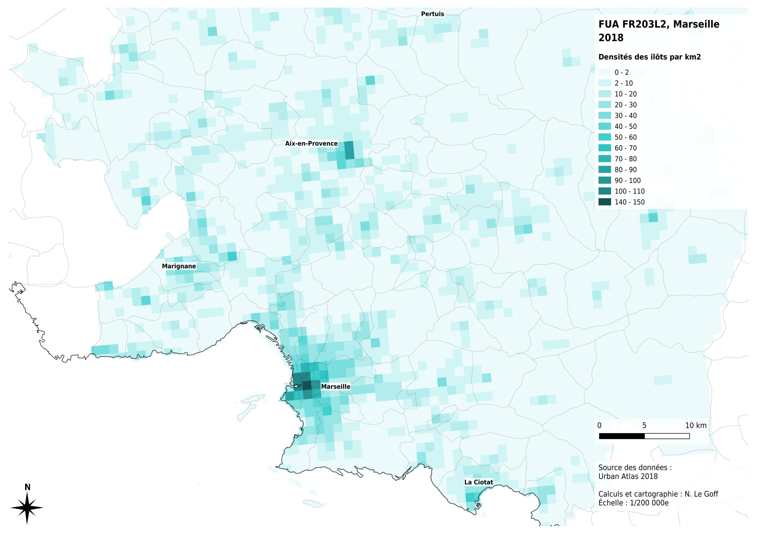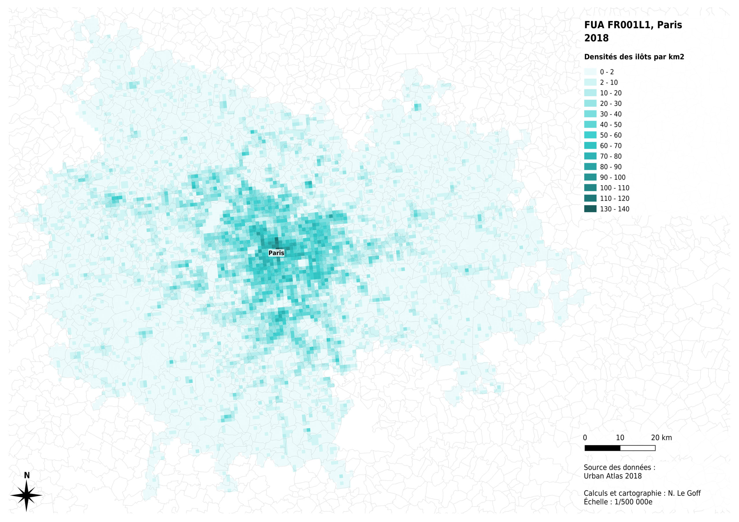 L’intérêt de cette approche, c’est qu’elle permet notamment de calculer la densité parcellaire par îlot, ce qui est impossible avec l’Urban Atlas. Si la possibilité de comparaisons européennes est ici limitée, on gagne en précision sur les caractéristiques des tissus urbains français analysés.