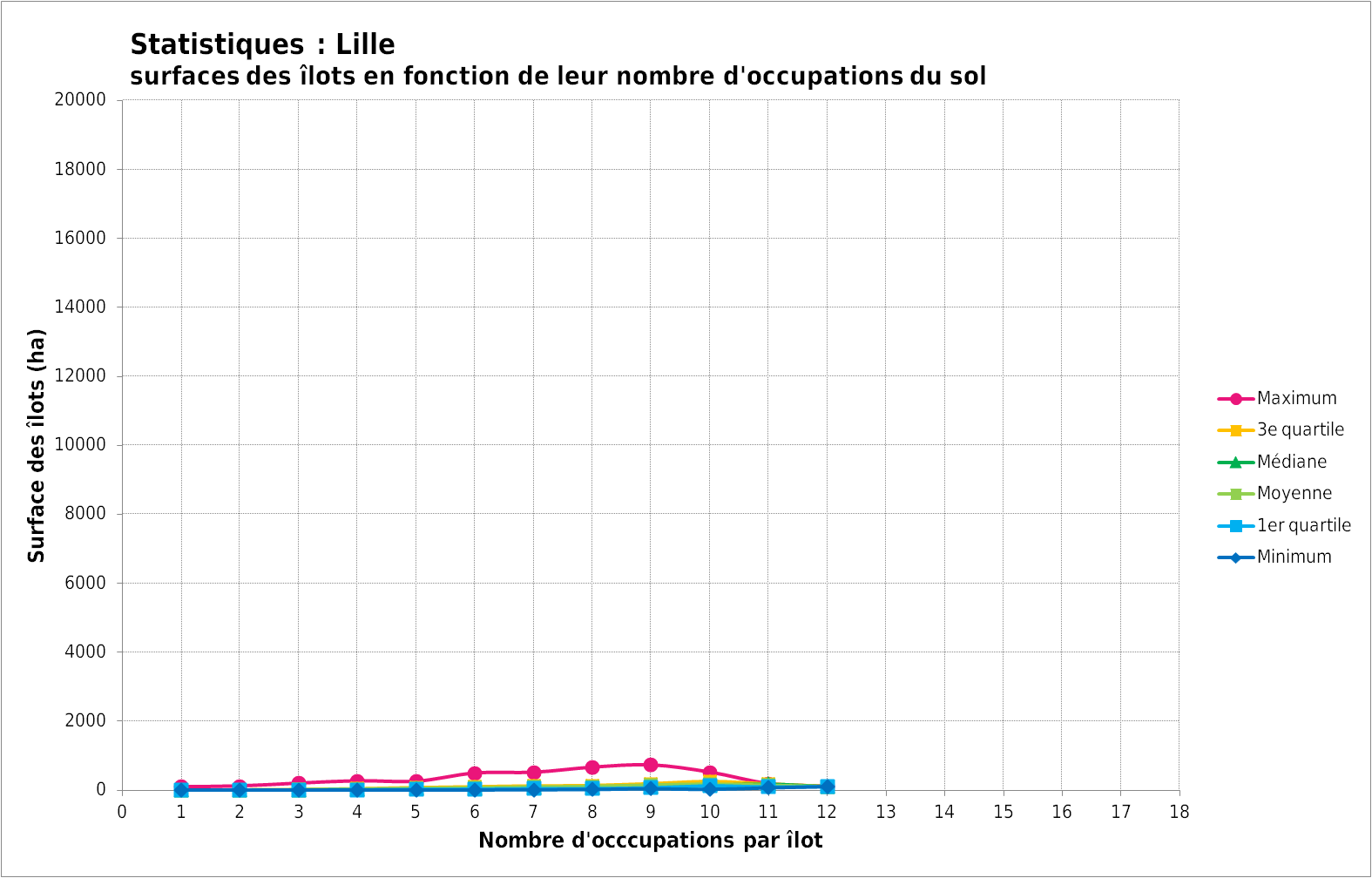 La plage des surfaces d’îlots tend à s’agrandir avec le nombre d’occupations du sol, même si ce n’est pas systématique. La surface minimum et maximum des îlots selon le nombre d’occupations sur leur sol également. Mais ces seuils sont soumis à l’existence de valeurs particulières, peu significatives. La surface maximale notamment varie très fortement. Cette situation induit des variations dans la moyenne qui la rend peu significative. La surface minimale paraît plus pertinente, car elle subit beaucoup moins de variations.