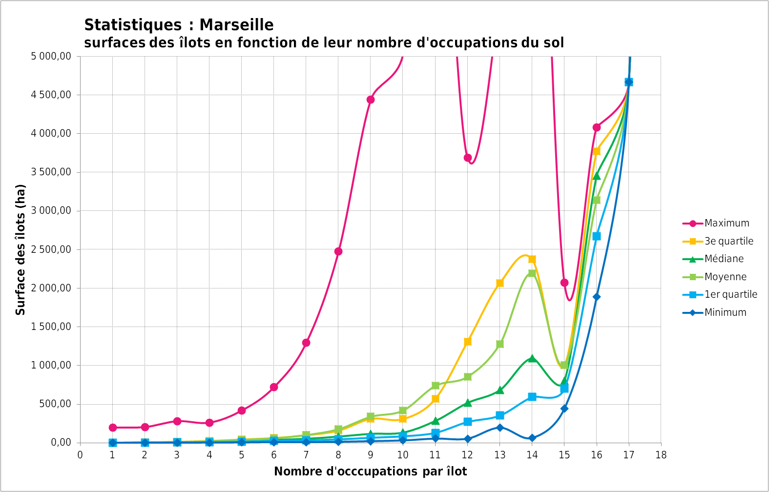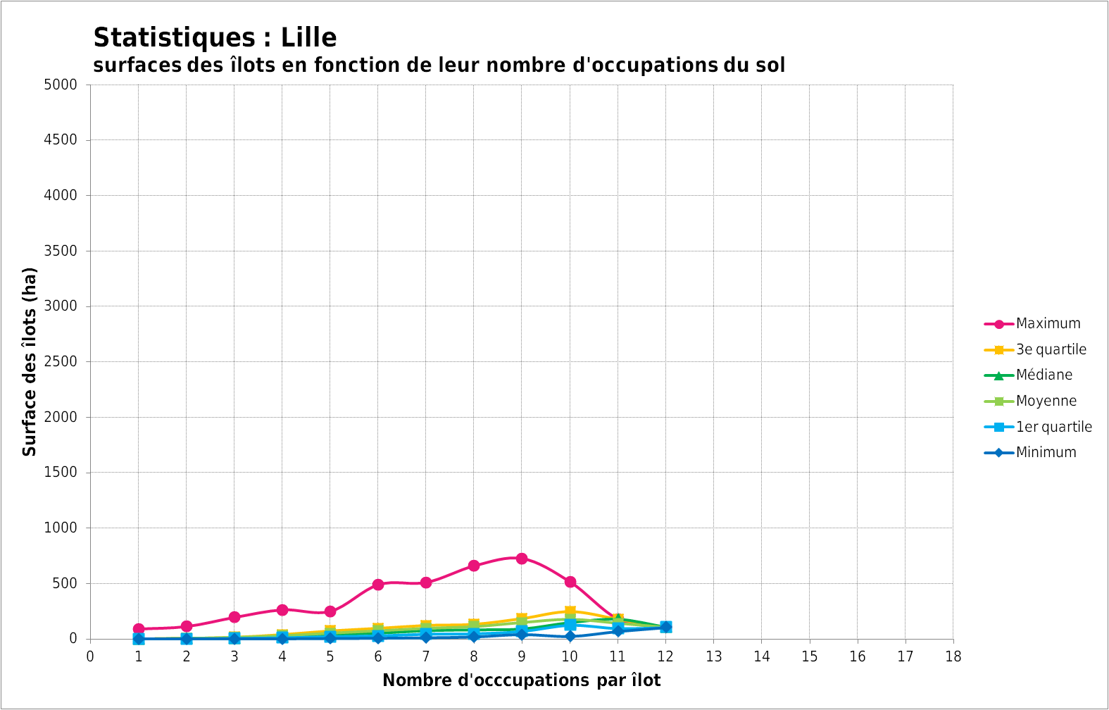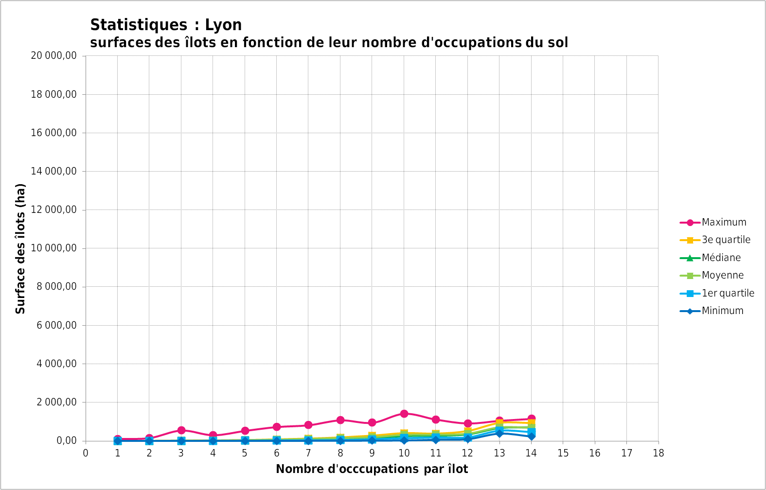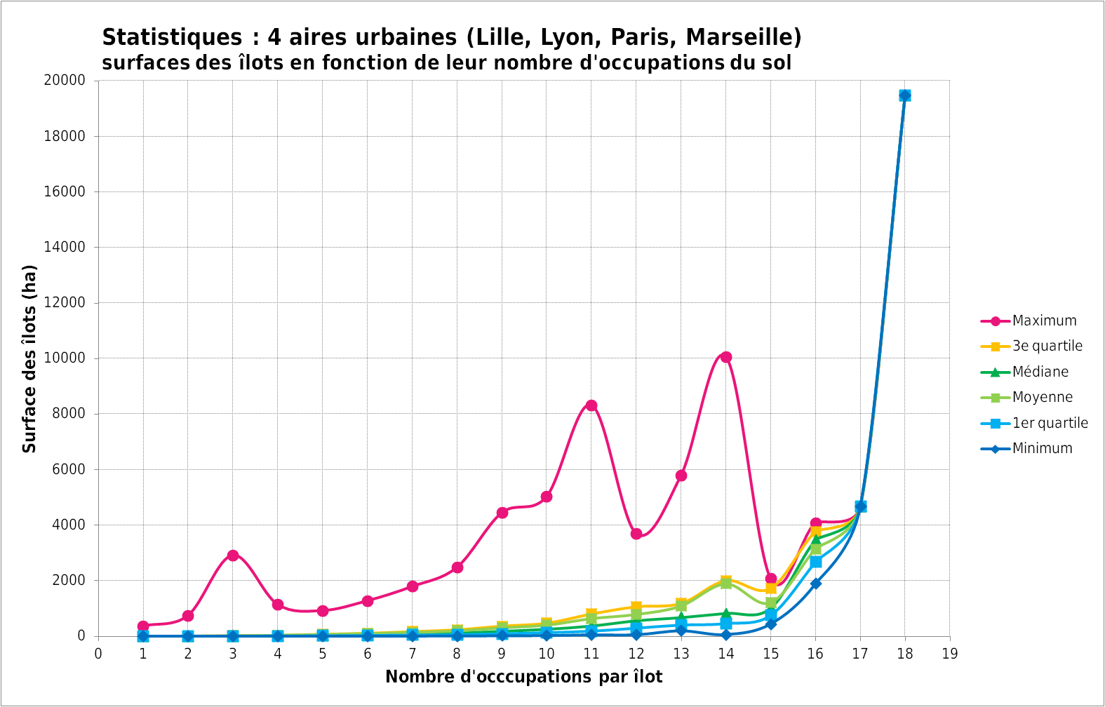 Ainsi, la surface maximale des îlots dans une métropole ne correspond pas systématiquement au plus grand nombre d’occupations du sol (Paris : 13/15, Lyon : 10/14, Lille : 9 /12, Marseille : 18/18). Ce phénomène est en partie lié à la distribution des surfaces d’îlots à l’intérieur de chaque aire urbaine.