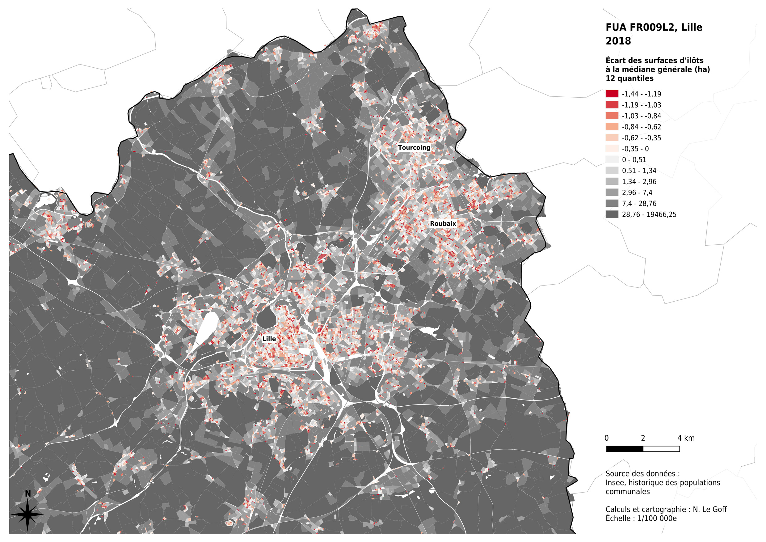Cette méthode permet de chercher d’éventuelles corrélations entre les surfaces médianes d’îlots et les dynamiques de densité de la population observées par ailleurs à l’échelle communale.