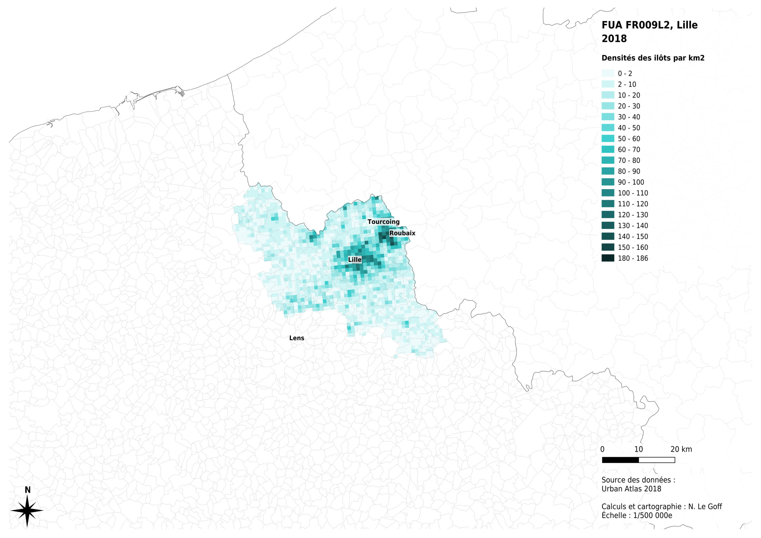 Cette approche permet de proposer des fourchettes selon que la zone concernée est plus ou moins proche d’un centre urbain. La densité des îlots des territoires périphériques ruraux ou semi-naturels est le plus souvent inférieure à 10 îlots au km2. Les centres urbains ont souvent une densité le plus souvent supérieure à 60 îlots par km2. Les territoires intermédiaires ont une densité située entre 10 et 60 îlots par km2. Mais on le voit sur les cartes, ces tendances n’empêchent pas une relative hétérogénéité de ces zones.