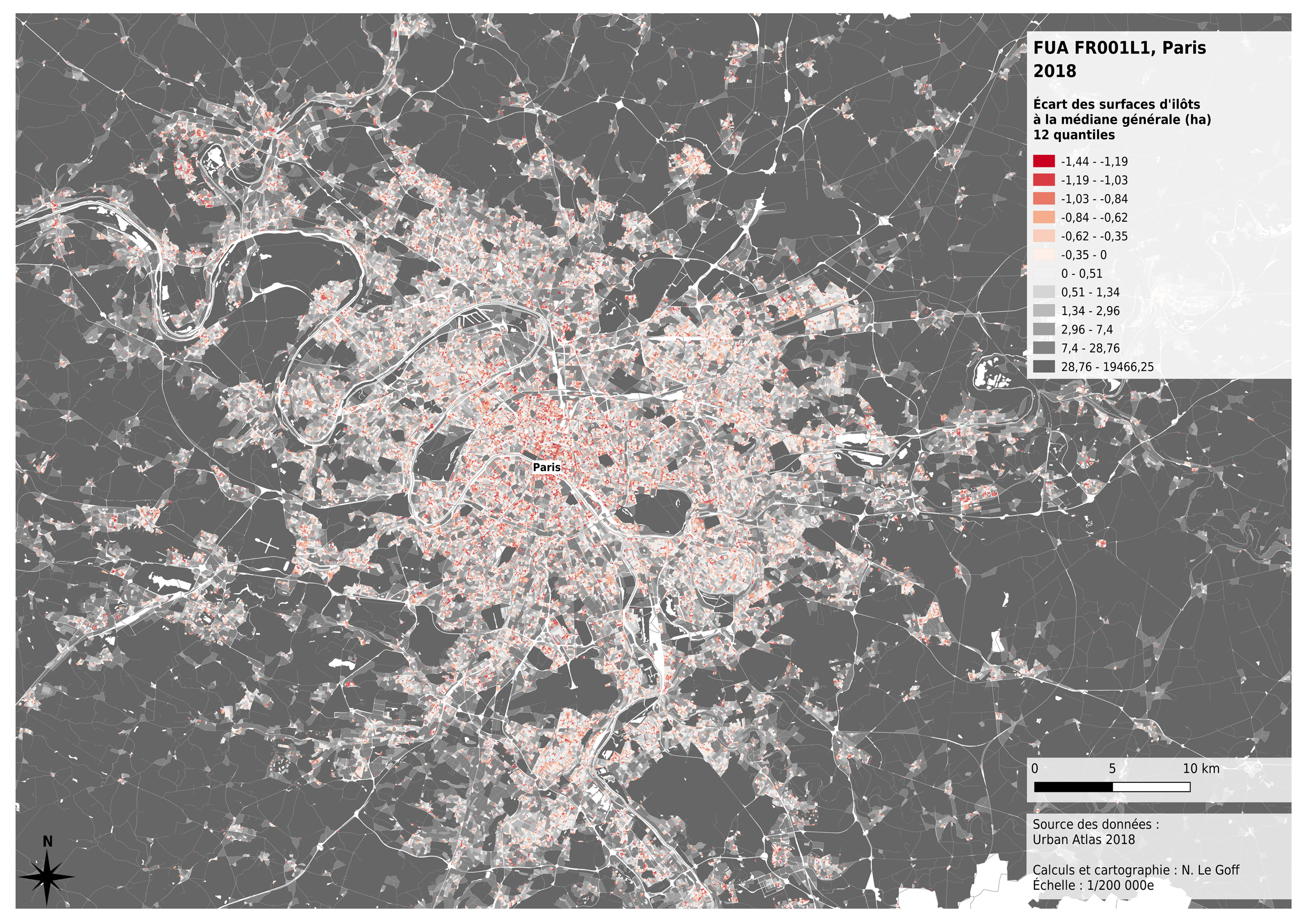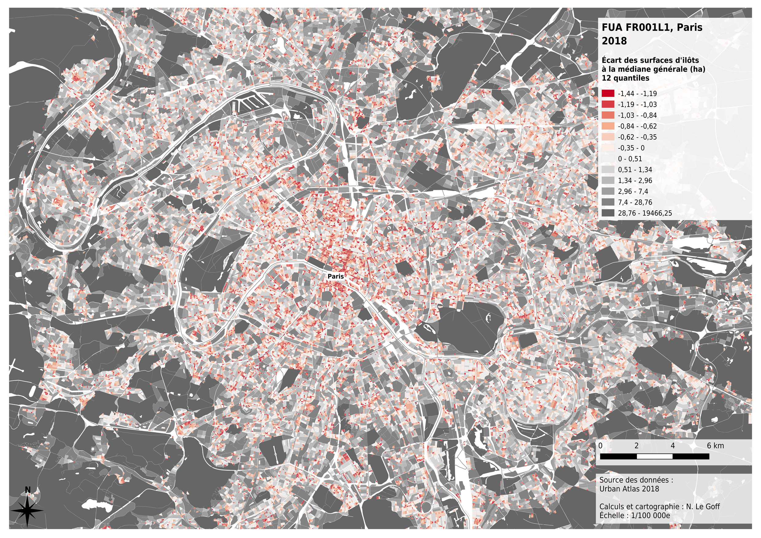 Si l’on cherche la valeur médiane des surfaces d’îlots pour l’ensemble des 4 cas concernés, on obtient une valeur qui peut servir de référence pour une comparaison plus fine entre ces cas. Cette approche permet de mettre en évidence visuellement plusieurs éléments.