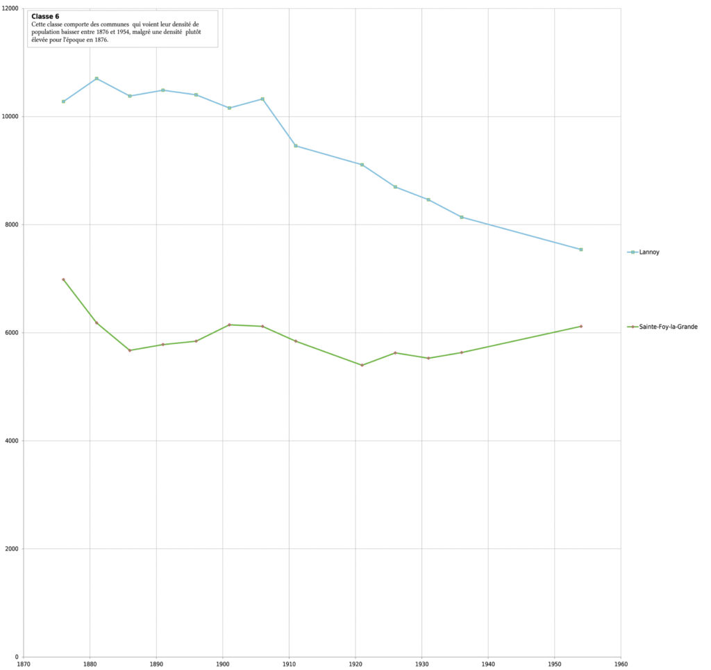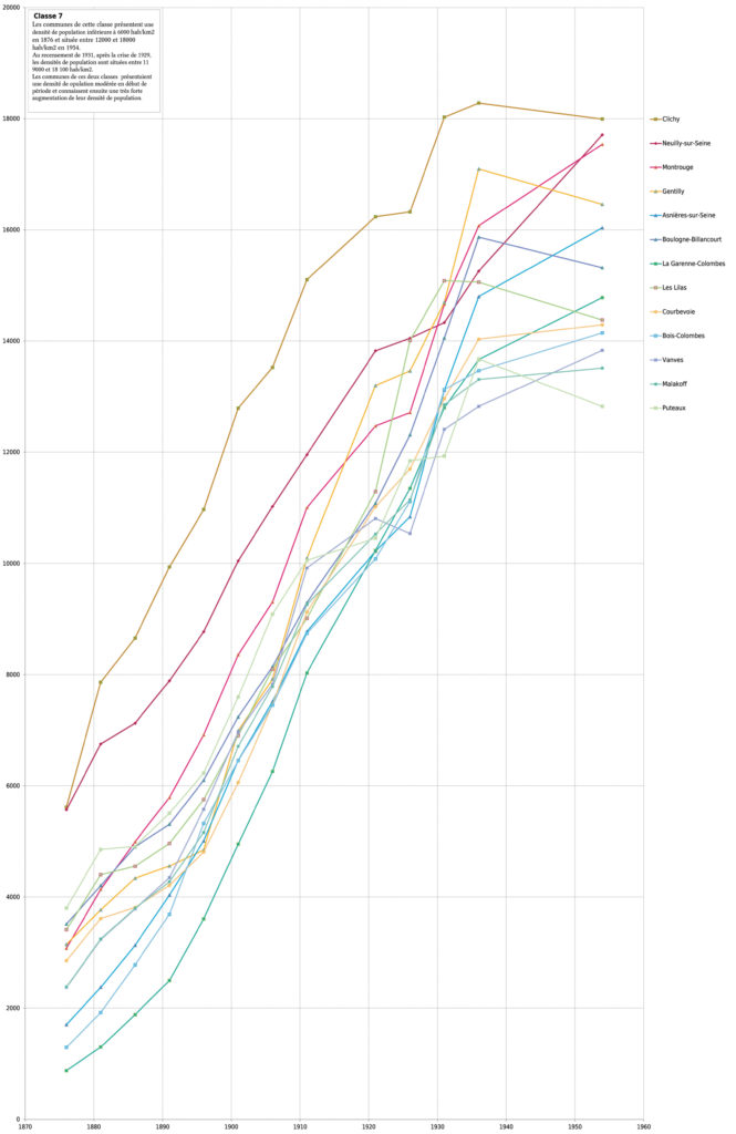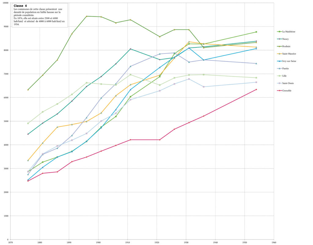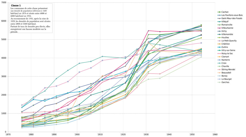 Les dynamiques de croissances de la densité de population des communes atteignant, en 1954, une densité de population supérieure à 4000 habitants/km2 sont très variables. Toutes les communes n’ont pas la même densité de population en 1876 et ne voient pas leur population augmenter au même rythme. Un rupture est perceptible suite à la crise de 1929 (recensement de 1931) : alors que la crise affecte la dynamique d’augmentation de la population de certaines communes, d’autres, au contraire, sont assez peu affectées.