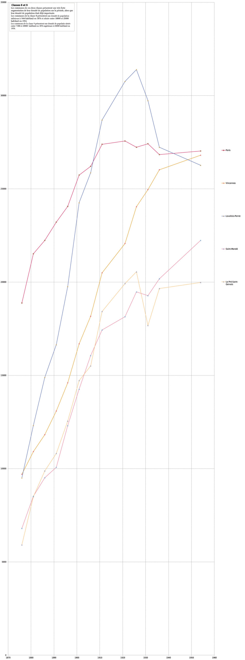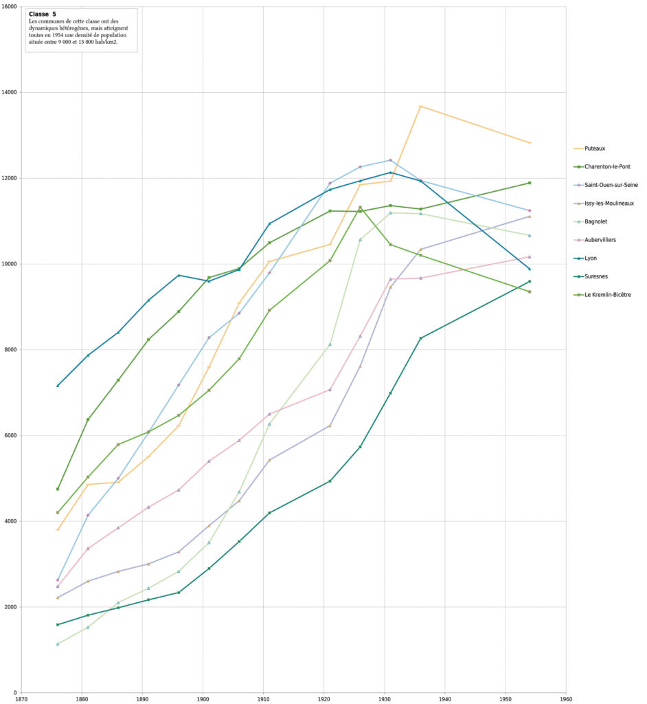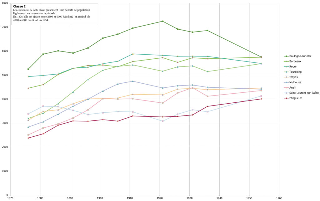 Les communes de cette classe présentent une densité de population légèrement en hausse sur la période. En 1876, elle est située entre 2500 et 6000 hab/km2 et atteint de 4000 à 6000 hab/km2 en 1954.