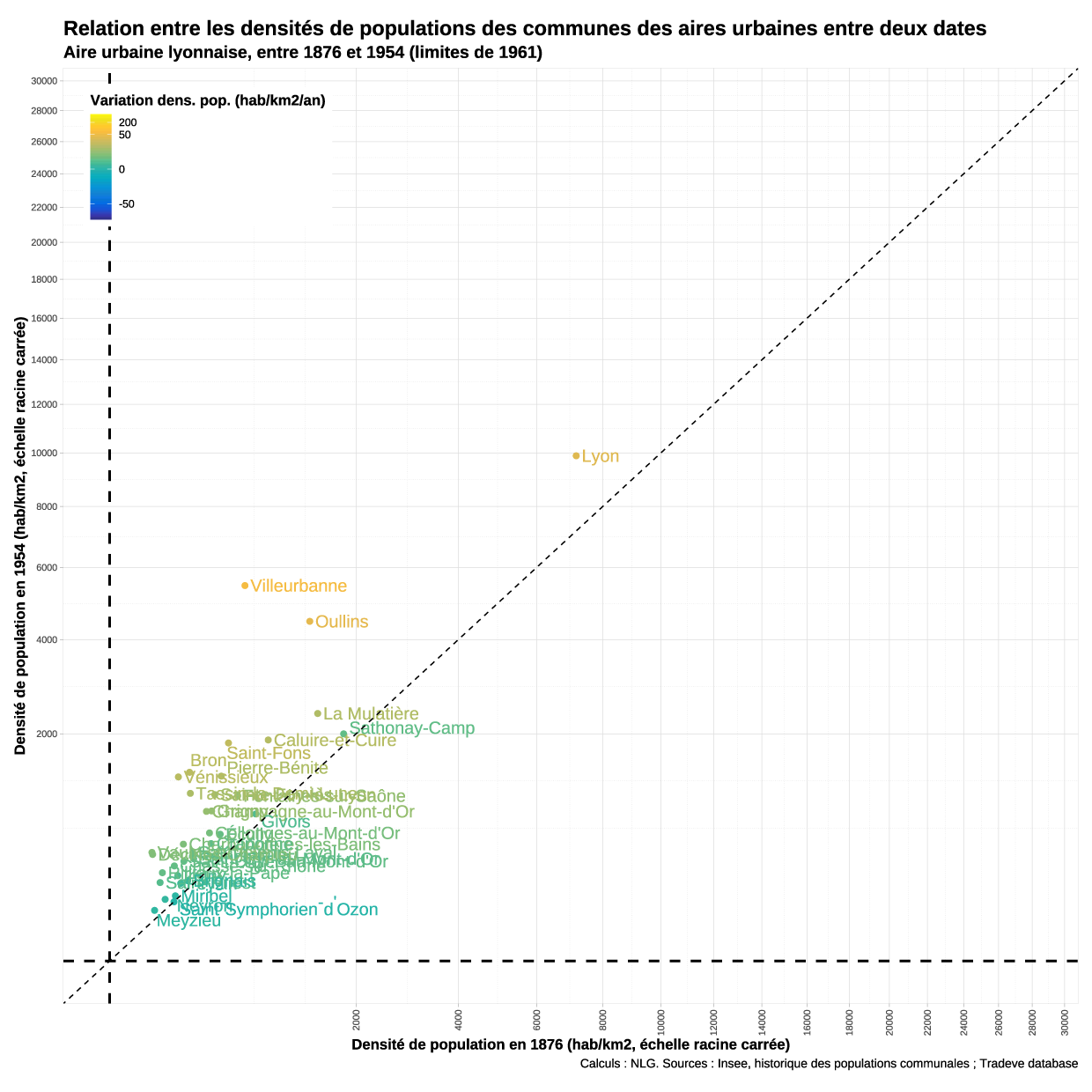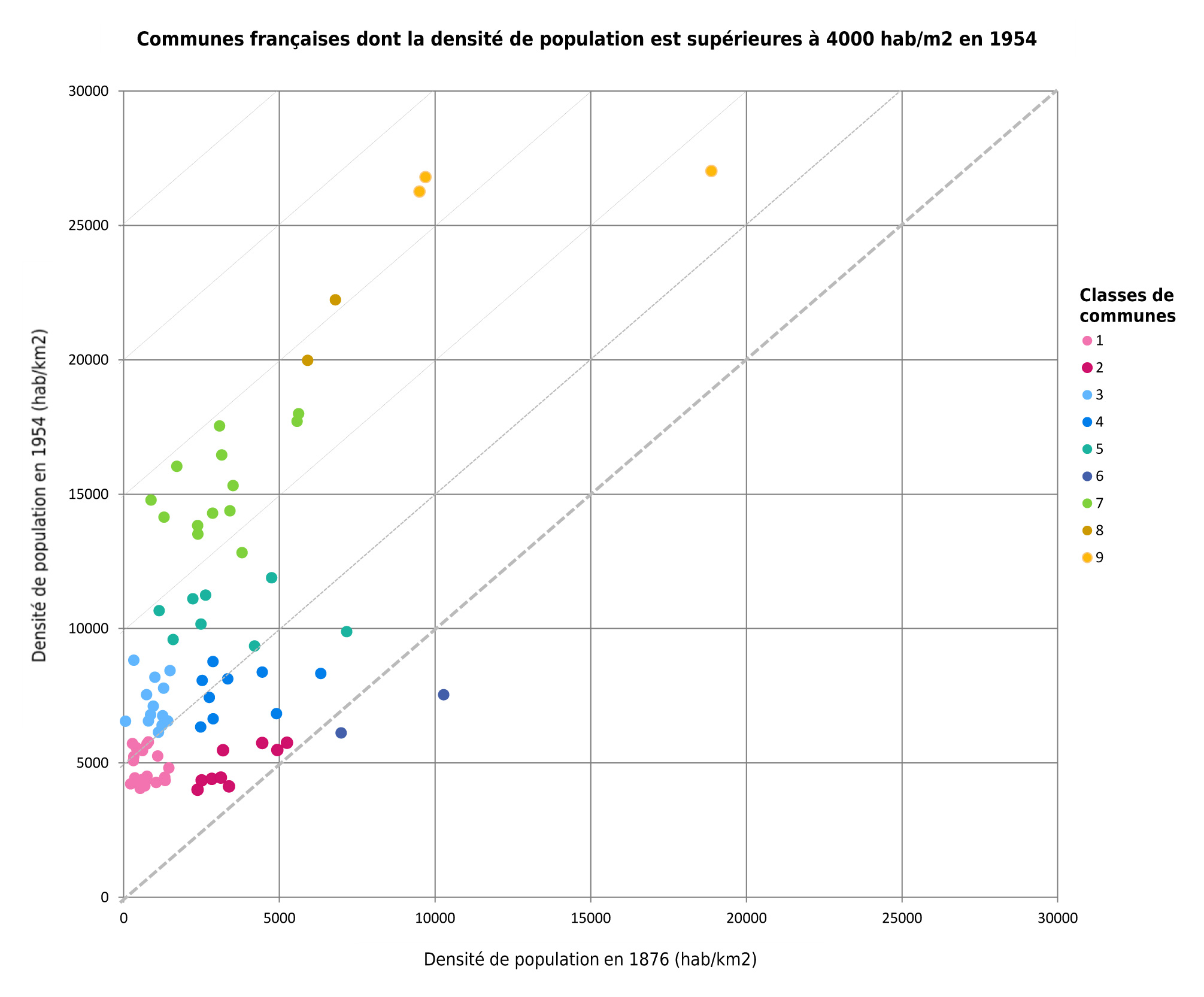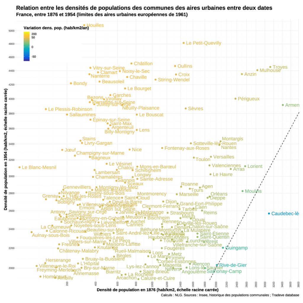 L’ensemble des communes situées sous la diagonale de ce graphique voient leur densité de population baisser, alors celles situées au dessus voient au contraire celle-ci progresser. La couleur permet d’appréhender visuellement la variation annuelle de densité entre 1876 et 1954.