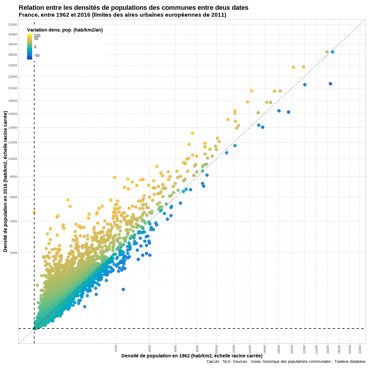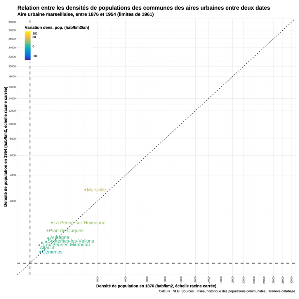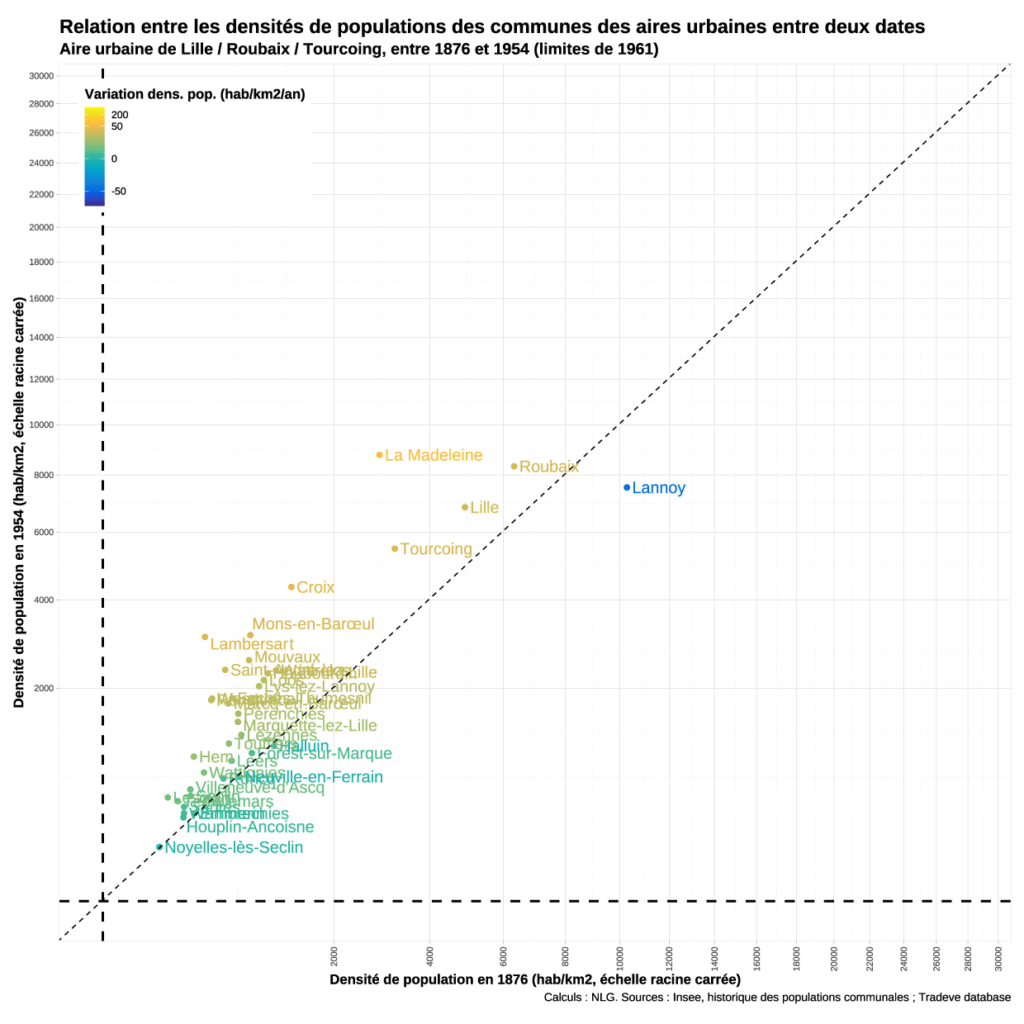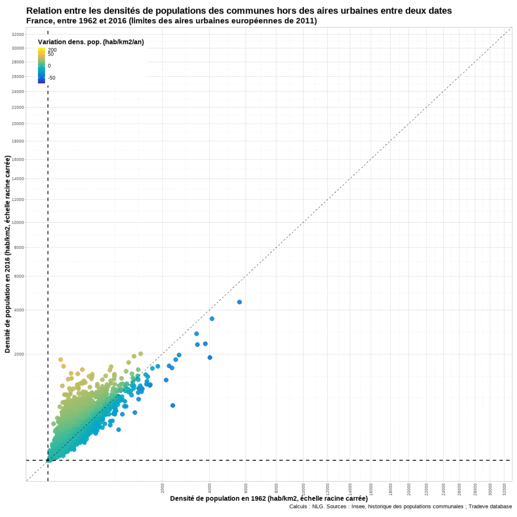 L’ensemble des communes situées sous la diagonale de ce graphique voient leur densité de population baisser, alors celles situées au dessus voient au contraire celle-ci progresser. La couleur permet d’appréhender visuellement la variation annuelle de densité entre 1876 et 1954.