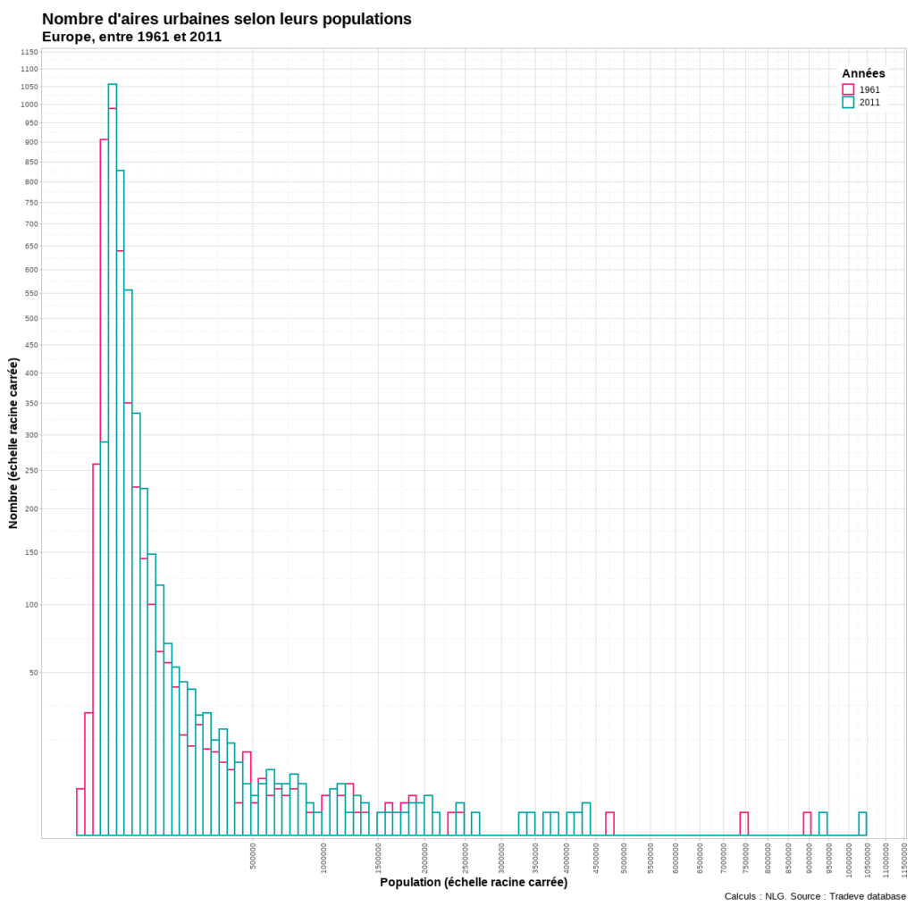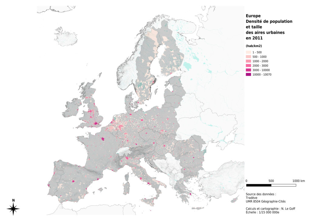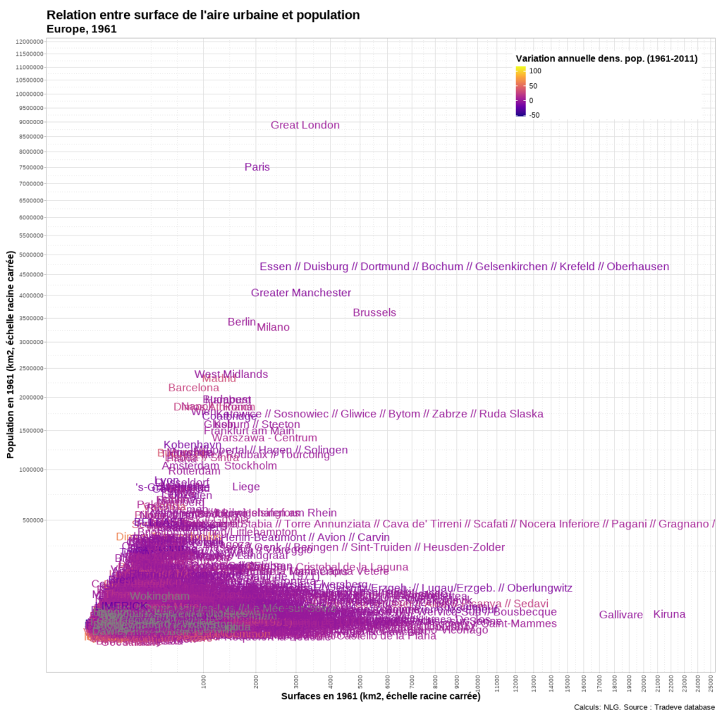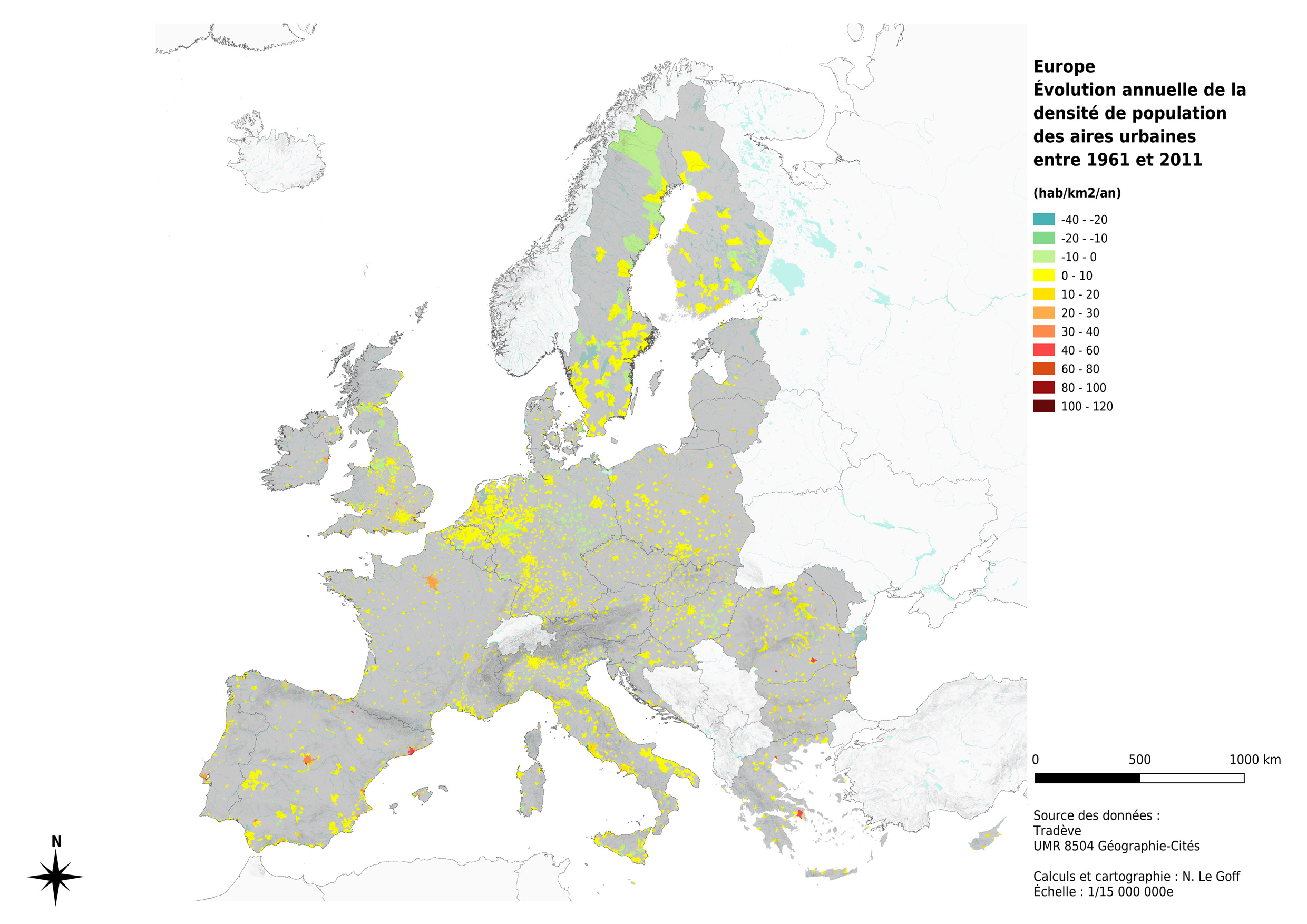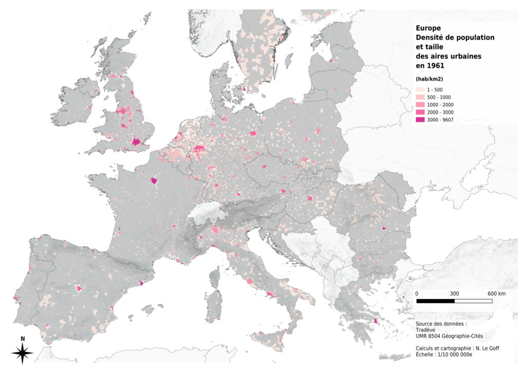 D’autre part, pour saisir les spécificités des grandes métropoles européennes, la série Tradeve a été élaborée par des chercheurs de l’UMR 8504 Géographie-cités. Cette base de données longitudinale repose sur une nouvelle définition des agglomérations urbaines, à partir des données fournies par des agences européennes. Le principal travail de ce projet ANR a consisté à mettre au point et appliquer une protocole rigoureux permettant de déduire des statistiques d’Eurostat des contours géographiques d’agglomérations avec leurs populations associées au fil du temps, entre 1961 et 2011.