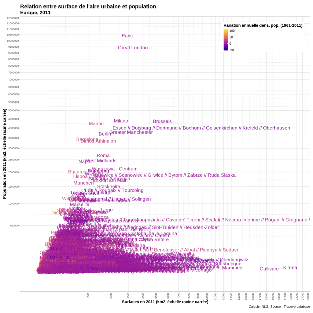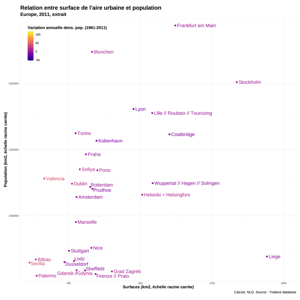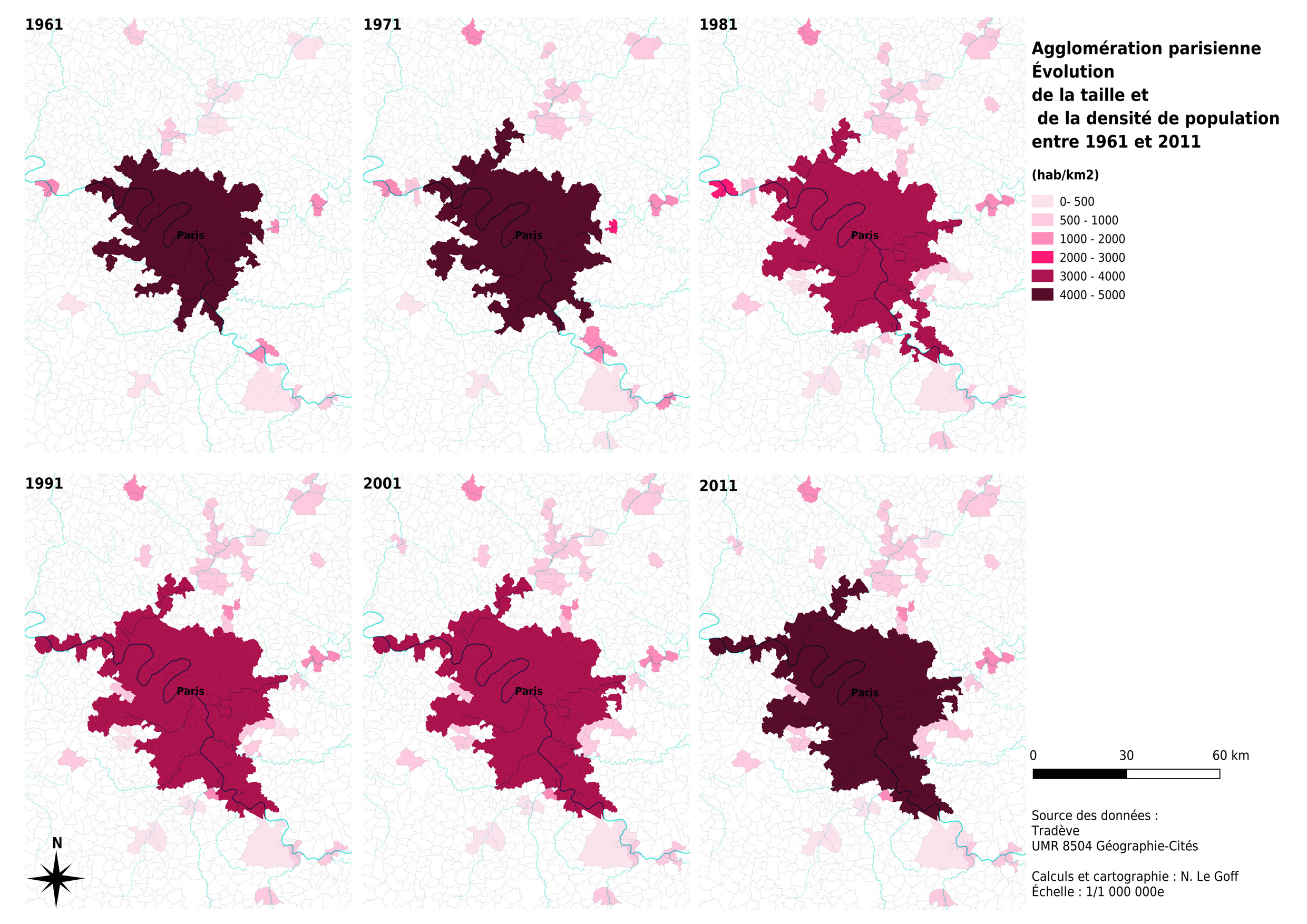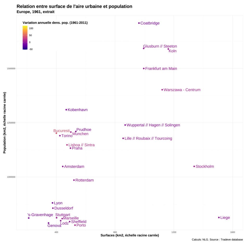 D’autre part, pour saisir les spécificités des grandes métropoles européennes, la série Tradeve a été élaborée par des chercheurs de l’UMR 8504 Géographie-cités. Cette base de données longitudinale repose sur une nouvelle définition des agglomérations urbaines, à partir des données fournies par des agences européennes. Le principal travail de ce projet ANR a consisté à mettre au point et appliquer une protocole rigoureux permettant de déduire des statistiques d’Eurostat des contours géographiques d’agglomérations avec leurs populations associées au fil du temps, entre 1961 et 2011.