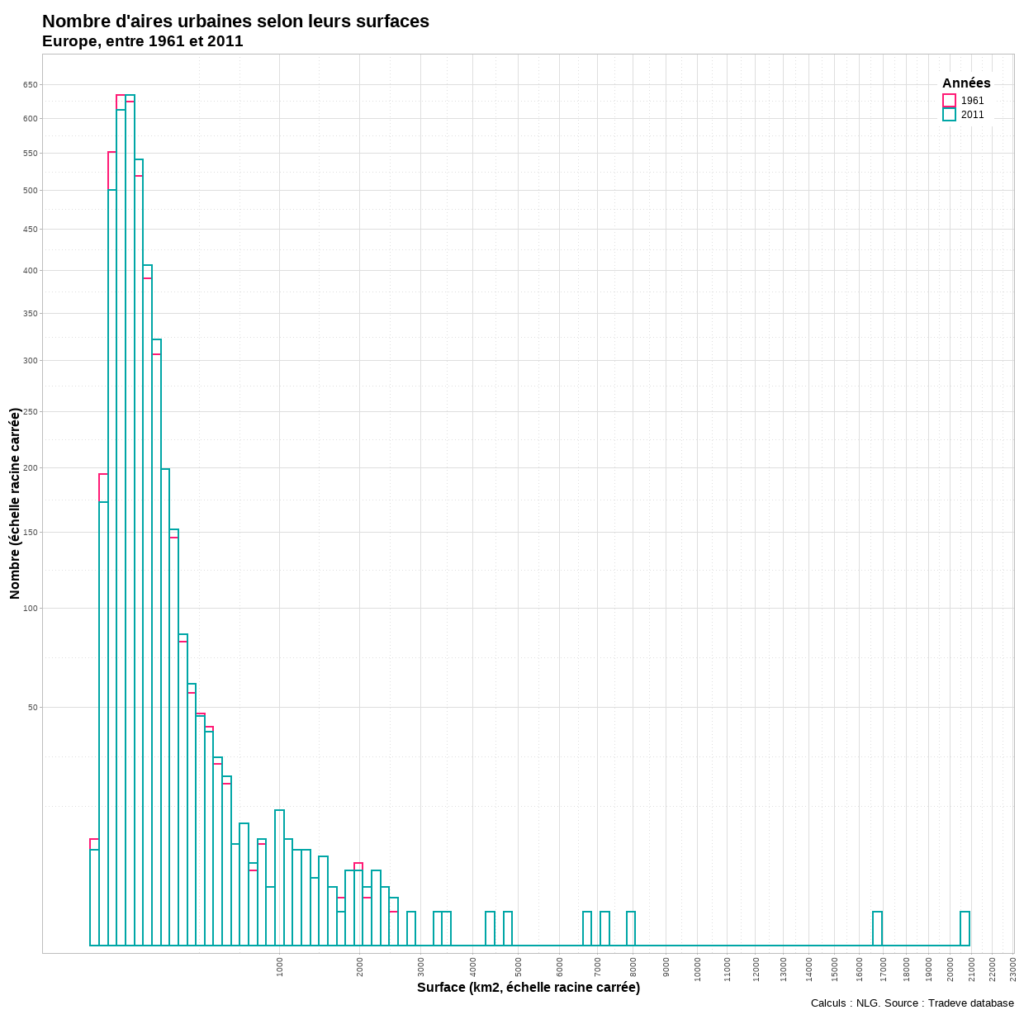 On peut globalement, faire un commentaire similaire concernant les surfaces des unités urbaines européennes, même si le nombre de cas particuliers est moins important.