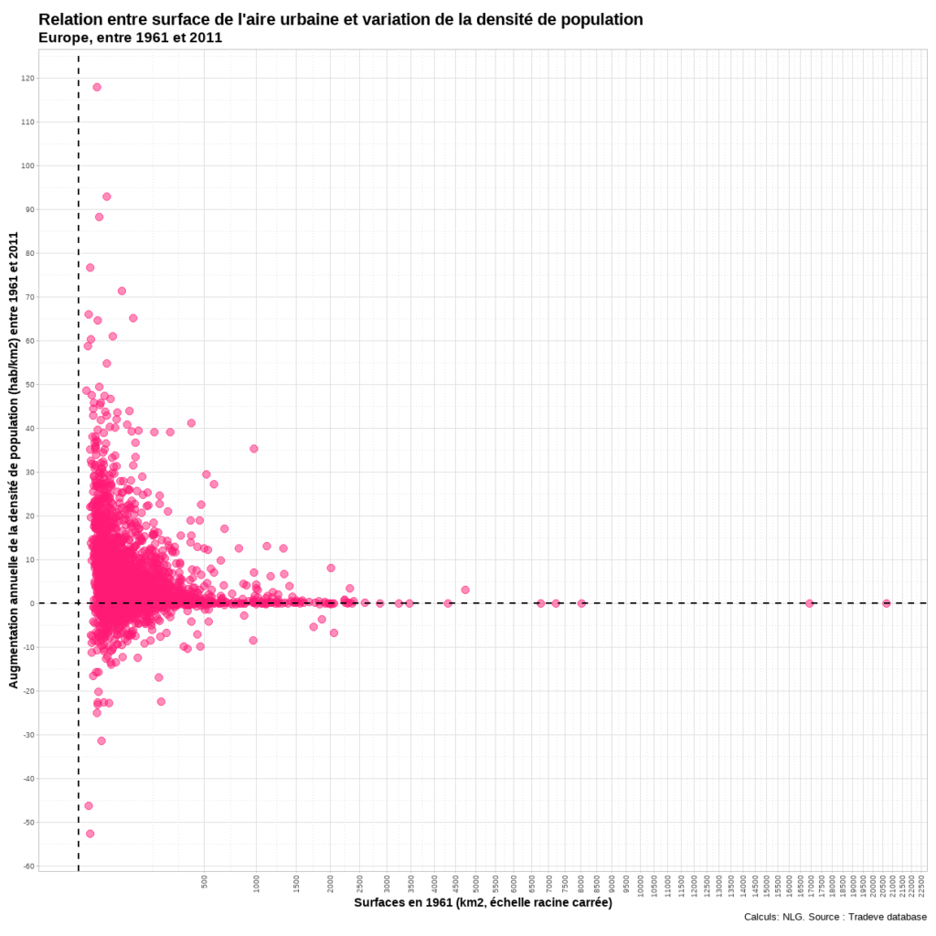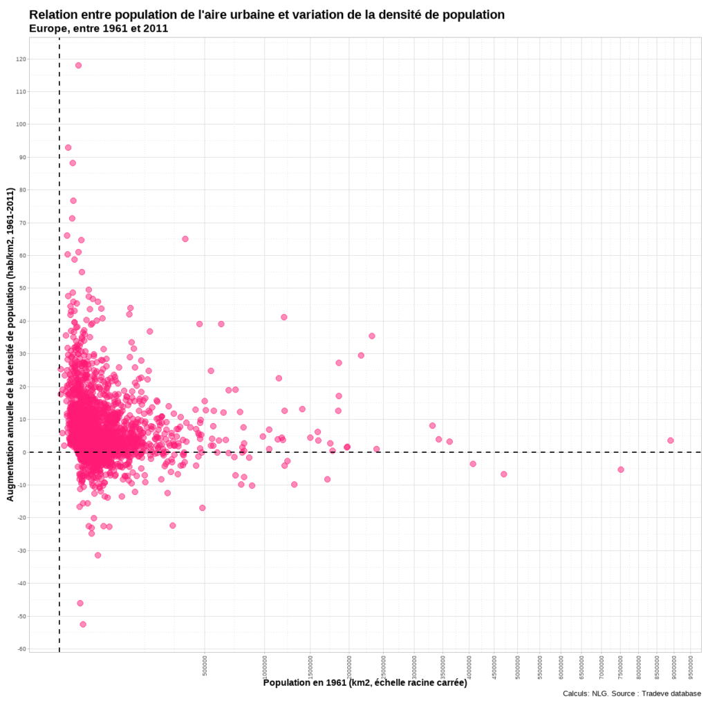 Globalement, la population des unités urbaines tend à augmenter. La tendance majoritaire suit une courbe exponentielle décroissante : les plus petites aires sont celles dont la densité de population augmente le plus alors que celle des plus grandes unités urbaines varie moins. Mais deux phénomènes viennent nuancer cette observation : certaines aires connaissent une baisse de leur densité de population (et ce, d’autant plus qu’elles sont petites), d’autres se détachent du lot et se densifient fortement.
