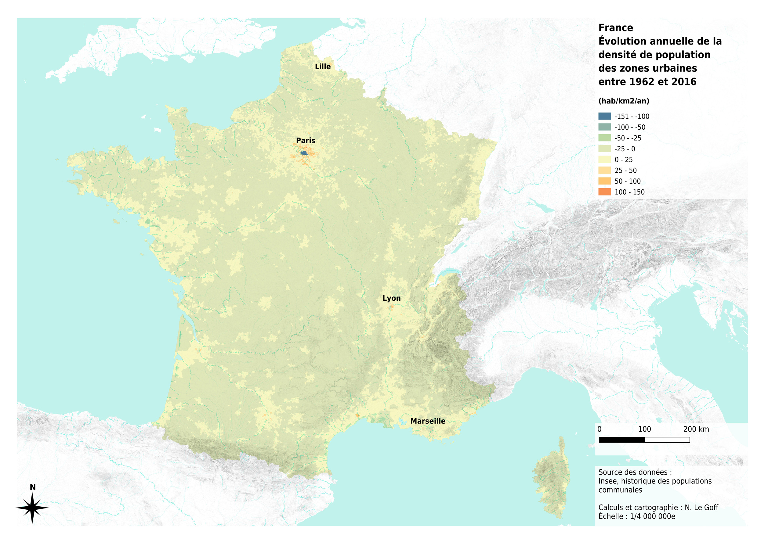 La carte représentant l’ensemble du territoire français montre l’ampleur de l’exode rural vers certains territoires urbains, le littoral, les régions industrielles et certaines vallées fluviales ou alpines. Les quatre plus grandes métropoles françaises connaissent des évolutions différentiées de leur densité de population.