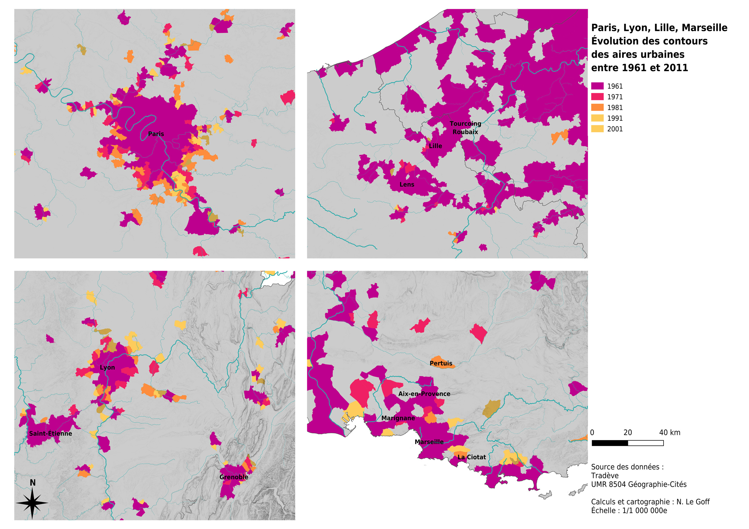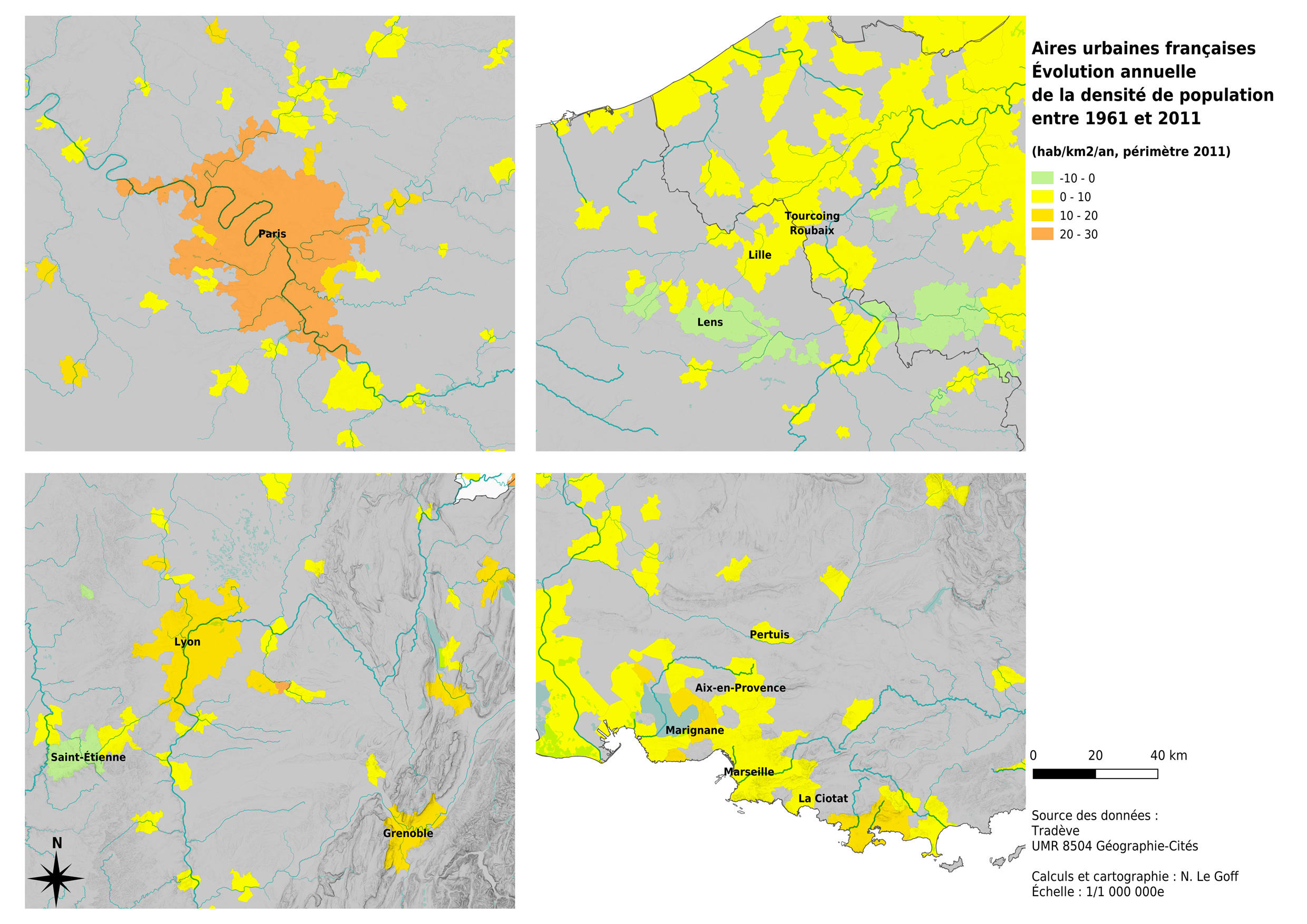 La base de données Tradève permet aussi de visualiser les évolutions différentielles des quatre unités urbaines françaises les plus peuplées en France à des dates proches de la série étudiée, soit entre 1961 et 2011.