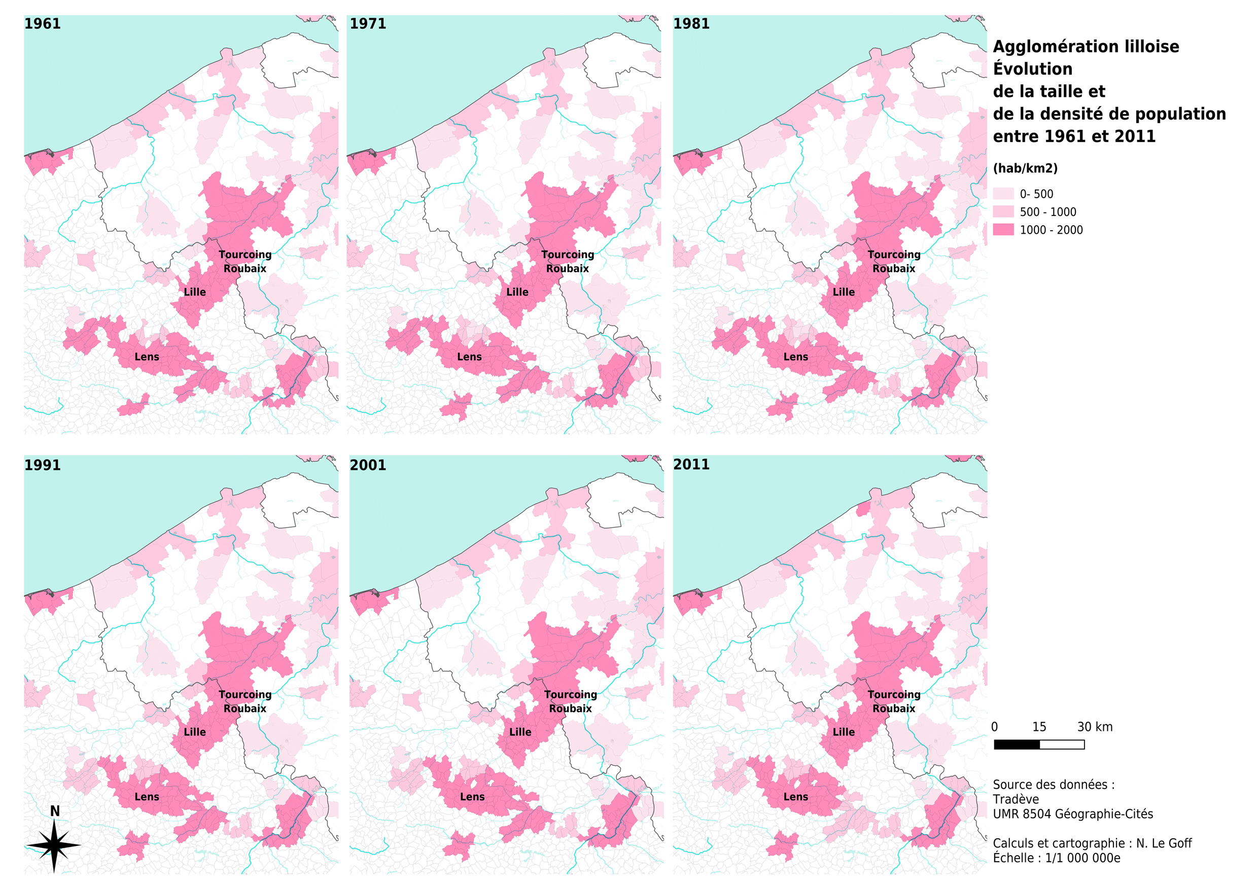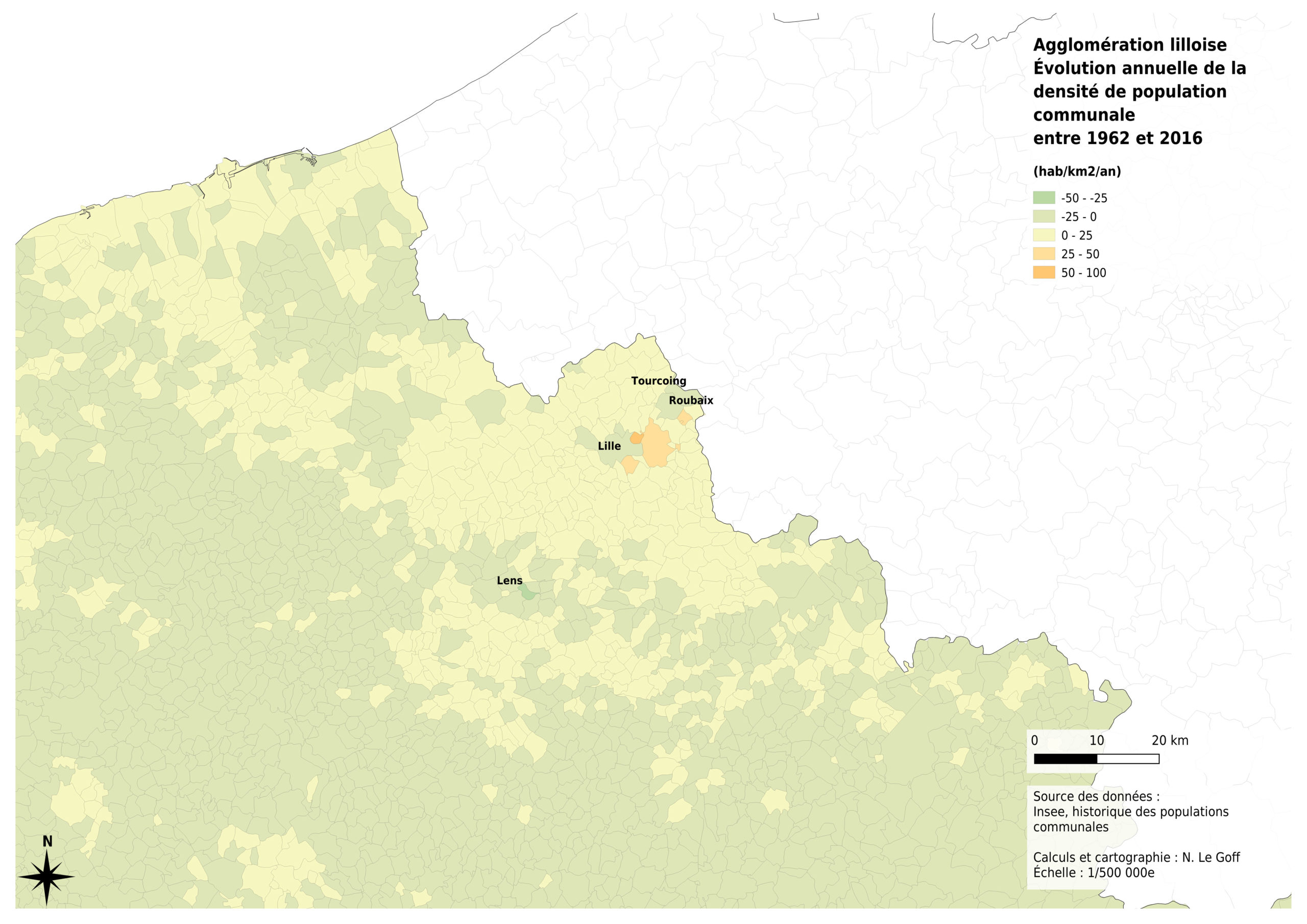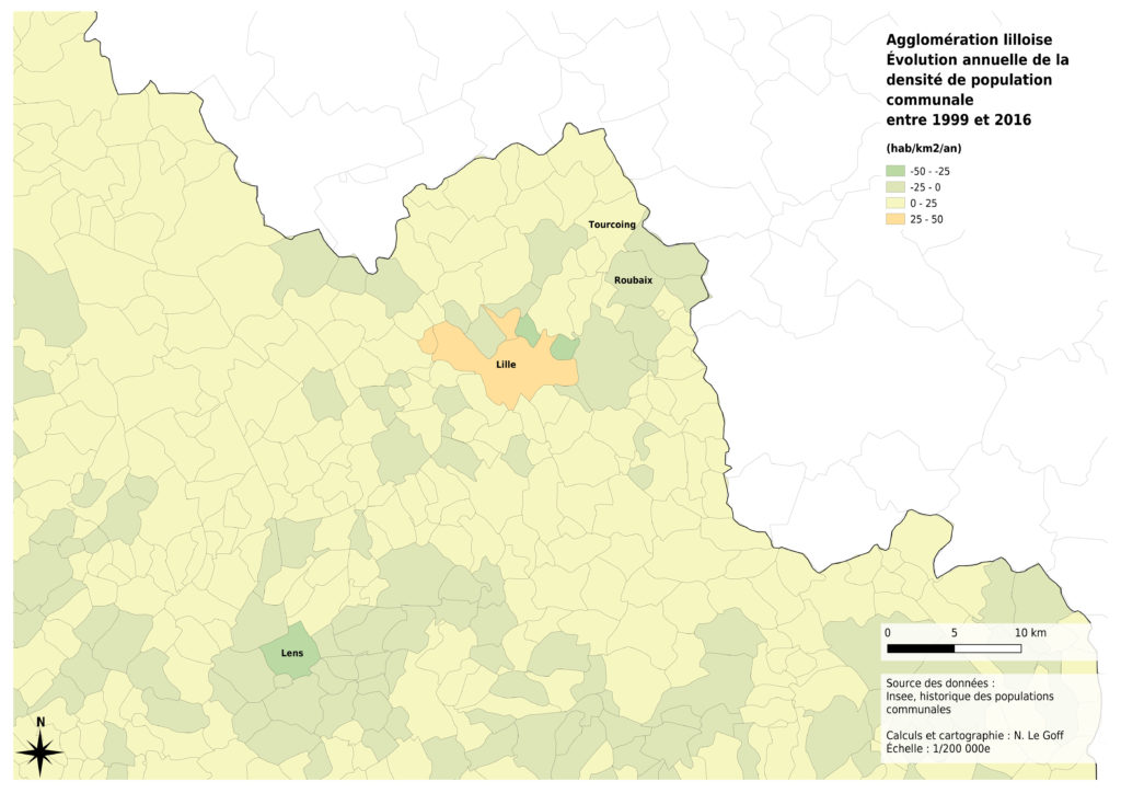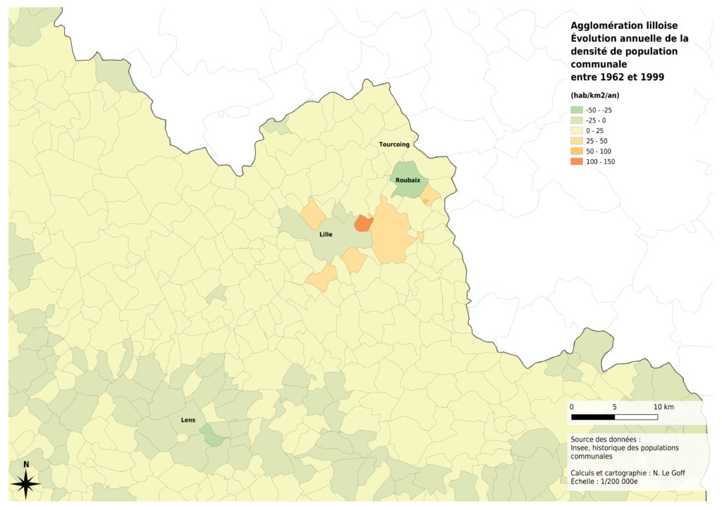 La cartographie confirme le mode de développement polycentrique de l’agglomération lilloise, en lien avec le sud de la Belgique, et le bassin minier de Lens. Les communes sont, le plus souvent, de petite taille, ce qui permet d’analyser assez finement les augmentations de leurs densités de population.