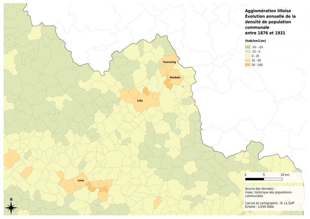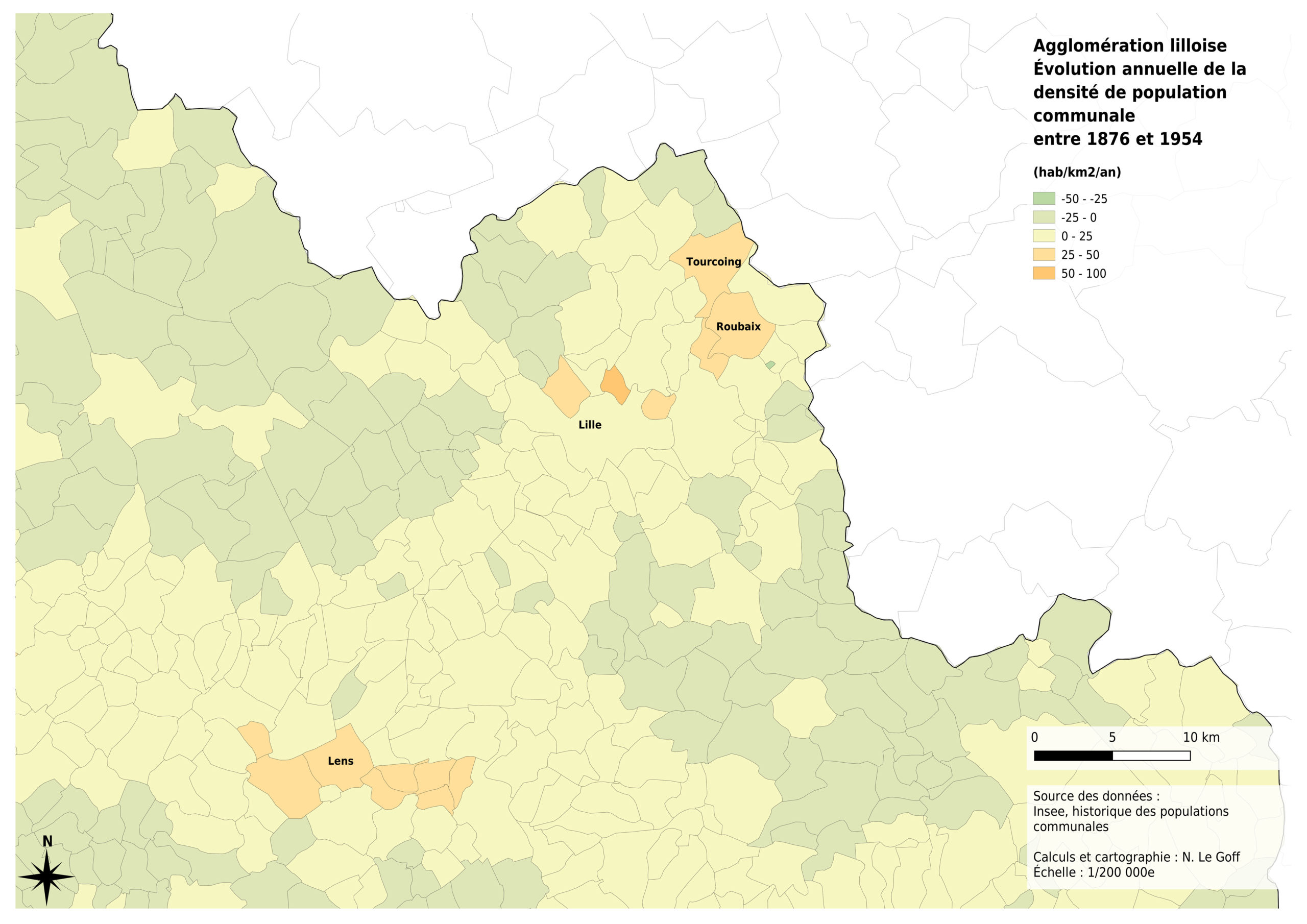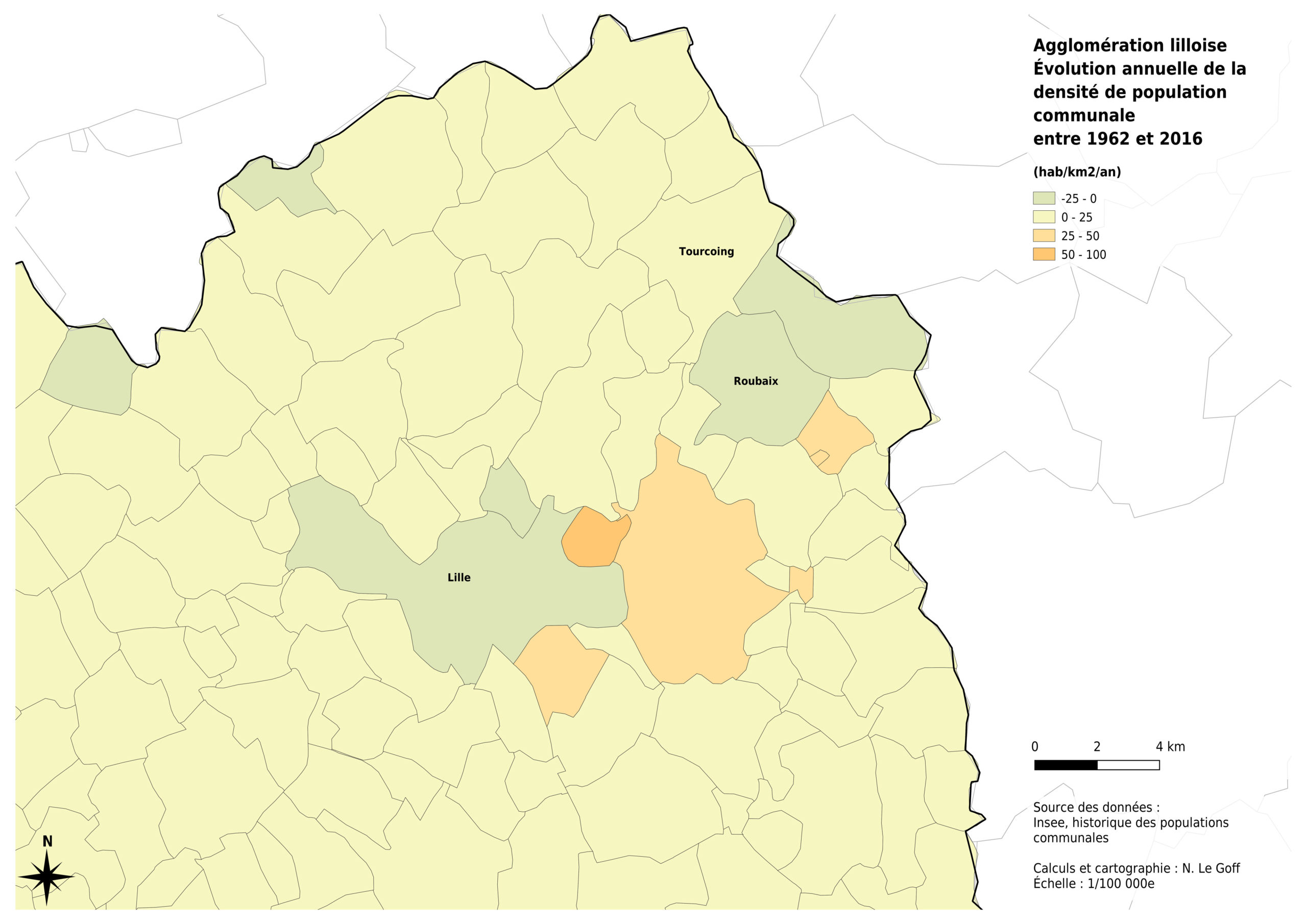 La cartographie confirme le mode de développement polycentrique de l’agglomération lilloise, en lien avec le sud de la Belgique, et le bassin minier de Lens. Les communes sont, le plus souvent, de petite taille, ce qui permet d’analyser assez finement les augmentations de leurs densités de population.