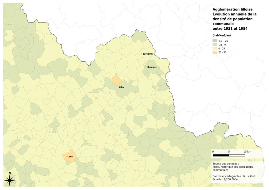 Dans l’agglomération lilloise, les communes à proximité de Roubaix (Croix, Lys-lez-Lannoy) voient aussi leur densité de population s’infléchir à partir de 1931.