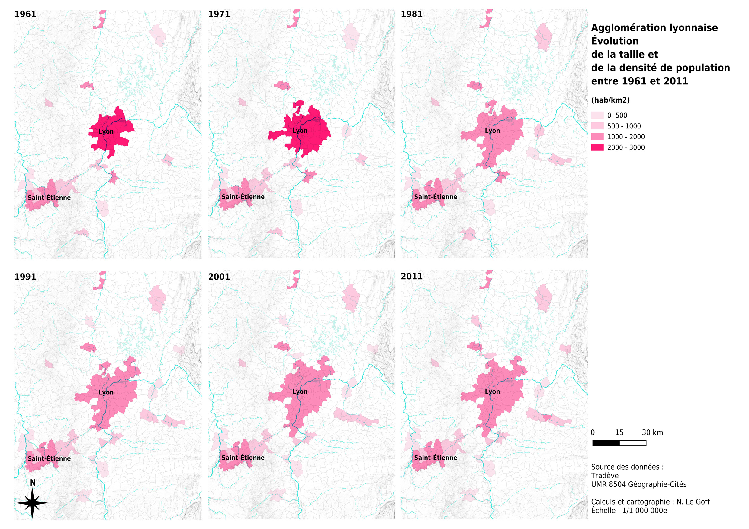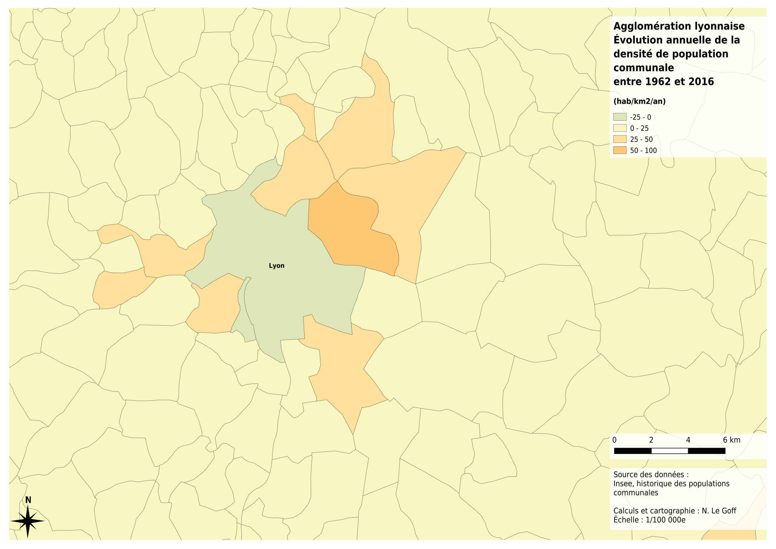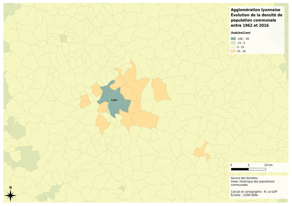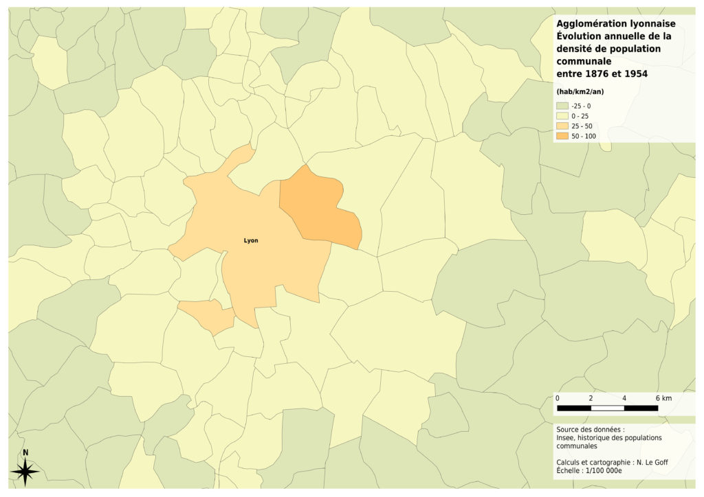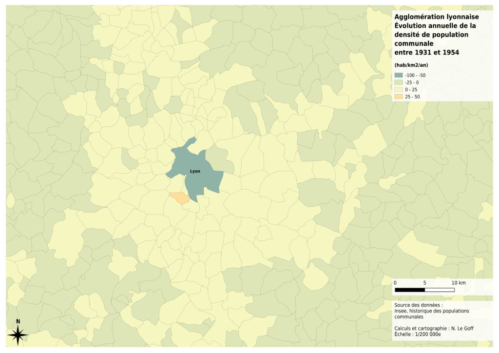 L’agglomération lyonnaise a un développement plutôt centralisé. En cela, il se rapproche du mode d’extension de la métropole parisienne, même si les densités de population et les tailles des agglomérations sont sans commune mesure. Il est cependant à comprendre en lien avec la densification progressive de la vallée du Rhône sur la même période. On le voit, Villeurbanne, bien moins dense que Lyon en début de période, est la commune qui connaît la plus forte augmentation annuelle de sa population jusqu’en 1954.