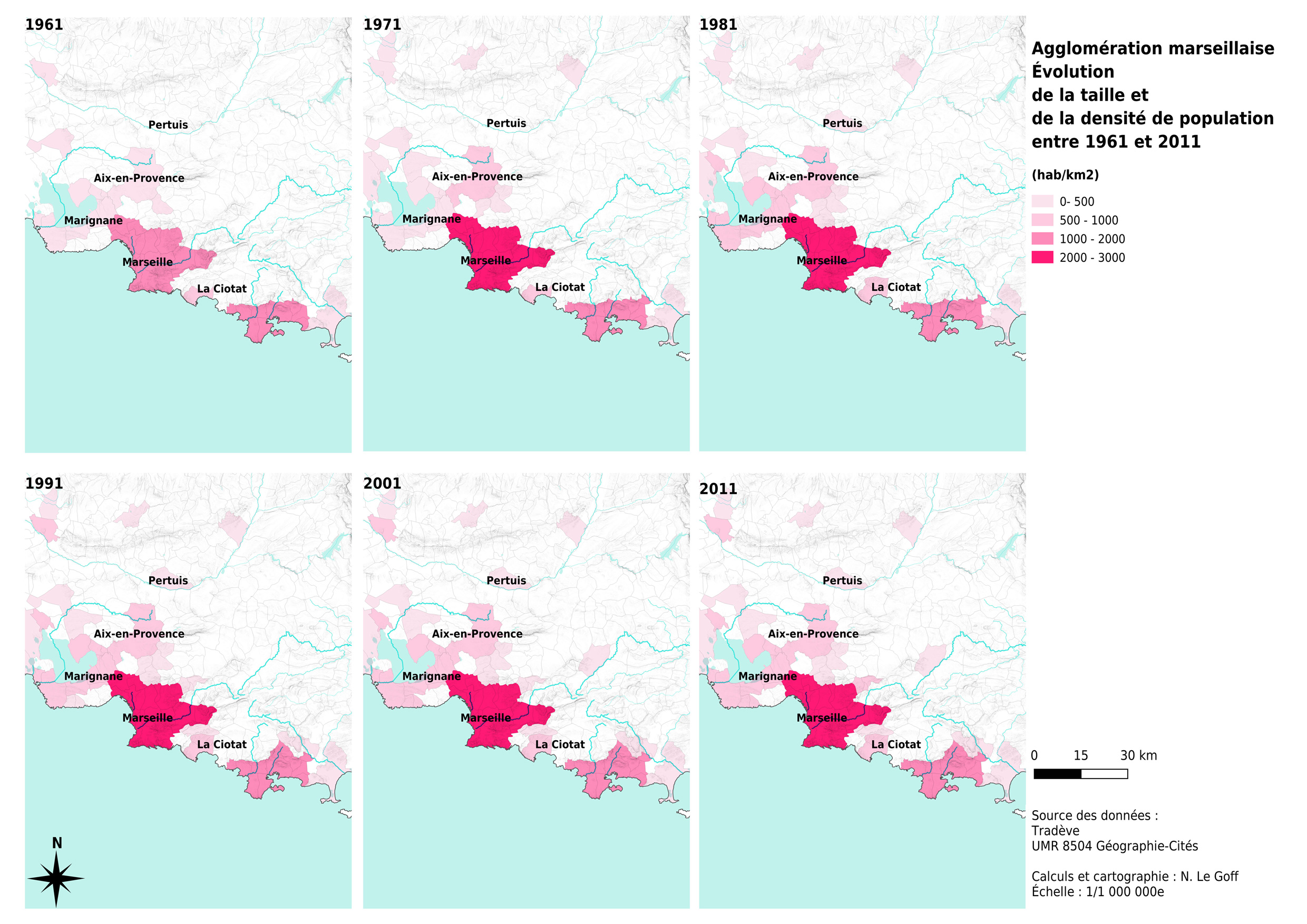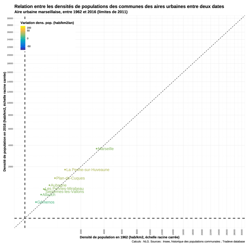 C’est principalement dans les années 1970 que les communes de Marseille et Aix-en-Provence voient leur densité de population augmenter. C’est ensuite Marignane et les communes situées entre ces trois villes qui se densifient, contribuant ainsi à la naissance d’une aire urbaine élargie.