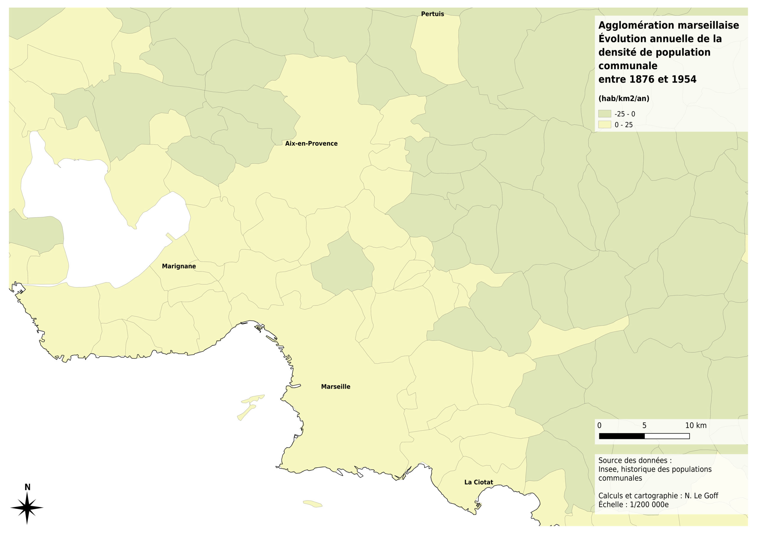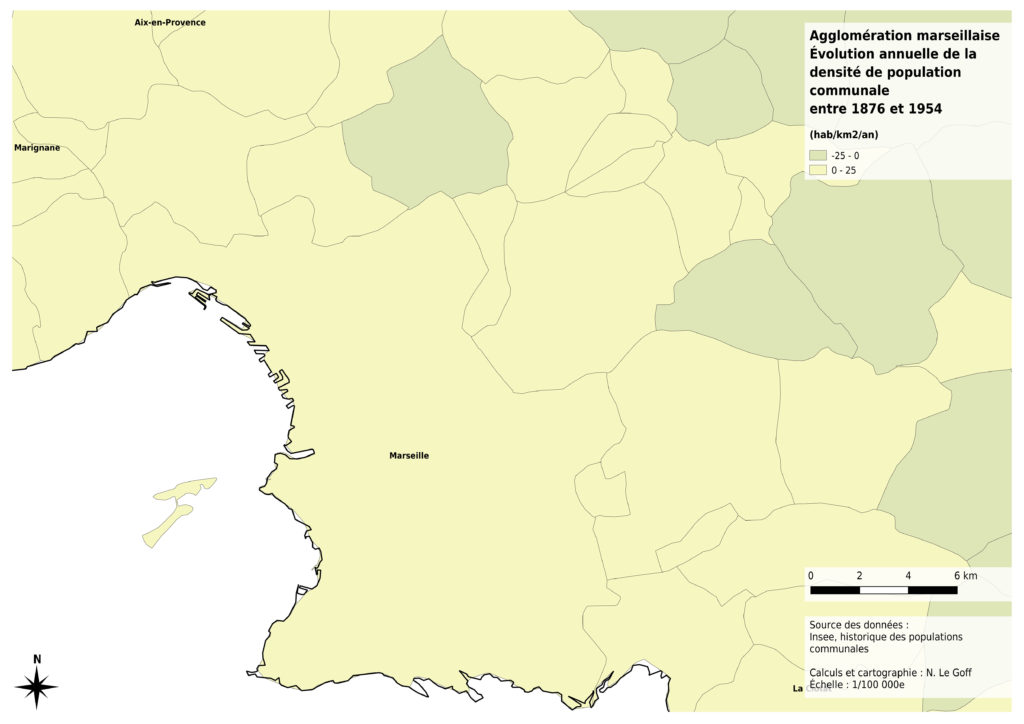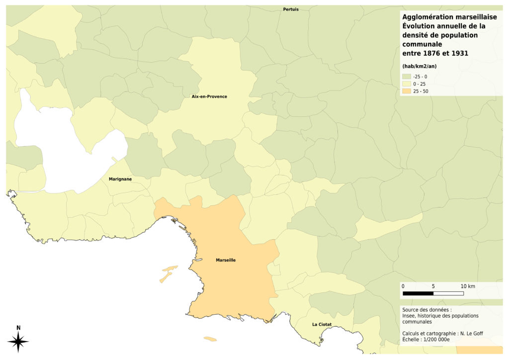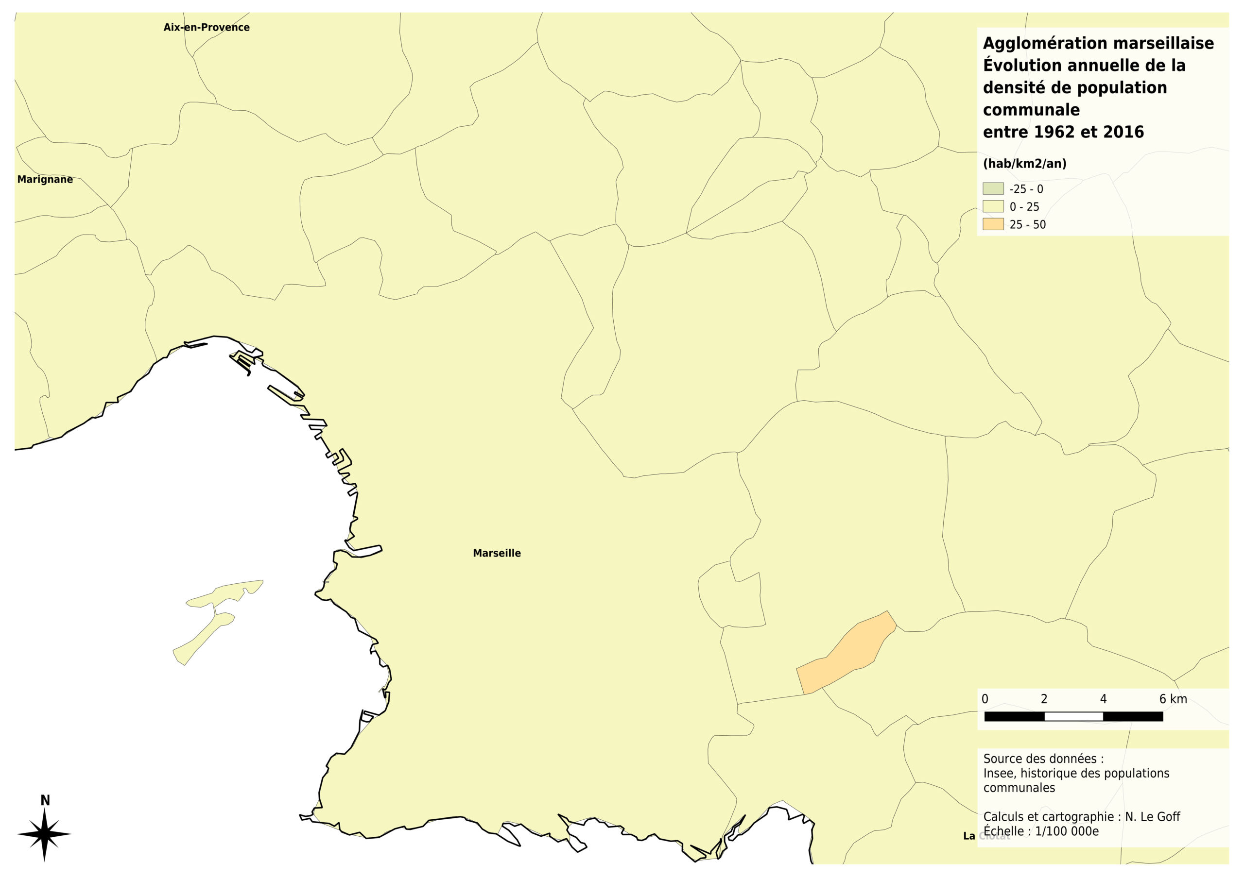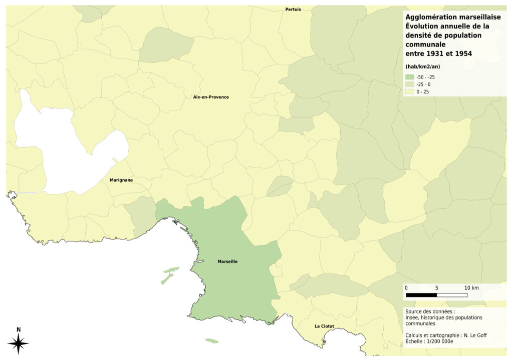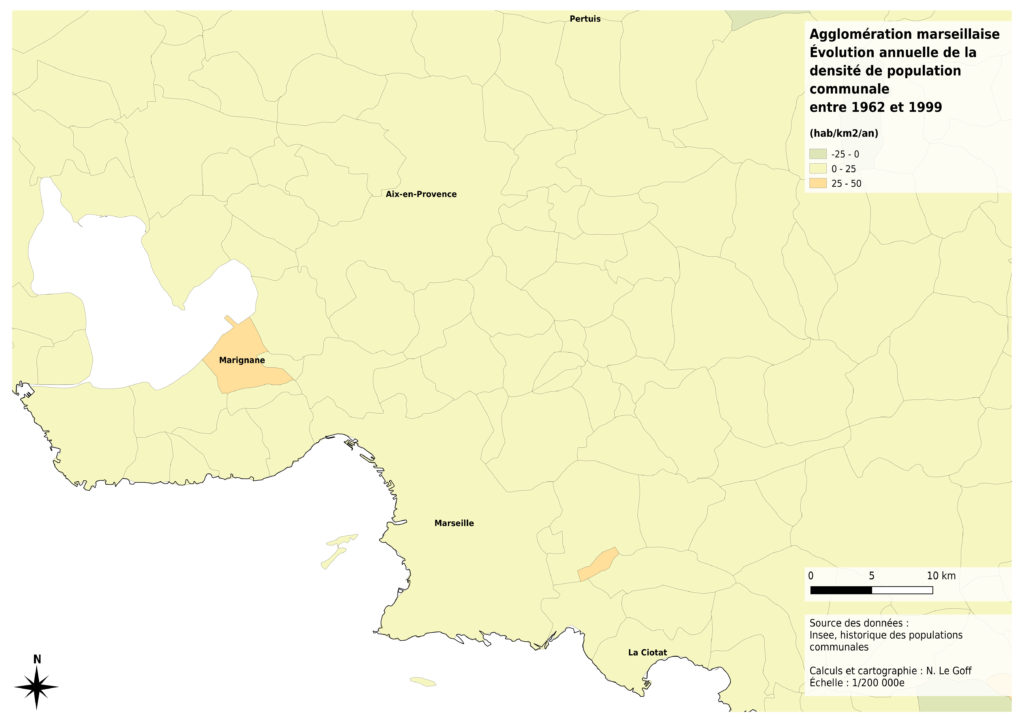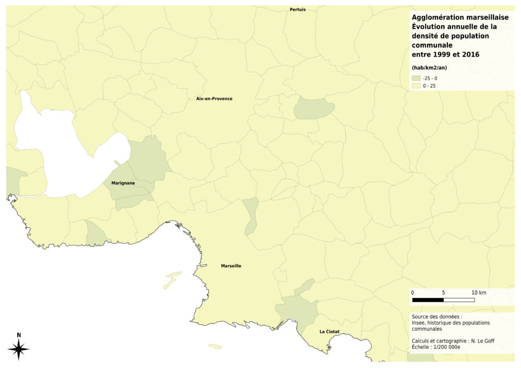 La commune de Marseille étant de surface plus importante que les autres communes centres, c’est elle qui absorbe entièrement cette baisse de la densité de population.