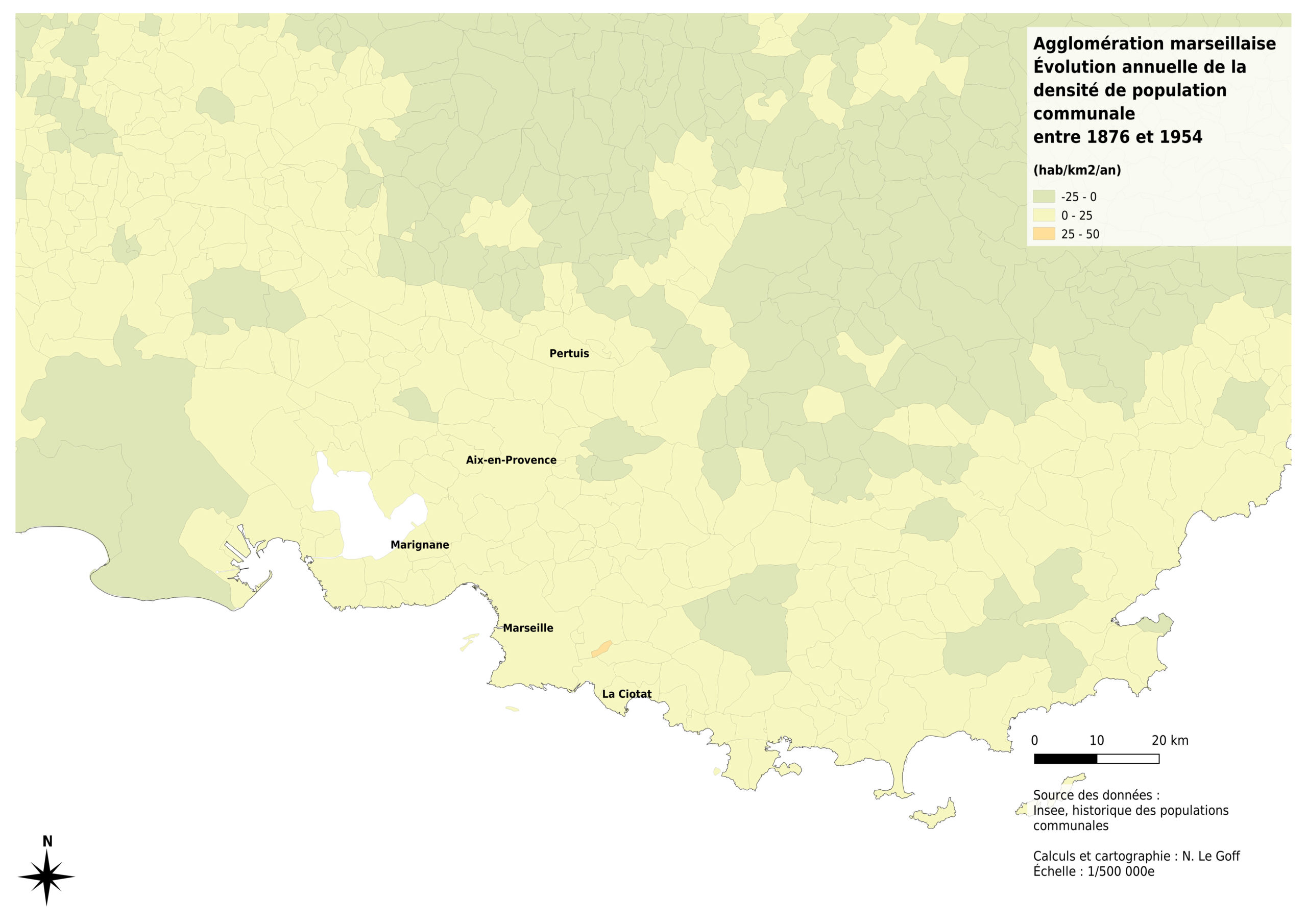 Entre 1876 et 1954, un petit nombre de communes se peuplent rapidement au détriment d’un grand nombre d’autres, au moins les trois-quart d’entre elles, qui voient leur population baisser. Le phénomène est particulièrement important entre 1876 et 1920, soit à la fin de la Première Guerre mondiale, dont l’impact démographique est aussi perceptible. Les effets de la Seconde Guerre mondiale sont difficilement observables et l’on ne dispose d’aucun recensement qui pourraient nous renseigner sur les dynamiques démographiques propres à cette période particulière.