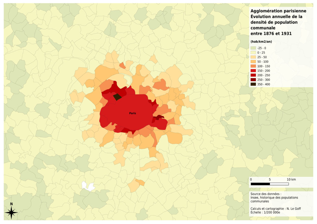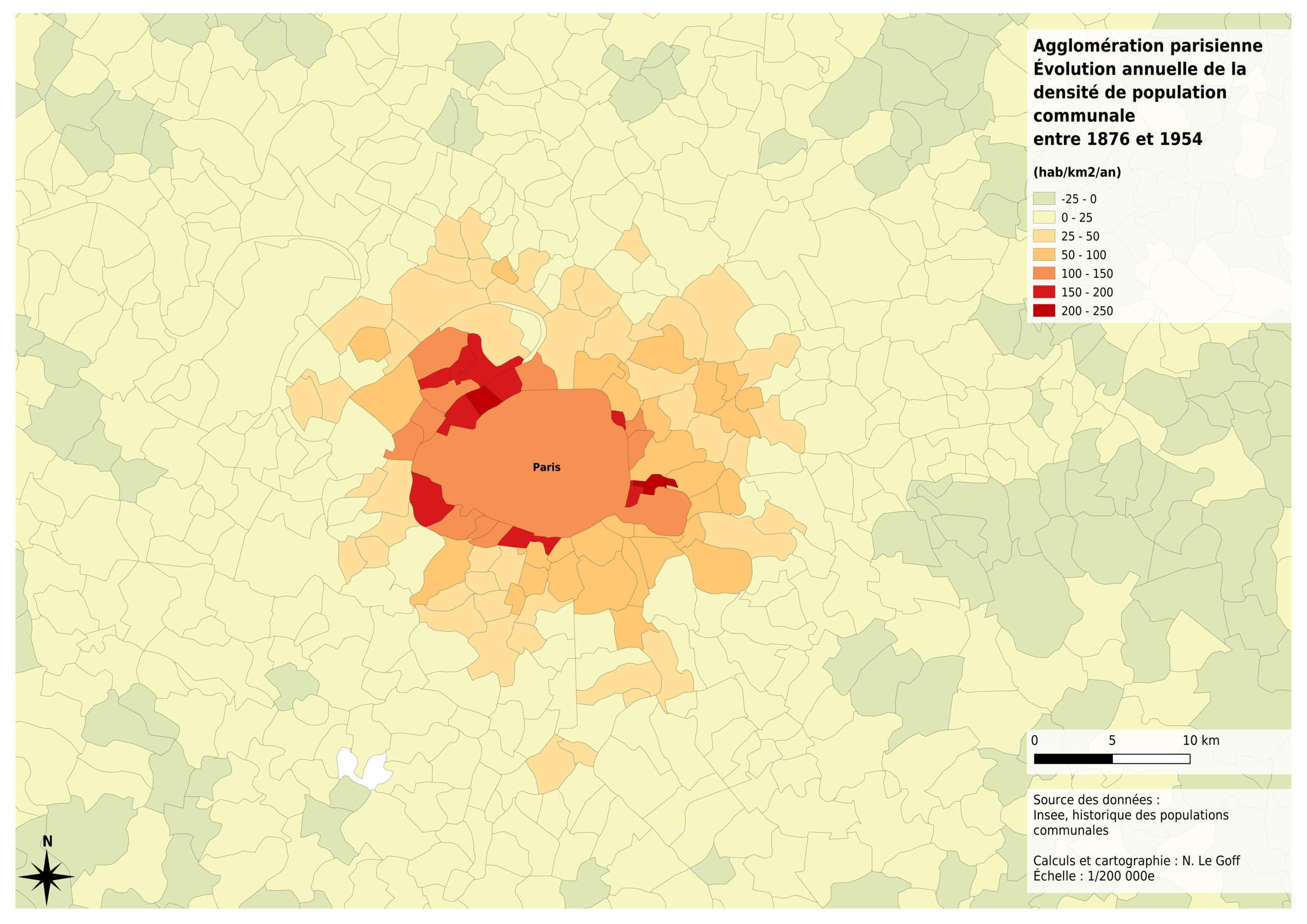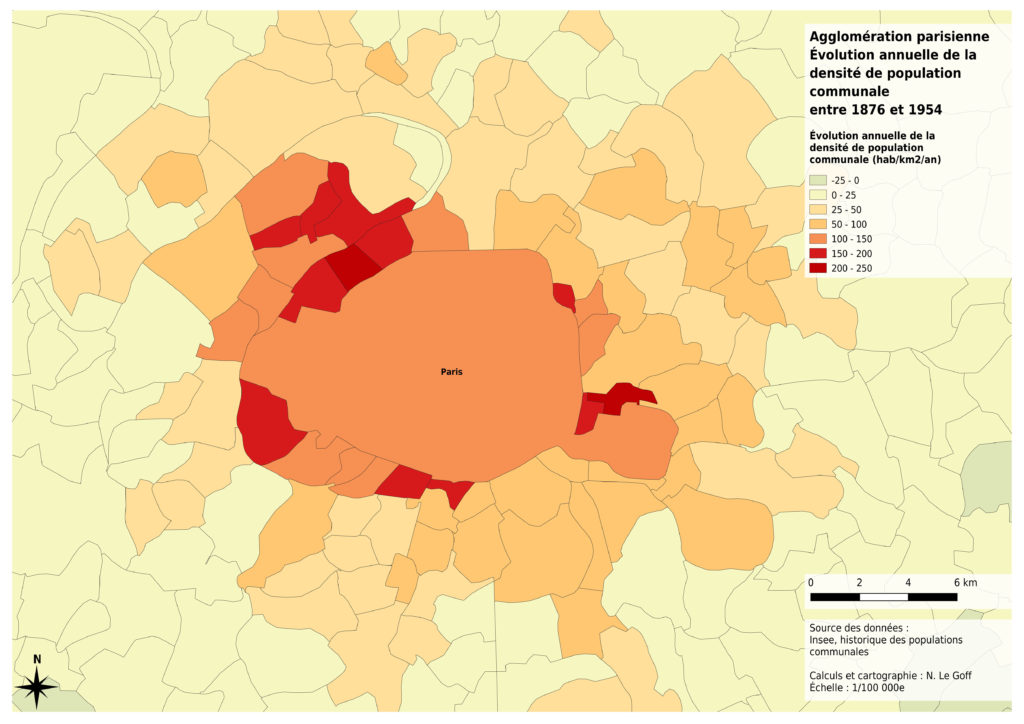 La distribution est relativement continue entre Paris, très densément peuplée et des communes beaucoup moins denses . Et le gradient de leur variation de densité annuelle de population montre que se produit sur entre 1876 et 1954 une différentiation très forte des densités communales au sein de cette aire urbaine.