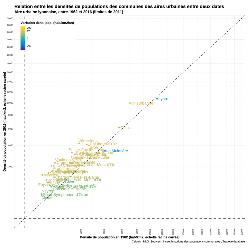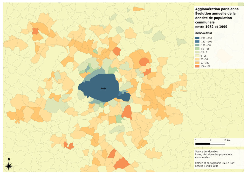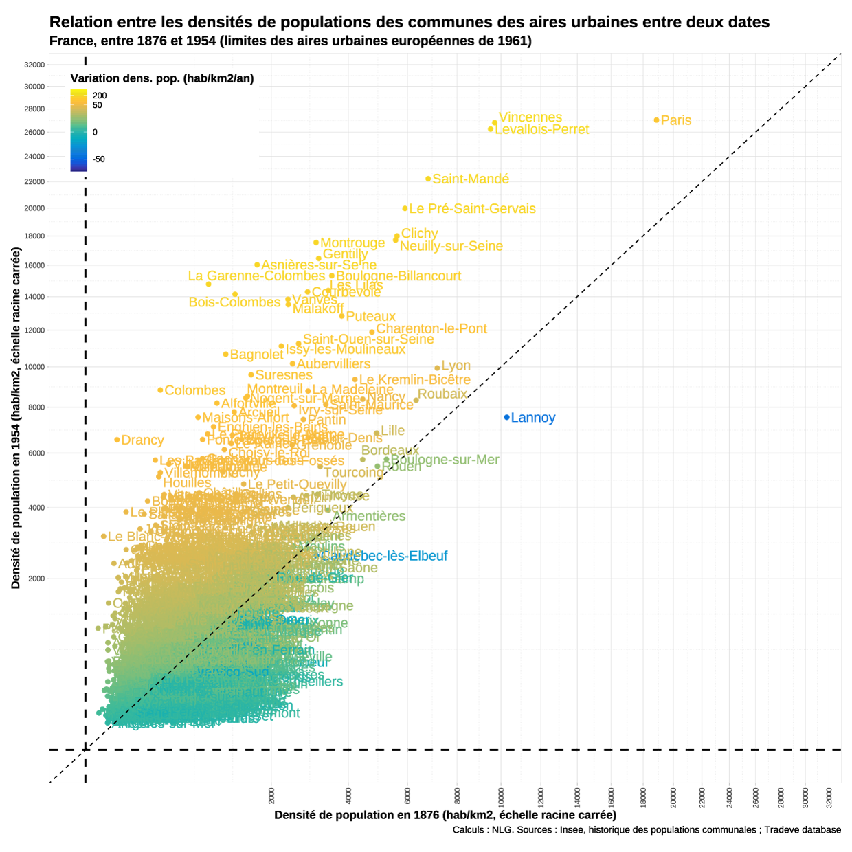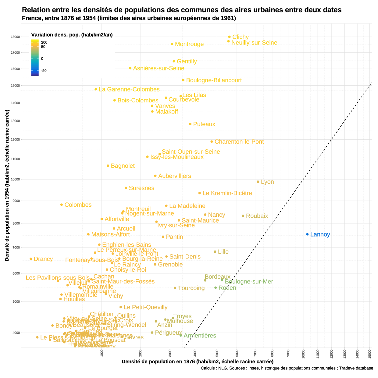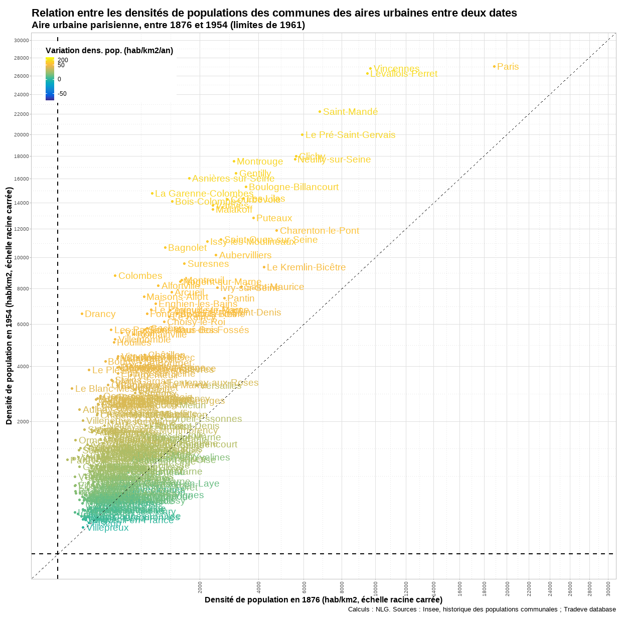 La visualisation des noms des communes dans la distribution des évolutions de densité de populations communales dans les unités urbaines met en évidence des phénomènes intéressants : la dynamique de grandes communes françaises est comparable à celle de certaines communes de la périphérie parisienne. Celles-ci sont d’ailleurs très majoritaires dans le haut de la distribution des densités en 1954. Certaines d’entre-elles connaissent aussi les plus haute augmentation de densité de population sur la période concernée. Il convient donc de distinguer les communes de l’aire urbaine parisienne des autres, afin de rendre les dynamiques plus lisibles.