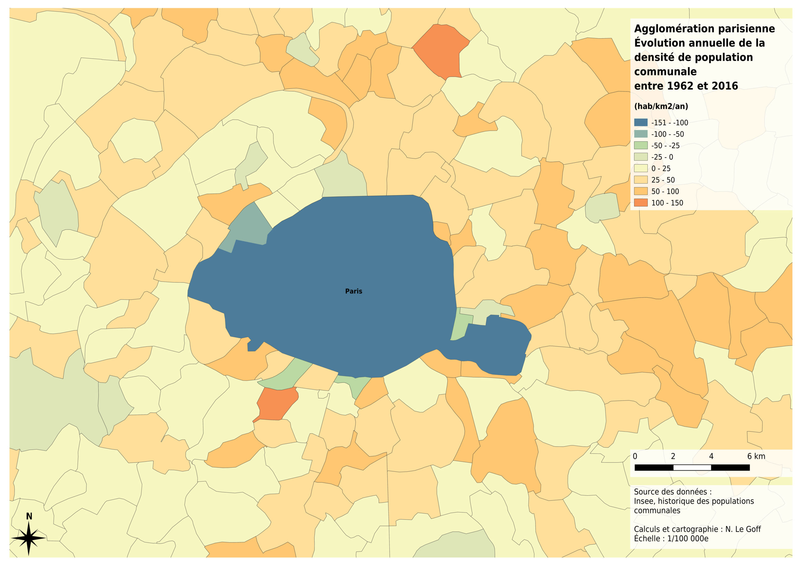 Les périodes considérées n’étant pas de même durée, nous avons aussi cartographié les évolutions annuelles des densités de populations afin de comparer ce qui est comparable.