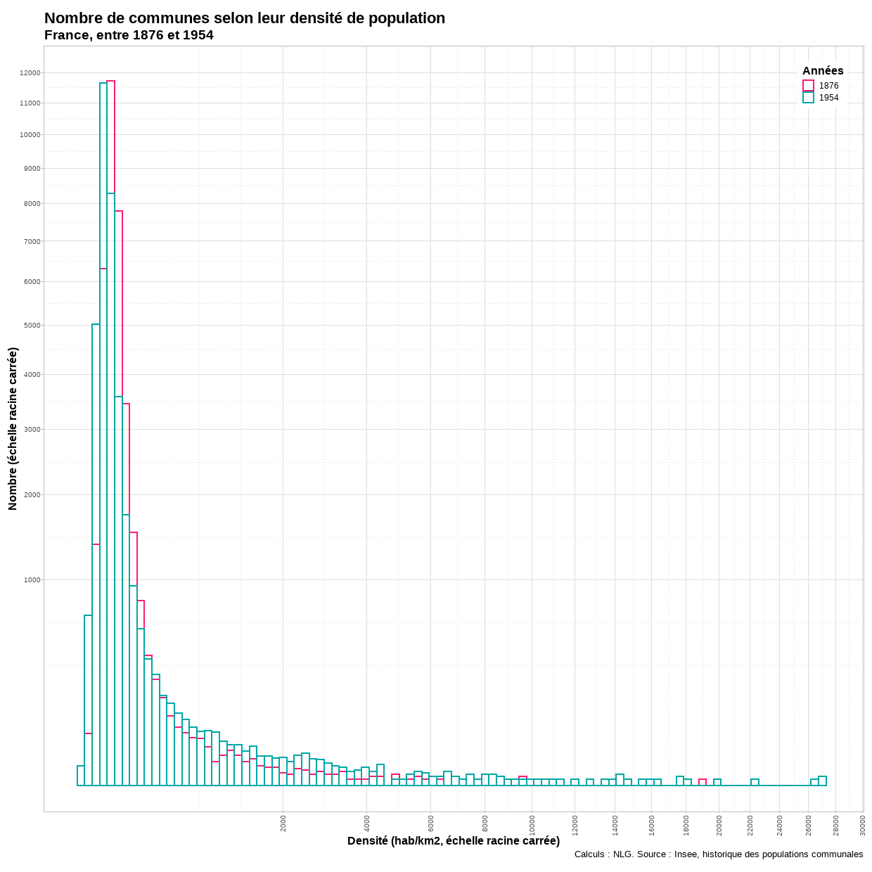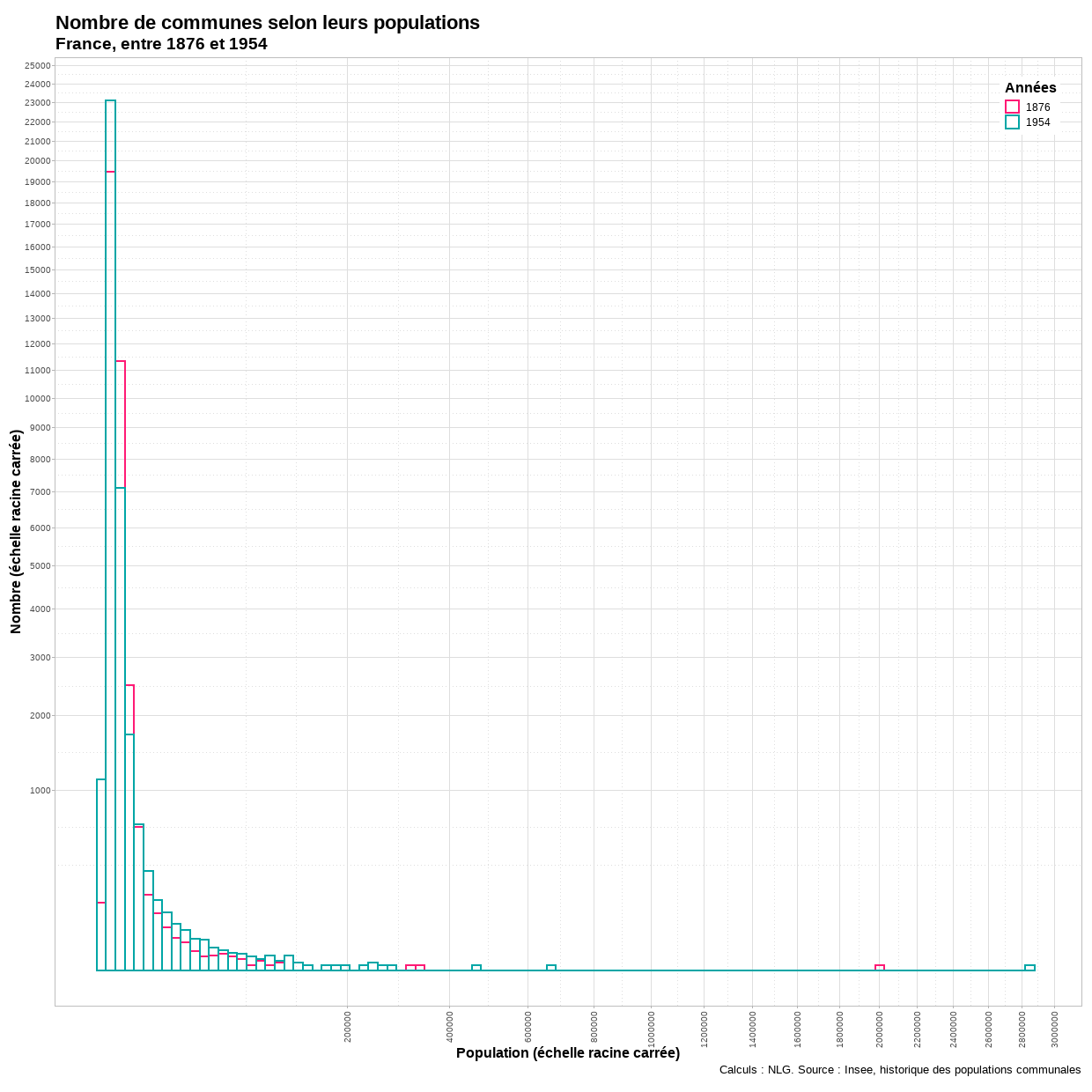 La distribution du nombre de communes en fonction de leur population suit globalement une courbe exponentielle décroissante. L’histogramme comparé de celle-ci entre 1876 et 1954 montre que le nombre de communes très peu peuplées, tout comme les communes moyennement peuplées, a augmenté durant la période.