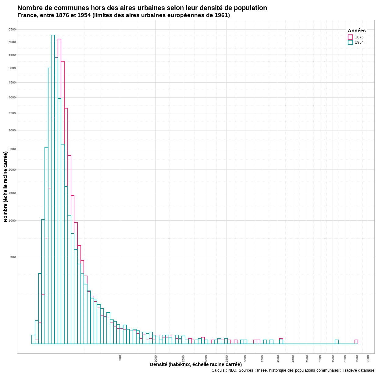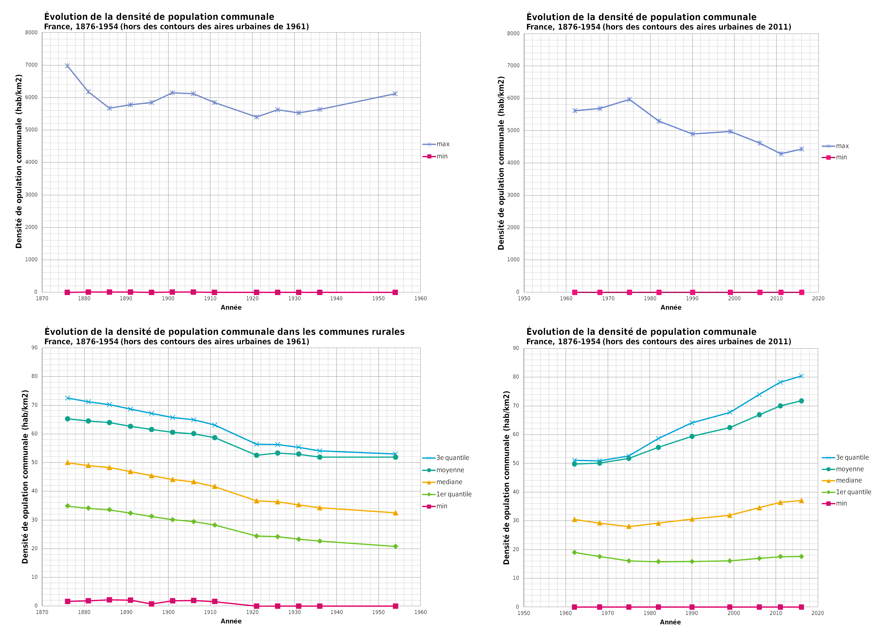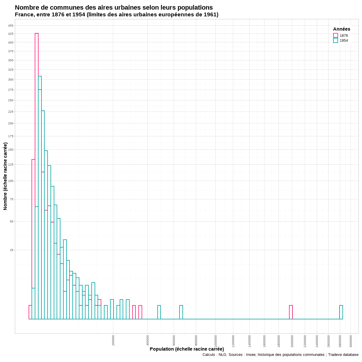 Par contre, les trois-quart des communes françaises qui appartiendront à une aire urbaine en 1954, présentent dès 1876 une densité de population plus importante (462 habitants par km2). Ce même groupe atteindra une densité de population de 1416 habitants au km2 en 1954.