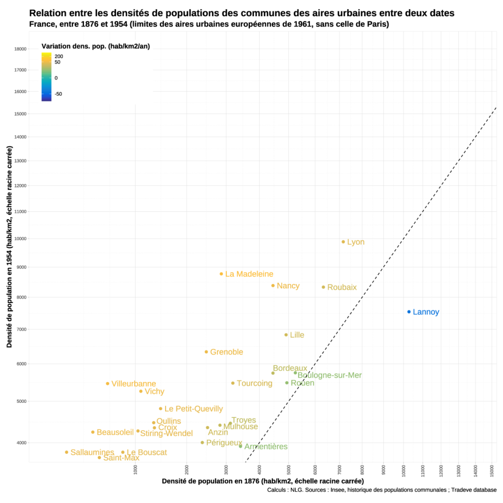 Lyon, qui était deuxième en 1876, arrive en première position en 1954 dans ce groupe. On compte aussi Nancy, Lille, Roubaix et Tourcoing, Bordeaux, Grenoble, Vichy ou Boulogne-sur-Mer parmi les communes les plus denses, suivies par Troyes, Mulhouse, Périgueux puis Lens. Mais l’augmentation de leur densité varie selon leur situation initiale.