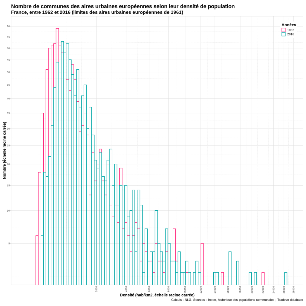 Ainsi, entre 1962 et 2016, la densité de population est en forte augmentation pour au moins un quart des communes, dont la population en 1962 est comprise entre 360 et 770 habitants en début de période, pour finir entre 450 et 1420 habitants en fin de période. Il faudrait analyser s’il y a là une indication d’un nouveau mode d’urbanisation.