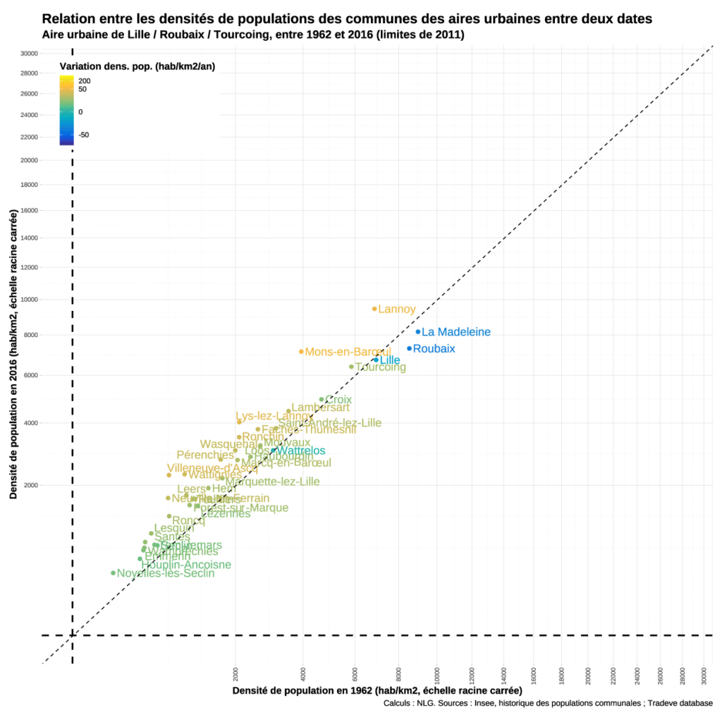 La métropole du Nord apparaît d’emblée comme polycentrique puisque la densité de Roubaix est suivie de celle Lille et de Tourcoing. La Madeleine, comme Lannoy, ont des superficies très petites qui exacerbent les phénomènes d’augmentation ou de baisse de leur densité de population. Croix, près de Roubaix, Mons-en-Baroeul et Lambersart à côté de Lille, ou Mouvaux, vers Tourcoing, bénéficient du dynamisme de leurs voisines.