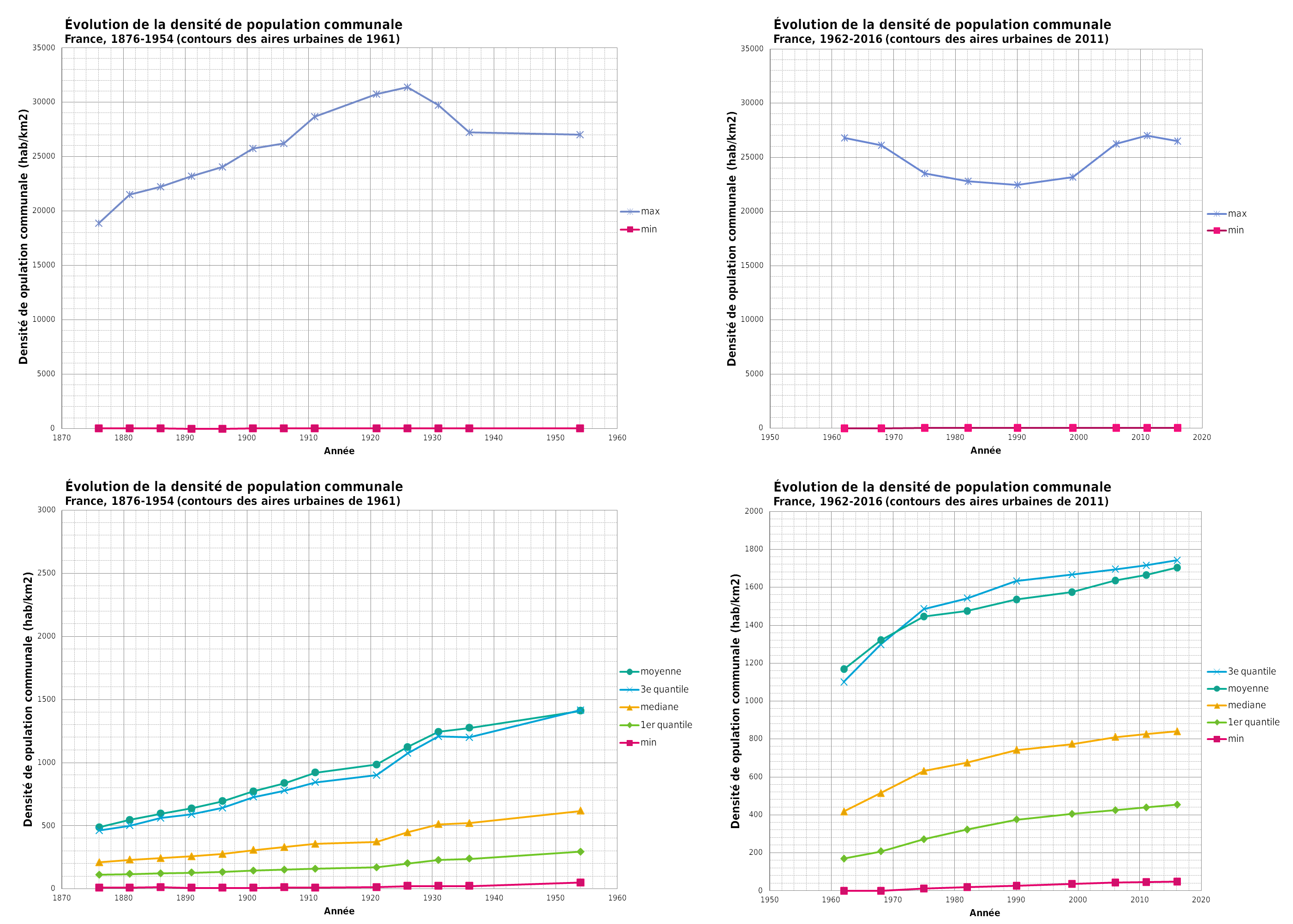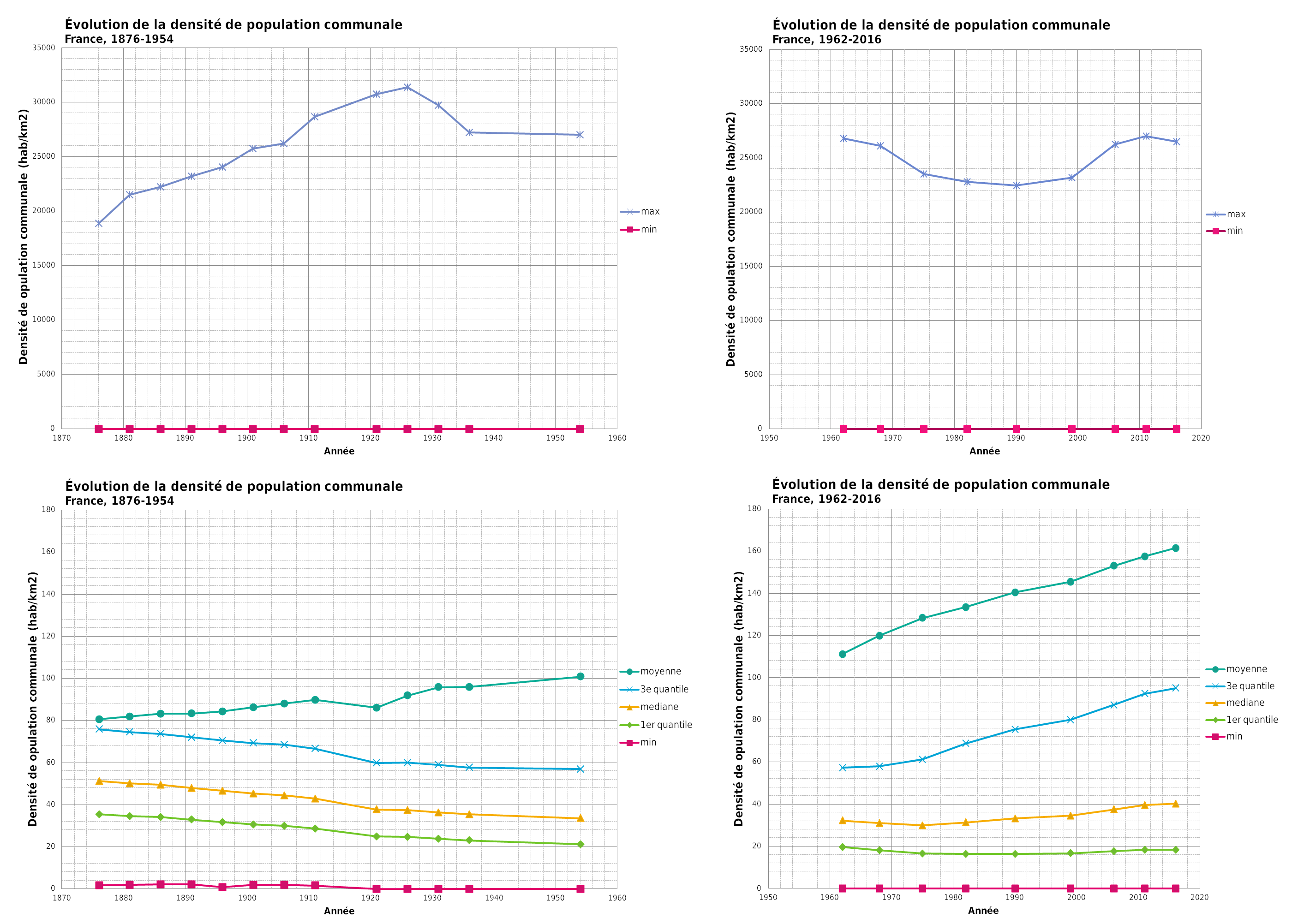 Tout d’abord, l’historique des populations communales de 1876 à 2016 de l’Insee, permet d’appréhender à la fois les augmentations des populations et des densités de populations communales sur la longue durée en France. Il s’agit d’une série discontinue puisqu’elle est issue de recensements qui ont été réalisés différemment de 1876 à 1954 d’une part, et de 1962 à 2016 d’autre part. Plus précisément, la deuxième série n’est pas rigoureusement continue puisque des modifications marginales ont été introduites en 2006. L’Insee indique par ailleurs que « Les statistiques sont proposées dans la géographie communale en vigueur au 01/01/2020 pour la France hors Mayotte, afin que leurs comparaisons dans le temps se fassent sur un champ géographique stable. »
