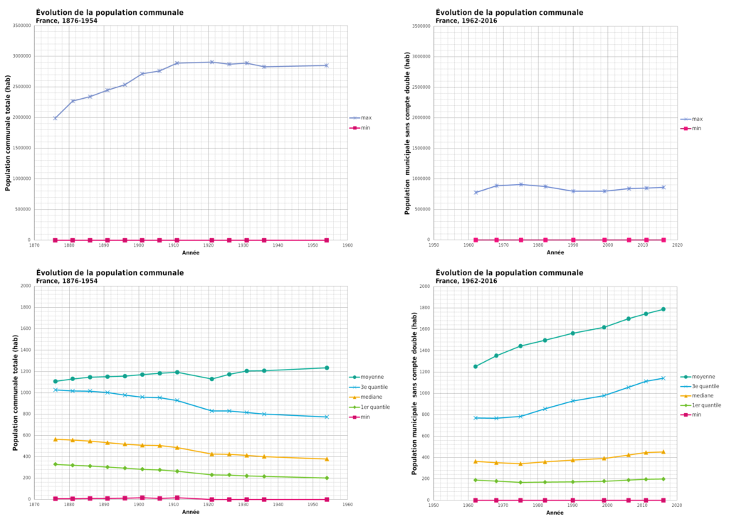 La série 1962-2016 permet de mettre en évidence deux phénomènes : d’une part une tendance à l’augmentation de la population de Paris jusqu’en 1975, avant qu’elle ne reflue puis ne se stabilise; d’autre part une augmentation de la moyenne des populations communales françaises, qui semble tirée par des communes les plus peuplées en dehors de Paris. La population des communes du troisième quartile augmente fortement et dans le même temps, celles du premier quartile ont une démographie stagnante, tandis que la population des communes du deuxième quartile n’augmente que légèrement.