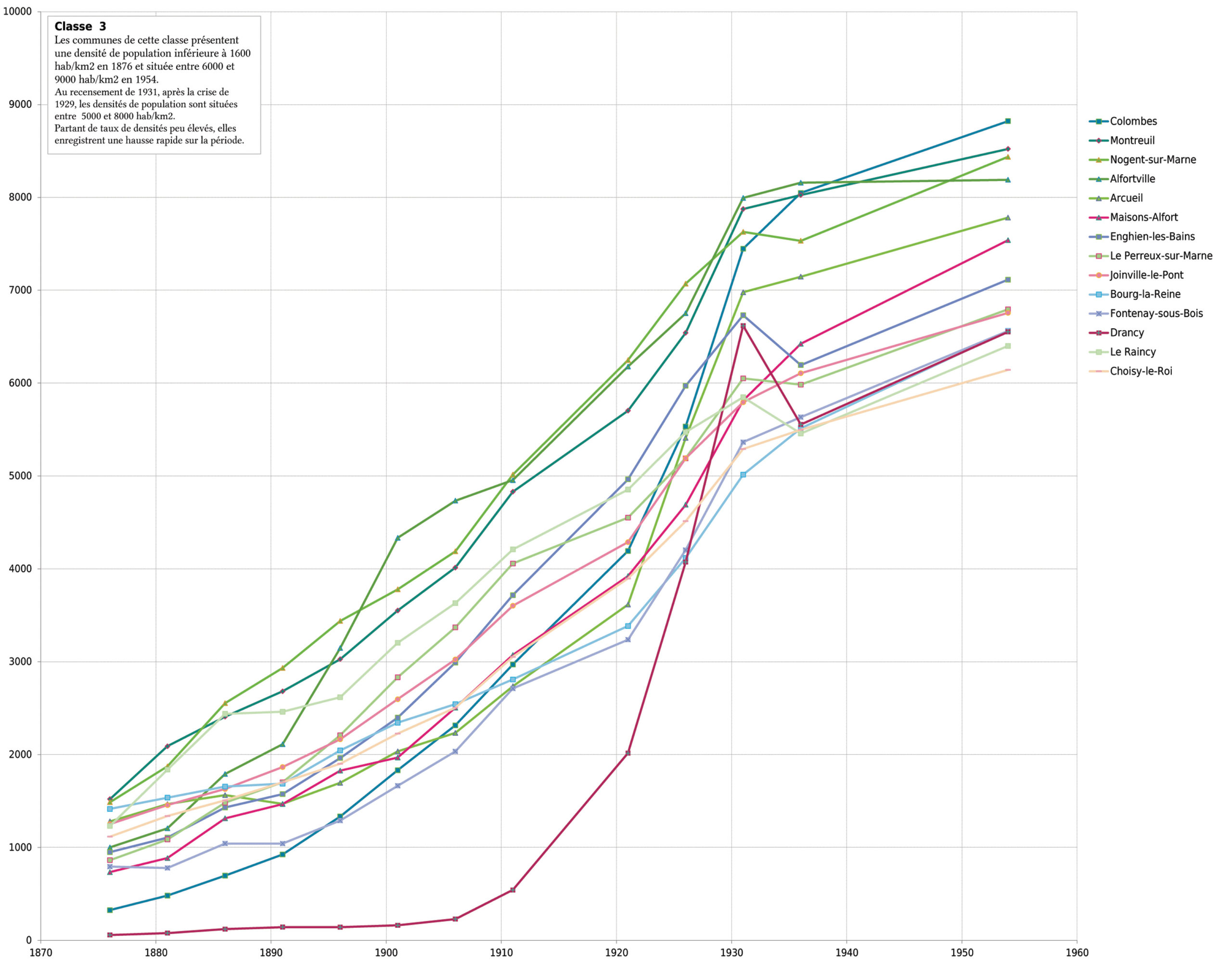C’est en réalité une géographie des banlieues au fort développement économique durant cette période qui se dessine parmi les communes dont l’augmentation de la densité est la plus forte entre 1876 et 1954 pour dépasser les 4000 habitants au km2 en fin de période. Mais ce raisonnement peut être poursuivi, dans une moindre mesure si l’on descend dans la distribution des densités de population en 1954.